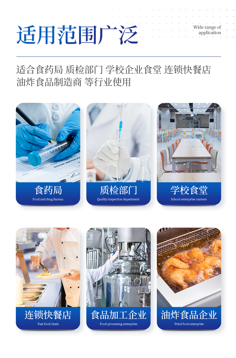 廣泛應(yīng)用于質(zhì)量監(jiān)督檢驗、工商管理、油炸食品生產(chǎn)基地、食藥監(jiān)局、衛(wèi)生部門、肉制品食品深加工企業(yè)、商場超市、各大食品安全監(jiān)測系統(tǒng)等單位使用。