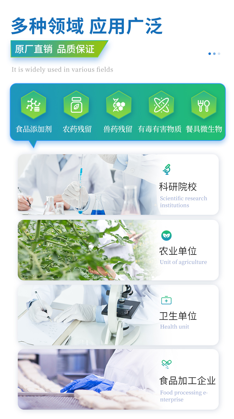 山東天研儀器有限公司生產(chǎn)的高智能食品安全檢測(cè)儀為集成化食品安全快速檢測(cè)分析設(shè)備,采用臺(tái)式一體化設(shè)計(jì),可快速檢測(cè)200多種食品安全項(xiàng)目,包含非食用化學(xué)物質(zhì)、濫用食品添加劑、農(nóng)藥殘留、獸藥殘留、重金屬、病害肉、營(yíng)養(yǎng)強(qiáng)化劑、抗生素類殘留、激素類殘留、真菌毒素類殘留、化學(xué)類殘留等項(xiàng)目的定性定量檢測(cè)。目前廣泛應(yīng)用于市場(chǎng)監(jiān)管局、檢測(cè)中心、衛(wèi)生監(jiān)督部門、農(nóng)業(yè)部門、院校及各單位食堂、食品肉產(chǎn)品深加工企業(yè)、商超市場(chǎng)、司法部門、餐飲機(jī)構(gòu)、養(yǎng)殖場(chǎng)、屠宰場(chǎng)、檢驗(yàn)檢疫部門等單位。