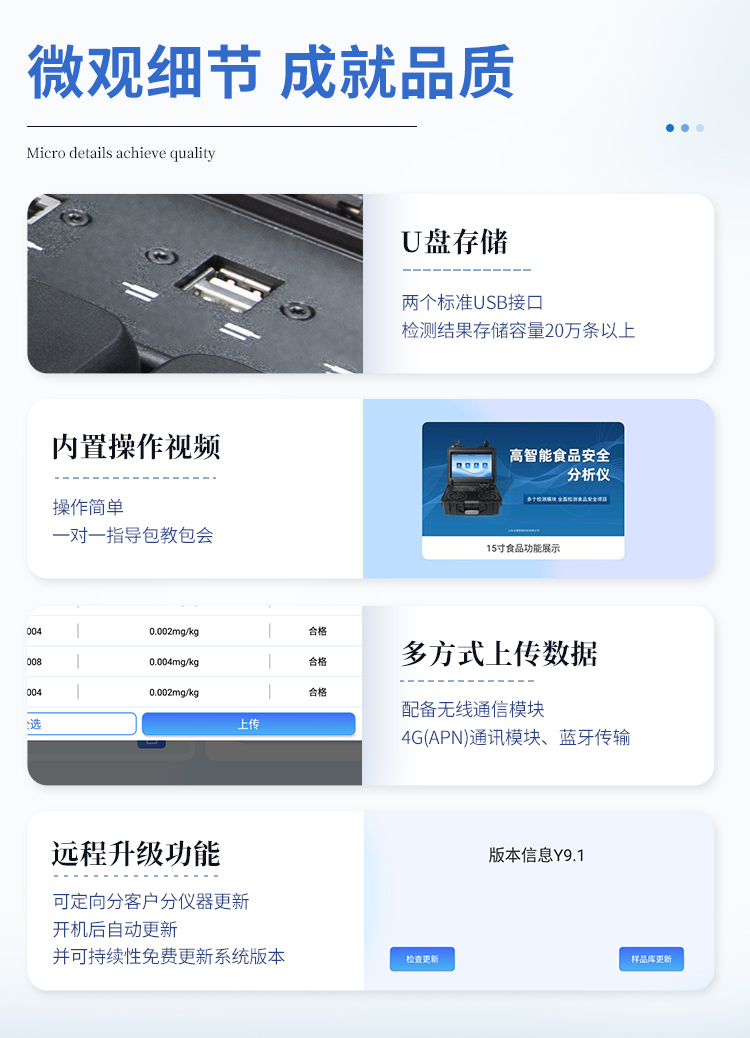 | 儀器采用臺(tái)式一體化系統(tǒng)檢測(cè)技術(shù),將分光光度模塊、膠體金檢測(cè)模塊、新型農(nóng)殘檢測(cè)模塊、數(shù)字化管理模塊、無(wú)線通訊模塊高度集成于一體,支持檢測(cè)200種食品安全檢測(cè)項(xiàng)目,同時(shí)預(yù)留升級(jí)檢測(cè)方法。 | 儀器檢測(cè)模塊標(biāo)準(zhǔn)化、智能化,可隨意自由組合。檢測(cè)箱體內(nèi)置多個(gè)標(biāo)準(zhǔn)檢測(cè)單元,檢測(cè)模塊可以調(diào)整配置。 | 儀器采用全新安卓智能系統(tǒng),主控芯片采用 ARM Cortex-A7,RK3288/4核處理器,10.1寸高清液晶觸摸豎屏,更加**的UI交互界面,運(yùn)轉(zhuǎn)快捷;儀器配備無(wú)線通信模塊: 4G(APN)通訊模塊、Wifi模塊,藍(lán)牙傳輸,同時(shí)具有雙USB接口以及RJ45接口能以多種方式實(shí)現(xiàn)數(shù)據(jù)保存和數(shù)據(jù)傳輸功能。 | 創(chuàng)新檢測(cè)模式★檢測(cè)通道:≥12通道;采用精密旋轉(zhuǎn)比色池設(shè)計(jì),使用同芯片同光源校準(zhǔn)精度,解決不同光源之間的誤差值。1-12通道間誤差0.1%。(**號(hào):ZL202022821055.2) ★儀器具有自動(dòng)識(shí)別比色皿檢測(cè)功能,即:將樣品比色皿放入儀器后,點(diǎn)擊樣品檢測(cè),儀器自動(dòng)識(shí)別比色皿進(jìn)行通道檢測(cè)。 | 進(jìn)口高精光源:高精度進(jìn)口四波長(zhǎng)冷光源,通道配置 410、520、590、630nm 波長(zhǎng)光源,一個(gè)光源芯片驅(qū)動(dòng)一個(gè)光源,誤差極小,每臺(tái)設(shè)備單獨(dú)**校準(zhǔn)光源,**比對(duì),同時(shí)參照四種不同波段光源全方位覆蓋市面上99%的農(nóng)殘食品項(xiàng)目檢測(cè)。 | 膠體金模塊檢測(cè)方式:★采用COMS實(shí)時(shí)成像技術(shù),可采集多個(gè)畫面,支持2個(gè)金標(biāo)同時(shí)讀卡,通過(guò)不同顏色的灰度變化,一秒精準(zhǔn)得出結(jié)果。 | 智能操作分析系統(tǒng): | ★便捷操作系統(tǒng):設(shè)備檢測(cè)時(shí)可在同一檢測(cè)界面自動(dòng)對(duì)應(yīng)相關(guān)檢測(cè)通道一次性選擇1-12個(gè)樣品名稱,無(wú)須退出界面,節(jié)省操作時(shí)間。(需提供對(duì)應(yīng)證明) | ★數(shù)據(jù)集成系統(tǒng):設(shè)備首頁(yè)自動(dòng)統(tǒng)計(jì)檢測(cè)數(shù)據(jù)包含:周檢測(cè)數(shù)據(jù)、月檢測(cè)數(shù)據(jù),全部檢測(cè)總數(shù)量,均包含檢測(cè)總數(shù),合格數(shù),不合格數(shù),以及相關(guān)柱形分析圖,對(duì)各項(xiàng)檢測(cè)數(shù)據(jù)清晰掌握,無(wú)需電腦查詢,更加快捷直觀。(需提供對(duì)應(yīng)證明文件) | ★項(xiàng)目預(yù)設(shè)系統(tǒng):支持添加單個(gè)及多個(gè)相同或不相同的任務(wù)預(yù)設(shè),一鍵快速調(diào)取,每一個(gè)任務(wù)分別可以設(shè)置不同的樣品、批次、編號(hào)、來(lái)源、備注、抽樣信息、檢測(cè)信息、受檢信息、復(fù)核信息等更多信息。無(wú)縫鏈接平臺(tái)和APP實(shí)時(shí)查看下發(fā)任務(wù)。(需提供對(duì)應(yīng)證明文件) | ★數(shù)據(jù)監(jiān)管系統(tǒng):同步對(duì)接監(jiān)管平臺(tái),數(shù)據(jù)可局域網(wǎng)和互聯(lián)網(wǎng)數(shù)據(jù)上傳,檢測(cè)結(jié)果可選擇直接傳至食品安全監(jiān)管平臺(tái)。集成OSS輸出存儲(chǔ)服務(wù)、區(qū)分設(shè)備定向管理應(yīng)用,進(jìn)行區(qū)域食品安全監(jiān)管及大數(shù)據(jù)分析處理與數(shù)據(jù)統(tǒng)計(jì),檢測(cè)區(qū)域食品安全長(zhǎng)短期動(dòng)態(tài),達(dá)到食品安全問(wèn)題預(yù)估、預(yù)警。(需提供對(duì)應(yīng)食品理化分析系統(tǒng)計(jì)算機(jī)軟件著作權(quán))。 | ★ 自定義打印系統(tǒng):內(nèi)置全新打印系統(tǒng),新創(chuàng)自定義打印方式,可按需靈活設(shè)置開(kāi)啟或關(guān)閉:產(chǎn)品合格證(國(guó)家農(nóng)業(yè)部標(biāo)準(zhǔn)要求),二維碼,抽樣信息、檢測(cè)信息,受檢信息、復(fù)核信息、抽樣日期、檢測(cè)日期等信息的打印。(需提供對(duì)應(yīng)證明) | ★系統(tǒng)遠(yuǎn)程更新功能:可定向分客戶分儀器更新系統(tǒng),按照不同客戶后期實(shí)際需求添加項(xiàng)目,無(wú)需機(jī)器返廠,即可遠(yuǎn)程實(shí)時(shí)升級(jí)全新系統(tǒng),節(jié)省時(shí)間成本及避免運(yùn)輸造成設(shè)備損壞。 | 儀器主機(jī)采用一體化防水、抗壓、防撞擊、防腐蝕箱體設(shè)計(jì),同時(shí)配備交直流供電,可連接車載電源,可選配大容量充電鋰電池,滿足現(xiàn)場(chǎng)野外檢測(cè)需求。 | 安全證書(shū),放心保障:儀器具有中國(guó)計(jì)量科學(xué)研究院校準(zhǔn)證書(shū),**認(rèn)證。 |