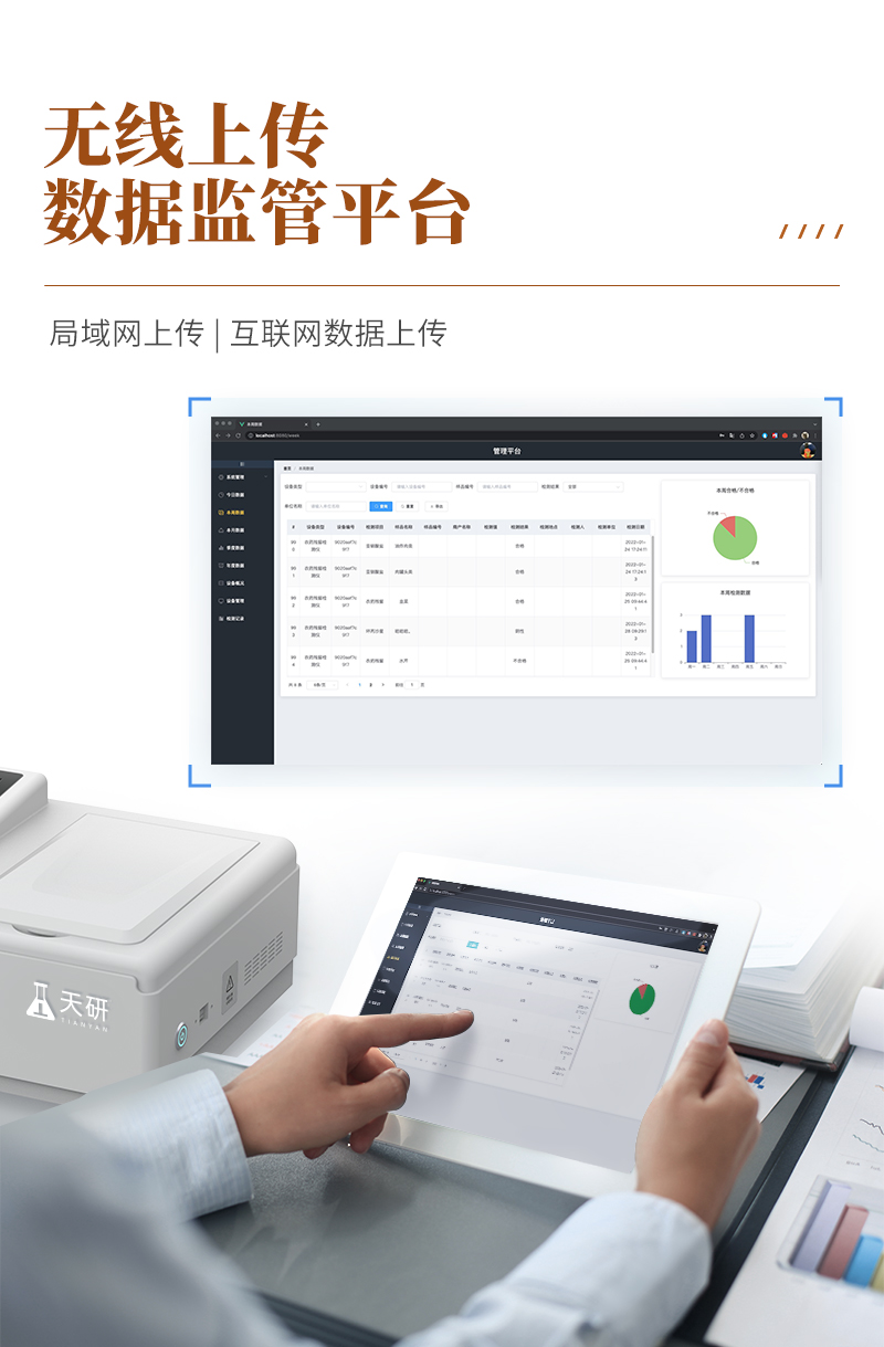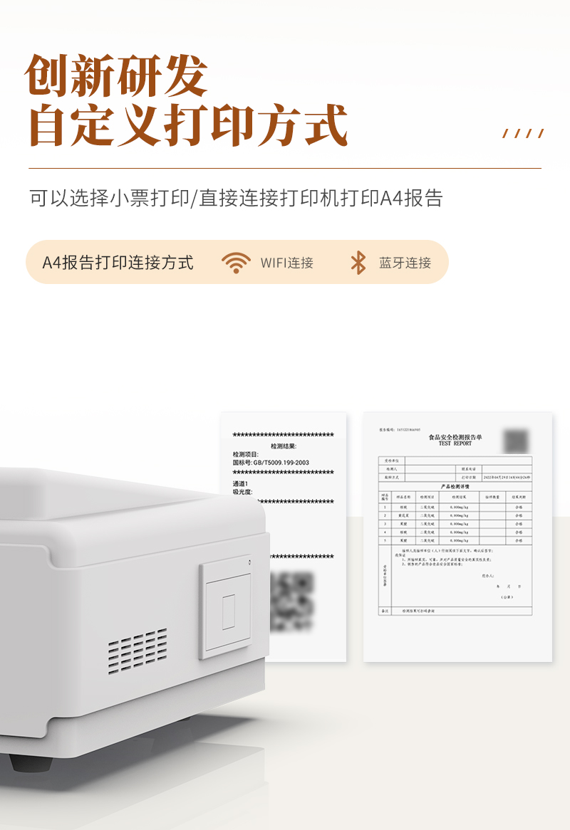 | 儀器采用臺(tái)式一體化系統(tǒng)檢測(cè)技術(shù),將分光光度模塊、數(shù)字化管理模塊、無(wú)線通訊模塊高度集成于一體,支持檢測(cè)200種食品安全檢測(cè)項(xiàng)目,同時(shí)預(yù)留升級(jí)檢測(cè)方法。 | 儀器檢測(cè)模塊標(biāo)準(zhǔn)化、智能化,檢測(cè)項(xiàng)目可隨意自由組合。檢測(cè)箱體內(nèi)置多個(gè)標(biāo)準(zhǔn)檢測(cè)單元,檢測(cè)模塊可以調(diào)整配置。 | 顯示屏幕:儀器采用10.1英寸豎向液晶觸摸屏顯,搭配運(yùn)行安卓智能操作系統(tǒng),主控芯片采用ARM Cortex-A7,RK3288/4核處理器,主頻1.88Ghz,操作方便,性能更強(qiáng)。 | 檢測(cè)通道:≥12通道;采用精密旋轉(zhuǎn)比色池設(shè)計(jì),使用同芯片同光源校準(zhǔn)精度,解決不同光源之間的誤差值,更加準(zhǔn)確**。(1-12通道間誤差0.1%,**號(hào):ZL202022821055.2) | 儀器光源:高精度進(jìn)口四波長(zhǎng)冷光源,每個(gè)通道均配置 410、520、590、630nm 波長(zhǎng)光源,標(biāo)配**的光路切換裝置,**光路切換功能可實(shí)現(xiàn)64波長(zhǎng),并且所有檢測(cè)項(xiàng)目可實(shí)現(xiàn)所有通道同時(shí)檢測(cè)。 | 設(shè)備可一鍵校準(zhǔn),自動(dòng)保存校準(zhǔn)數(shù)據(jù),自動(dòng)對(duì)比校驗(yàn),得到精準(zhǔn)光源,采用Android SP存儲(chǔ)數(shù)據(jù),光源數(shù)據(jù)永不丟失,方便每一次使用。 | 通訊接口:配備無(wú)線通信模塊、可選配4G(APN)通訊模塊和藍(lán)牙傳輸,同時(shí)具有雙USB接口以及RJ45網(wǎng)線接口,可以多方式實(shí)現(xiàn)數(shù)據(jù)保存及數(shù)據(jù)傳輸。 | 存儲(chǔ)方式:支持U盤(pán)存儲(chǔ),標(biāo)準(zhǔn)USB接口,免驅(qū)動(dòng)安裝。檢測(cè)結(jié)果存儲(chǔ)容量20萬(wàn)條以上,可生成Excel表格進(jìn)行拷貝,并具有登錄保護(hù)功能。 | 智能化操作系統(tǒng): | 1)操作系統(tǒng):儀器可在同一檢測(cè)界面自動(dòng)對(duì)應(yīng)相關(guān)檢測(cè)通道,一次性選擇1-12個(gè)樣品名稱,無(wú)需退出界面,節(jié)省操作時(shí)間。并可以對(duì)每個(gè)通道屬性和樣品信息單獨(dú)進(jìn)行編輯,例如送檢單位、人員,檢測(cè)人員等,打印時(shí)勾選打印顯示。 | 2)數(shù)據(jù)集成系統(tǒng):設(shè)備首頁(yè)自動(dòng)匯總分析檢測(cè)數(shù)據(jù),包含:周檢測(cè)數(shù)據(jù)、月檢測(cè)數(shù)據(jù),全部檢測(cè)總數(shù)量,均包含檢測(cè)總數(shù),合格數(shù),不合格數(shù),以及相關(guān)柱形分析圖,各項(xiàng)檢測(cè)數(shù)據(jù)一目了然,無(wú)需電腦查詢,更加快捷直觀。 | 3)數(shù)據(jù)庫(kù)系統(tǒng):十幾項(xiàng)數(shù)據(jù)庫(kù)分類(lèi)管理儀器:包含項(xiàng)目類(lèi)型、項(xiàng)目數(shù)據(jù)、檢測(cè)數(shù)據(jù)、歷史記錄、國(guó)標(biāo)信息、曲線信息、采樣信息、檢測(cè)信息、受檢信息、復(fù)核信息、圖表信息、光源校準(zhǔn)信息、打印樣式信息、樣品庫(kù)信息等等,數(shù)據(jù)庫(kù)之間互相協(xié)調(diào)聯(lián)動(dòng)保證數(shù)據(jù)的真實(shí)完整性。同時(shí)產(chǎn)品數(shù)據(jù)庫(kù)以及歷史檢測(cè)記錄支持一鍵檢索功能。 | 4)限量規(guī)判系統(tǒng):具有限量查詢、添加物質(zhì)合規(guī)判定系統(tǒng)。檢測(cè)出結(jié)果后,系統(tǒng)自動(dòng)調(diào)用系統(tǒng)數(shù)據(jù)庫(kù)中相關(guān)國(guó)標(biāo)進(jìn)行比對(duì)判定,客觀顯示判定結(jié)果是否合格。 | 5)項(xiàng)目預(yù)設(shè)系統(tǒng):儀器具有任務(wù)預(yù)設(shè)模塊,一鍵提前預(yù)設(shè),給出方便快捷的新檢測(cè)方案,每一個(gè)任務(wù)分別可以設(shè)置不同的樣品、批次、編號(hào)、來(lái)源、備注、抽樣信息、檢測(cè)信息、受檢信息、復(fù)核信息等更多信息。樣品送檢時(shí)一鍵調(diào)取保存信息,并可多次調(diào)取,大大提高檢測(cè)效率。 | 6)數(shù)據(jù)監(jiān)管系統(tǒng):同步對(duì)接監(jiān)管平臺(tái),數(shù)據(jù)可局域網(wǎng)和互聯(lián)網(wǎng)數(shù)據(jù)上傳,檢測(cè)結(jié)果可選擇直接傳至食品安全監(jiān)管平臺(tái)。進(jìn)行區(qū)域食品安全監(jiān)管及大數(shù)據(jù)分析處理與數(shù)據(jù)統(tǒng)計(jì),檢測(cè)區(qū)域食品安全長(zhǎng)短期動(dòng)態(tài),達(dá)到食品安全問(wèn)題預(yù)估、預(yù)警。 | 7)打印系統(tǒng):內(nèi)置全新打印機(jī),新創(chuàng)自定義打印方式,可按需靈活勾選控制:產(chǎn)品合格證(國(guó)家農(nóng)業(yè)部標(biāo)準(zhǔn)要求),二維碼,抽樣信息、檢測(cè)信息,受檢信息、復(fù)核信息、抽樣日期、檢測(cè)日期等信息的打印。 | 供電模式:儀器交直流兩用,直流12V供電,可連接車(chē)載電源,可配6ah大容量充電鋰電池,電量可實(shí)時(shí)顯示,方便戶外流動(dòng)測(cè)試。 | 儀器加入遠(yuǎn)程升級(jí)功能,可定向分客戶分儀器更新,開(kāi)機(jī)后自動(dòng)更新,客戶無(wú)需任何操作,即可升級(jí)全新項(xiàng)目。做到了無(wú)需退換機(jī)器即可實(shí)現(xiàn)實(shí)時(shí)遠(yuǎn)程升級(jí)檢測(cè)儀器。 | 設(shè)備尺寸:(長(zhǎng)*寬*高)440*300*180mm | 儀器加入遠(yuǎn)程升級(jí)功能,可定向分客戶分儀器更新,開(kāi)機(jī)后自動(dòng)更新,客戶無(wú)需任何操作,即可升級(jí)全新項(xiàng)目。做到了無(w