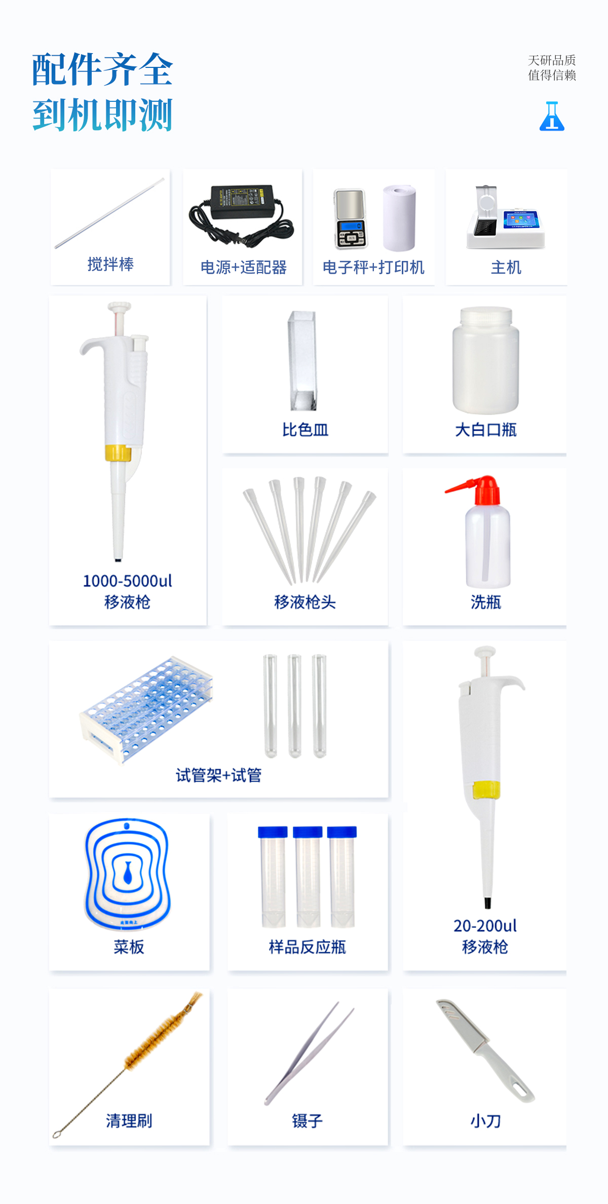 多功能食品安全檢測儀可快速檢測200多項目,包含非食用化學(xué)物質(zhì)、濫用食品添加劑、農(nóng)藥殘留、獸藥殘留、重金屬、病害肉、營養(yǎng)強(qiáng)化劑、抗生素類殘留、激素類殘留、真菌毒素類殘留、化學(xué)類殘留等現(xiàn)場的定性定量檢測。該多功能食品安全檢測儀為集成化食品安全快速檢測分析設(shè)備,廣泛應(yīng)用于市場監(jiān)管局、檢測中心、衛(wèi)生監(jiān)督部門、農(nóng)業(yè)部門、院校及各單位食堂、食品肉產(chǎn)品深加工企業(yè)、商超市場、司法部門、餐飲機(jī)構(gòu)、養(yǎng)殖場、屠宰場、檢驗檢疫部門等單位使用。