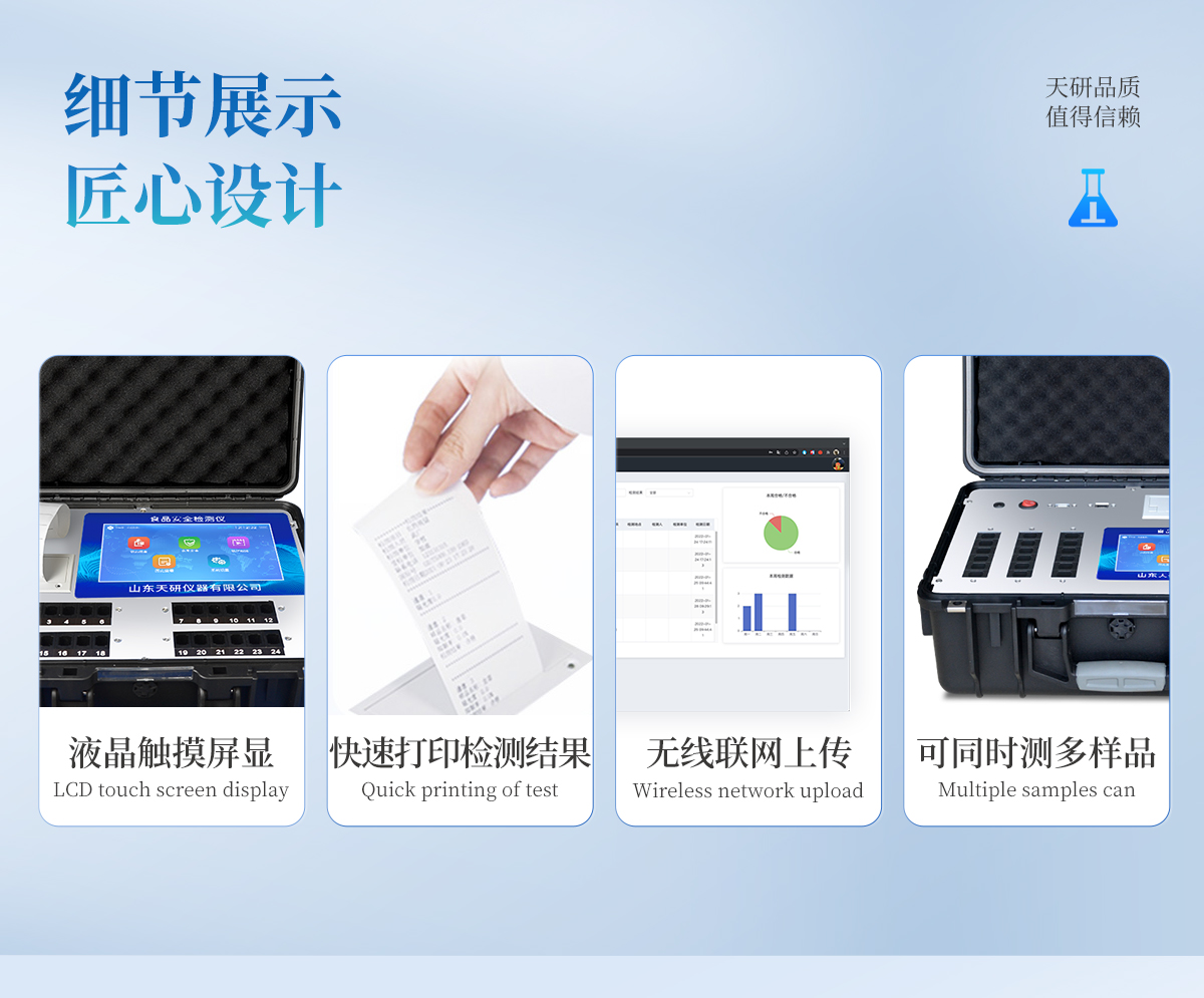| 安卓智能操作系統(tǒng),采用更加**的UI交互界面,儀器具有wifi聯(lián)網(wǎng)上傳、4G聯(lián)網(wǎng)傳輸、GPRS無線遠傳、網(wǎng)線連接功能,快速批量上傳數(shù)據(jù)。 | 智能化程度高,儀器具有自檢功能:具有開機自檢和調(diào)零功能,具有自動檢測重復(fù)性功能。 | 新一代高速熱敏打印機,檢測完成可自動打印或批量打印檢測報告和二維碼。 | 儀器帶有監(jiān)管平臺,數(shù)據(jù)可局域網(wǎng)和互聯(lián)網(wǎng)數(shù)據(jù)上傳,檢測結(jié)果直接傳至食品安全監(jiān)管平臺。進行區(qū)域食品安全監(jiān)管及大數(shù)據(jù)分析處理與數(shù)據(jù)統(tǒng)計,檢測區(qū)域食品安全長短期動態(tài),達到食品安全問題預(yù)估、預(yù)警 | 一體化主機,包含食品安全檢測模塊、多通道農(nóng)藥殘留檢測模塊、膠體金免疫層析檢測模塊。 | 一體化便攜式快檢設(shè)備,滿足現(xiàn)場及流動檢測使用需求,能夠在同一軟件下實現(xiàn)所有檢測項目的檢測,并可通過同一窗口直觀顯示檢測結(jié)果。 | 膠體金模塊檢測方式:軌道式自動傳輸掃描,檢測完成后自動退出檢測卡。 | CT線自動識別,無需手動調(diào)整。 | 內(nèi)置強大的數(shù)據(jù)庫,具有多品類多種類樣品菜單功能,可靈活選擇檢測樣品,不同的檢測通道可同時檢測不同的樣品項目。也可在儀器上直接編輯錄入樣品名稱、檢測指標、送檢單位等信息并保存進樣品數(shù)據(jù)庫。 | 產(chǎn)品內(nèi)置操作演示視頻,是您身邊的化驗指導(dǎo)專家。 | 樣品處理簡單省力,整體操作快速、安全、便捷。 | 儀器具有自身保護功能,可設(shè)置用戶名及密碼,防止非工作人員操作等。 | 高靈敏度,高檢測精度,高重復(fù)性精度,掃描式高精度光學(xué)傳感器。 | 結(jié)果判定線可修改,對照值標定值可保存,斷電不丟失數(shù)據(jù)。 | 兼容市場上所有的膠體金卡,使用耗材不受限制,極大增強用戶使用體驗。 | 儀器具有重新校準、鎖定、恢復(fù)出廠設(shè)置功能。 |
