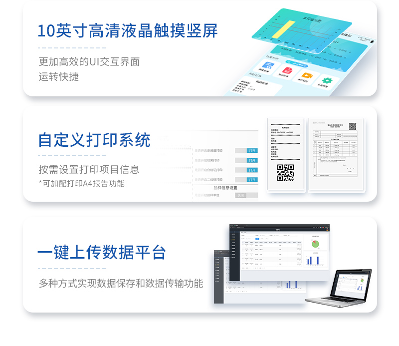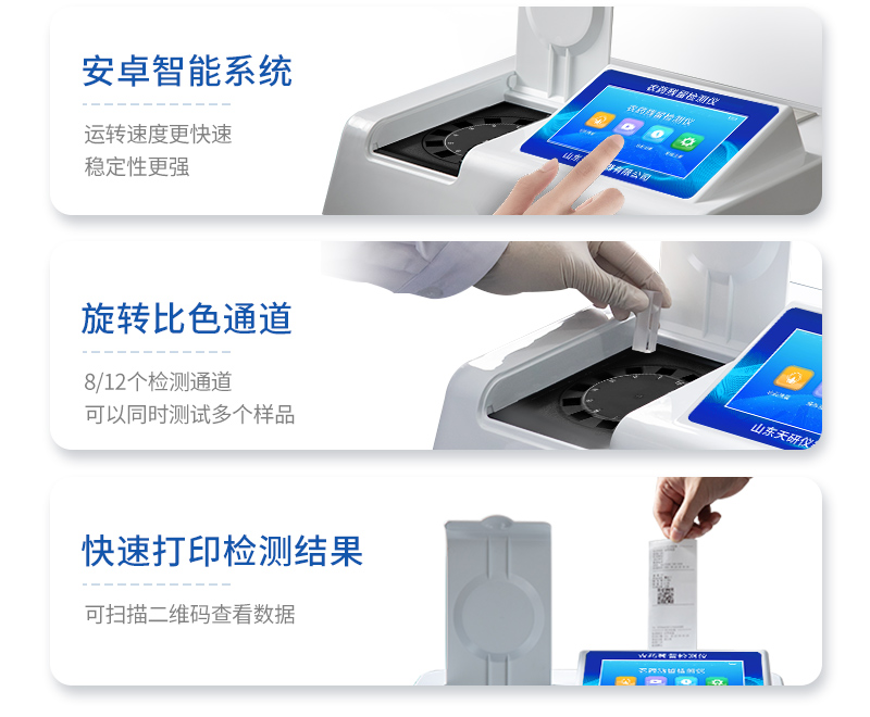 | 安卓智能操作系統(tǒng),采用更加**和人性化操作,儀器具有無線聯(lián)網(wǎng)上傳功能,快速上傳數(shù)據(jù),進行數(shù)據(jù)統(tǒng)計和分析。 | 智能化程度高,儀器具有自檢功能:具有開機自檢和調(diào)零功能,具有自動檢測重復性功能;同時,檢測完成可自動打印檢測報告和二維碼。手機掃碼可顯示出詳細檢測信息。 | 儀器帶有監(jiān)管平臺,數(shù)據(jù)可局域網(wǎng)和互聯(lián)網(wǎng)數(shù)據(jù)上傳,檢測結(jié)果直接傳至食品安全監(jiān)管平臺。進行區(qū)域食品安全監(jiān)管及大數(shù)據(jù)分析處理與數(shù)據(jù)統(tǒng)計,檢測區(qū)域食品安全長短期動態(tài),達到食品安全問題預估、預警 。 | 樣品處理簡單省力,整體操作快速、安全、便捷。 | 儀器具有自身保護功能,可設置用戶名及密碼,防止非工作人員操作等。 | 內(nèi)置強大的數(shù)據(jù)庫,可在儀器上直接選擇樣品名稱、檢測指標、送檢單位等信息,也可在儀器上直接編輯錄入樣品名稱、檢測指標、送檢單位等信息并保存進樣品數(shù)據(jù)庫,方便后期操作調(diào)取使用。 | 儀器具有重新校準、鎖定、恢復出廠設置功能。 |