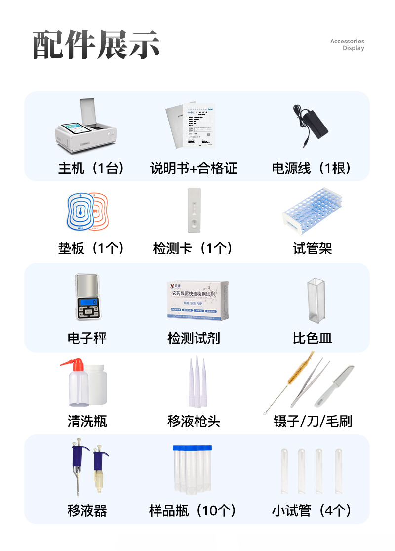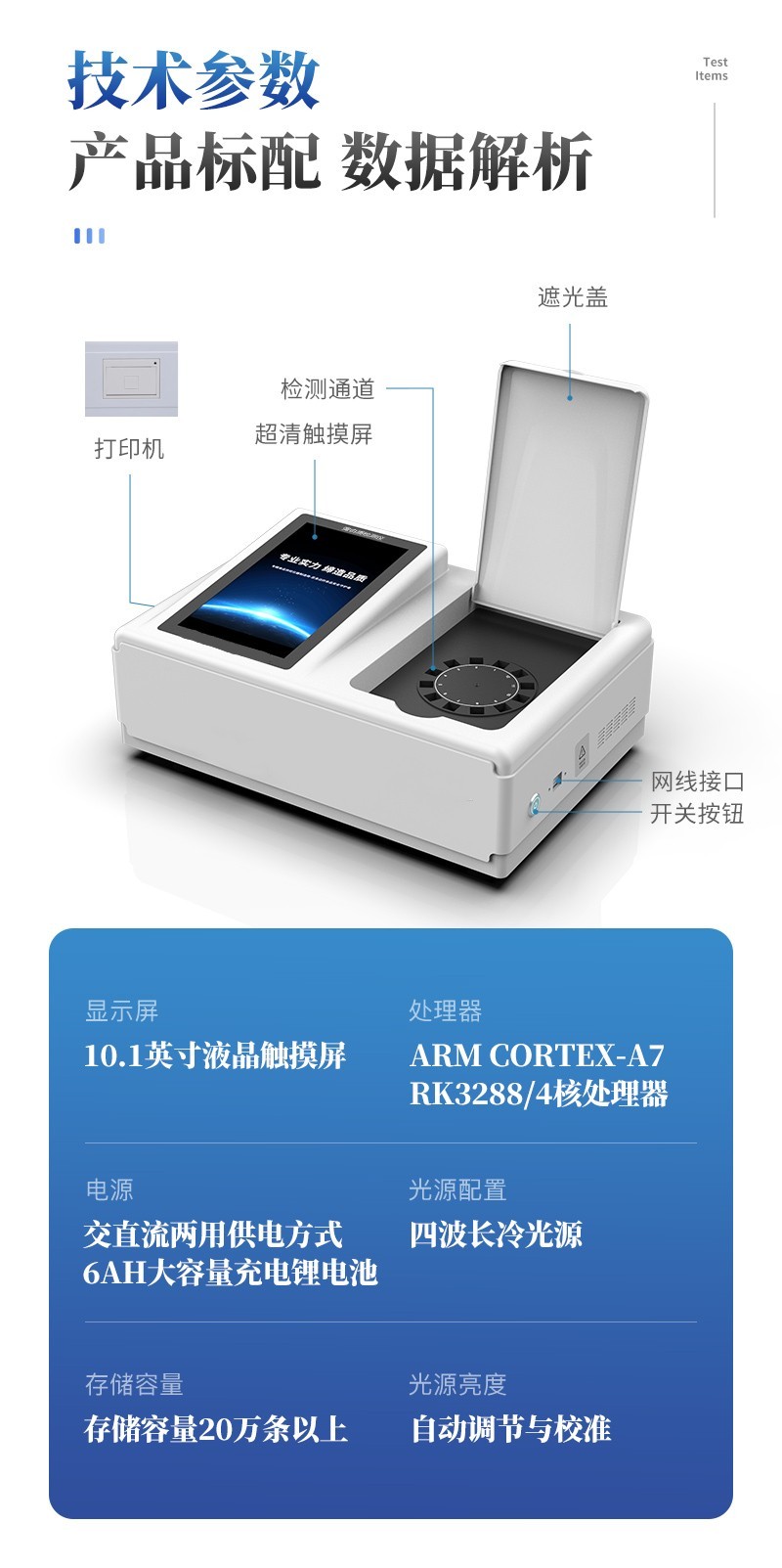 | 儀器采用臺(tái)式一體化系統(tǒng)檢測(cè)技術(shù),將分光光度模塊、新型農(nóng)殘檢測(cè)模塊、數(shù)字化管理模塊、無線通訊模塊高度集成于一體,支持檢測(cè)200種食品安全檢測(cè)項(xiàng)目,同時(shí)預(yù)留升級(jí)檢測(cè)方法。 | 儀器檢測(cè)模塊標(biāo)準(zhǔn)化、智能化,可隨意自由組合。檢測(cè)箱體內(nèi)置多個(gè)標(biāo)準(zhǔn)檢測(cè)單元,檢測(cè)模塊可以調(diào)整配置。 | 儀器采用全新安卓智能系統(tǒng),主控芯片采用 ARM Cortex-A7,RK3288/4核處理器,10.1寸高清液晶觸摸豎屏,更加**的UI交互界面,運(yùn)轉(zhuǎn)快捷;儀器配備無線通信模塊: 4G(APN)通訊模塊、Wifi模塊,藍(lán)牙傳輸,同時(shí)具有雙USB接口以及RJ45接口能以多種方式實(shí)現(xiàn)數(shù)據(jù)保存和數(shù)據(jù)傳輸功能。 | 創(chuàng)新檢測(cè)模式: | ★檢測(cè)通道:≥12通道;采用精密旋轉(zhuǎn)比色池設(shè)計(jì),使用同芯片同光源校準(zhǔn)精度,解決不同光源之間的誤差值。1-12通道間誤差0.1%。(**號(hào):ZL202022821055.2) | ★儀器具有自動(dòng)識(shí)別比色皿檢測(cè)功能,即:將樣品比色皿放入儀器后,點(diǎn)擊樣品檢測(cè),儀器自動(dòng)識(shí)別比色皿進(jìn)行通道檢測(cè)。 | 進(jìn)口高精光源: | 高精度進(jìn)口四波長(zhǎng)冷光源,通道配置 410、520、590、630nm 波長(zhǎng)光源,一個(gè)光源芯片驅(qū)動(dòng)一個(gè)光源,誤差極小,每臺(tái)設(shè)備單獨(dú)**校準(zhǔn)光源,**比對(duì),同時(shí)參照四種不同波段光源全方位覆蓋市面上99%的農(nóng)殘食品項(xiàng)目檢測(cè)。 | 智能化操作系統(tǒng): | 便捷操作系統(tǒng):設(shè)備檢測(cè)時(shí)可在同一檢測(cè)界面自動(dòng)對(duì)應(yīng)相關(guān)檢測(cè)通道一次性選擇1-12個(gè)樣品名稱,無須退出界面,節(jié)省操作時(shí)間。 | 數(shù)據(jù)集成系統(tǒng):設(shè)備首頁自動(dòng)統(tǒng)計(jì)檢測(cè)數(shù)據(jù)包含:周檢測(cè)數(shù)據(jù)、月檢測(cè)數(shù)據(jù),全部檢測(cè)總數(shù)量,均包含檢測(cè)總數(shù),合格數(shù),不合格數(shù),以及相關(guān)柱形分析圖,對(duì)各項(xiàng)檢測(cè)數(shù)據(jù)清晰掌握,無需電腦查詢,更加快捷直觀。 | 項(xiàng)目預(yù)設(shè)系統(tǒng):支持添加單個(gè)及多個(gè)相同或不相同的任務(wù)預(yù)設(shè),一鍵快速調(diào)取,每一個(gè)任務(wù)分別可以設(shè)置不同的樣品、批次、編號(hào)、來源、備注、抽樣信息、檢測(cè)信息、受檢信息、復(fù)核信息等更多信息。無縫鏈接平臺(tái)和APP實(shí)時(shí)查看下發(fā)任務(wù)。 | 數(shù)據(jù)監(jiān)管系統(tǒng):同步對(duì)接監(jiān)管平臺(tái),數(shù)據(jù)可局域網(wǎng)和互聯(lián)網(wǎng)數(shù)據(jù)上傳,檢測(cè)結(jié)果可選擇直接傳至食品安全監(jiān)管平臺(tái)。集成OSS輸出存儲(chǔ)服務(wù)、區(qū)分設(shè)備定向管理應(yīng)用,進(jìn)行區(qū)域食品安全監(jiān)管及大數(shù)據(jù)分析處理與數(shù)據(jù)統(tǒng)計(jì),檢測(cè)區(qū)域食品安全長(zhǎng)短期動(dòng)態(tài),達(dá)到食品安全問題預(yù)估、預(yù)警。 | 自定義打印系統(tǒng):內(nèi)置全新打印系統(tǒng),新創(chuàng)自定義打印方式,可按需靈活設(shè)置開啟或關(guān)閉:產(chǎn)品合格證(國(guó)家農(nóng)業(yè)部標(biāo)準(zhǔn)要求),二維碼,抽樣信息、檢測(cè)信息,受檢信息、復(fù)核信息、抽樣日期、檢測(cè)日期等信息的打印。 | 系統(tǒng)遠(yuǎn)程更新功能:可定向分客戶分儀器更新系統(tǒng),按照不同客戶后期實(shí)際需求添加項(xiàng)目,無需機(jī)器返廠,即可遠(yuǎn)程實(shí)時(shí)升級(jí)全新系統(tǒng),節(jié)省時(shí)間成本及避免運(yùn)輸造成設(shè)備損壞。 | 儀器主機(jī)采用一體化防水、抗壓、防撞擊、防腐蝕箱體設(shè)計(jì),同時(shí)配備交直流供電,可連接車載電源,可選配大容量充電鋰電池,滿足現(xiàn)場(chǎng)野外檢測(cè)需求。 | 安全證書,放心保障:儀器具有中國(guó)計(jì)量科學(xué)研究院校準(zhǔn)證書,**認(rèn)證。 |