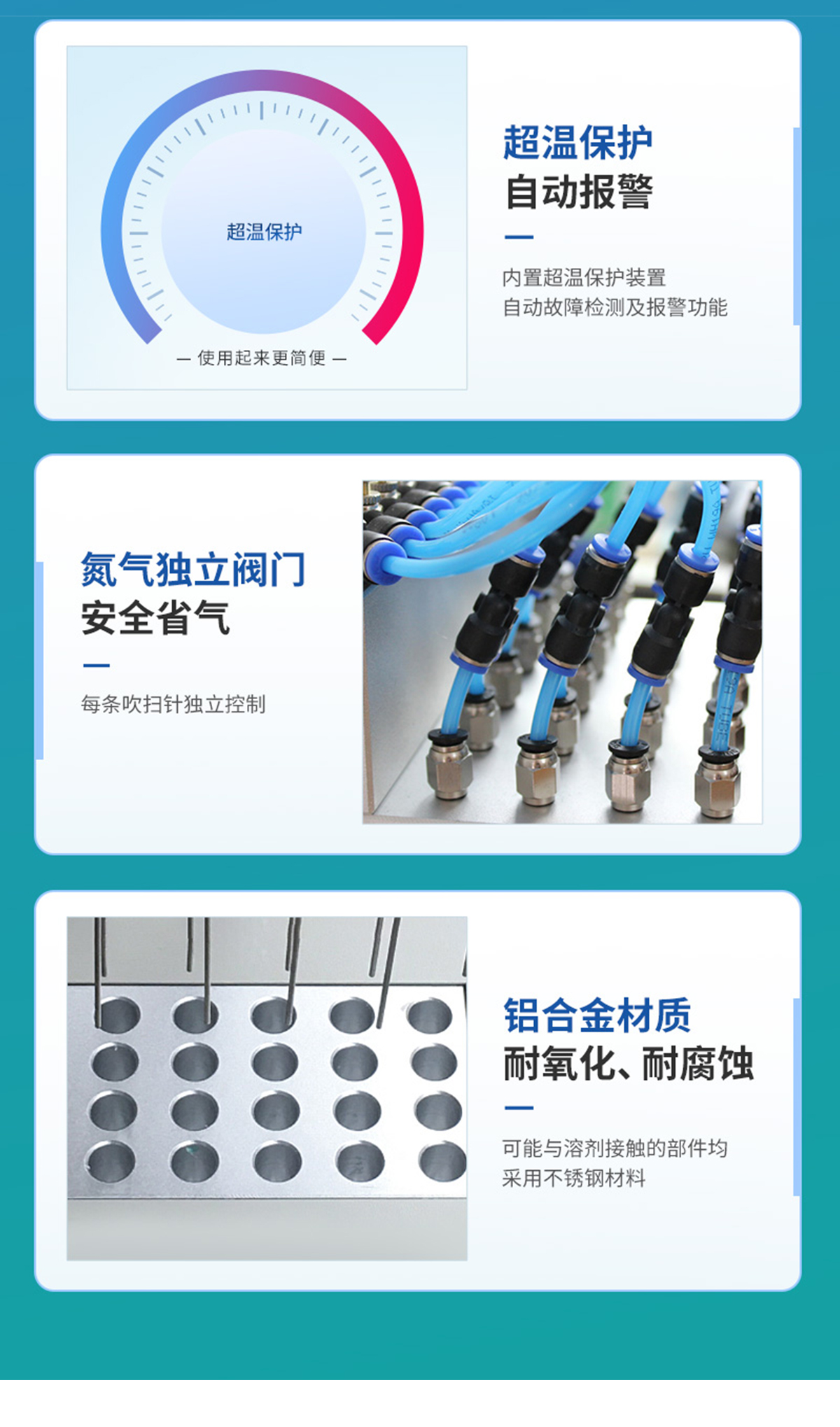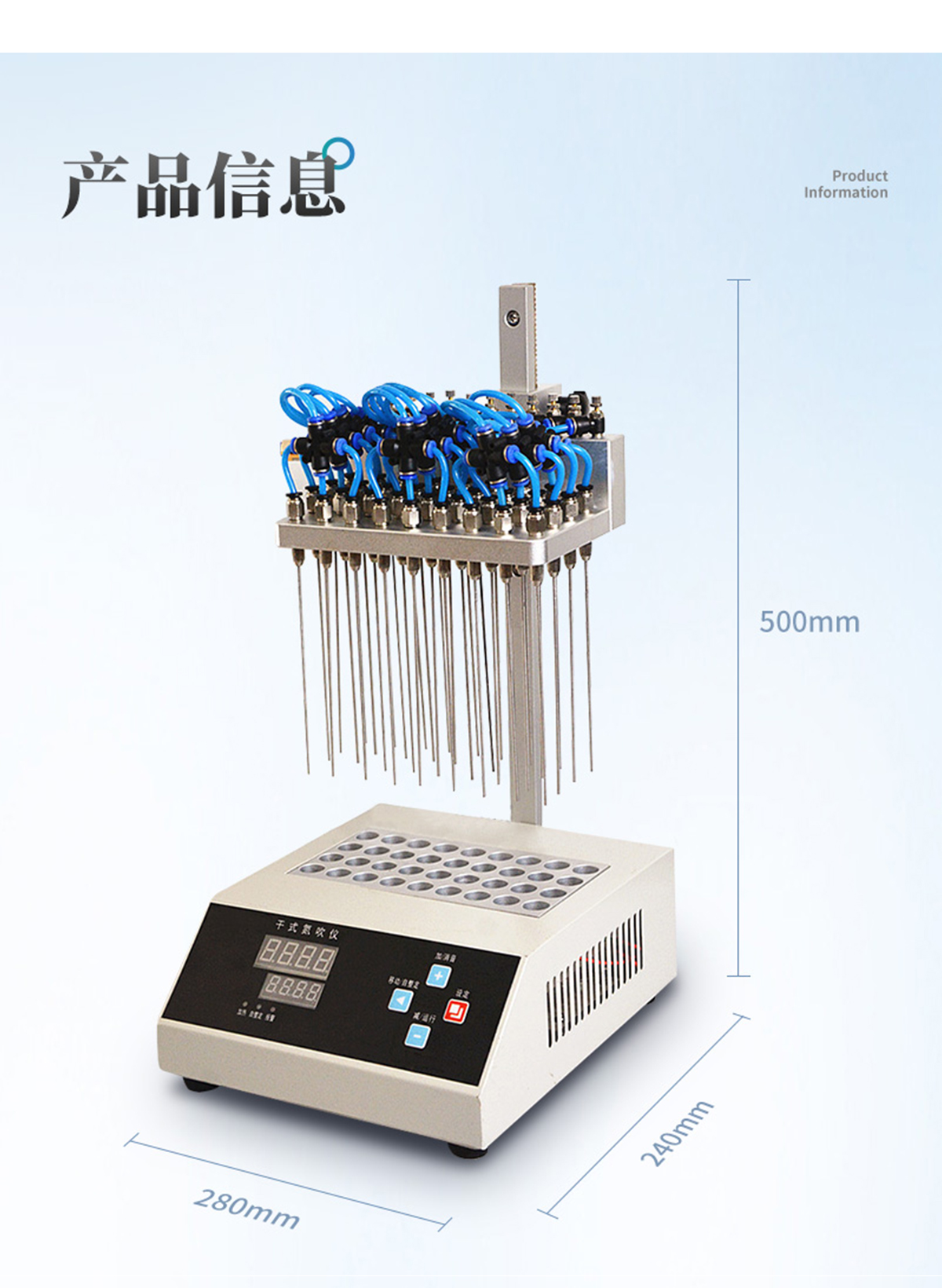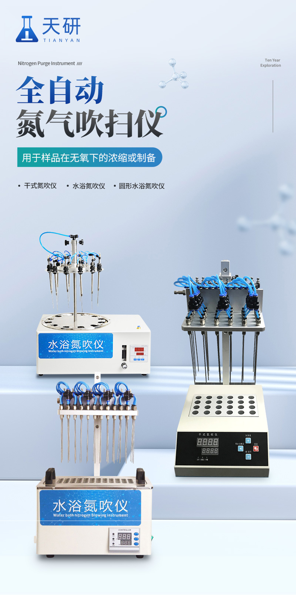 12位 圓形水浴氮氣吹干儀 氮氣吹掃裝置360度旋轉(zhuǎn)自由升降 產(chǎn)品說明: 圓形水浴氮吹儀利用吹掃捕集技術(shù),同時可對樣品進行控溫加熱,通過氮氣等惰性氣體快速、可控、連續(xù)地吹到樣品表面來達到樣品溶液快速無氧濃縮。該方法具有省時、便捷、準(zhǔn)確的特點。廣泛用于食品安全、醫(yī)藥、農(nóng)藥殘留檢測、臨床
