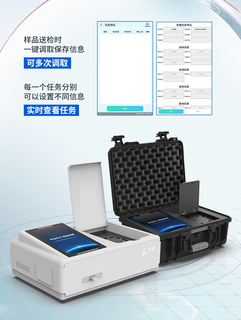 | 儀器采用手提式一體化系統(tǒng)檢測技術,將分光光度模塊、膠體金檢測模塊、新型農(nóng)殘檢測模塊、數(shù)字化管理模塊、無線通訊模塊高度集成于一體,支持檢測200種食品安全檢測項目,同時預留升級檢測方法。 | 儀器檢測模塊標準化、智能化,檢測項目可隨意自由組合。檢測箱體內(nèi)置多個標準檢測單元,檢測模塊可以調(diào)整配置。 | 顯示屏幕:儀器采用10.1英寸豎向液晶觸摸屏顯,搭配運行安卓智能操作系統(tǒng),主控芯片采用ARM Cortex-A7,RK3288/4核處理器,主頻1.88Ghz,操作方便,性能更強。 | 檢測通道:≥12通道;采用精密旋轉(zhuǎn)比色池設計,使用同芯片同光源校準精度,解決不同光源之間的誤差值,更加準確**。(1-12通道間誤差0.1%,**號:ZL202022821055.2) | 儀器光源:高精度進口四波長冷光源,每個通道均配置 410、520、590、630nm 波長光源,標配**的光路切換裝置,**光路切換功能可實現(xiàn)64波長,并且所有檢測項目可實現(xiàn)所有通道同時檢測。 | 設備可一鍵校準,自動保存校準數(shù)據(jù),自動對比校驗,得到精準光源,采用Android SP存儲數(shù)據(jù),光源數(shù)據(jù)永不丟失,方便每一次使用。 | 通訊接口:配備無線通信模塊、4G(APN)通訊模塊、藍牙傳輸,同時具有雙USB接口以及RJ45網(wǎng)線接口,可以多方式實現(xiàn)數(shù)據(jù)保存及數(shù)據(jù)傳輸 | 存儲方式:支持U盤存儲,標準USB接口,免驅(qū)動安裝。檢測結(jié)果存儲容量20萬條以上,可生成Excel表格進行拷貝,并具有登錄保護功能。 | 智能化操作系統(tǒng): | 1)操作系統(tǒng):儀器可在同一檢測界面自動對應相關檢測通道,一次性選擇1-12個樣品名稱,無需退出界面,節(jié)省操作時間。并可以對每個通道屬性和樣品信息單獨進行編輯,例如送檢單位、人員,檢測人員等,打印時勾選打印顯示。 | 2)數(shù)據(jù)集成系統(tǒng):設備首頁自動匯總分析檢測數(shù)據(jù),包含:周檢測數(shù)據(jù)、月檢測數(shù)據(jù),全部檢測總數(shù)量,均包含檢測總數(shù),合格數(shù),不合格數(shù),以及相關柱形分析圖,各項檢測數(shù)據(jù)一目了然,無需電腦查詢,更加快捷直觀。 | 3)數(shù)據(jù)庫系統(tǒng):十幾項數(shù)據(jù)庫分類管理儀器:包含項目類型、項目數(shù)據(jù)、檢測數(shù)據(jù)、歷史記錄、國標信息、曲線信息、采樣信息、檢測信息、受檢信息、復核信息、圖表信息、光源校準信息、打印樣式信息、樣品庫信息等等,數(shù)據(jù)庫之間互相協(xié)調(diào)聯(lián)動保證數(shù)據(jù)的真實完整性。同時產(chǎn)品數(shù)據(jù)庫以及歷史檢測記錄支持一鍵檢索功能。 | 4)限量規(guī)判系統(tǒng):具有限量查詢、添加物質(zhì)合規(guī)判定系統(tǒng)。檢測出結(jié)果后,系統(tǒng)自動調(diào)用系統(tǒng)數(shù)據(jù)庫中相關國標進行比對判定,客觀顯示判定結(jié)果是否合格。 | 5)項目預設系統(tǒng):儀器具有任務預設模塊,一鍵提前預設,給出方便快捷的新檢測方案,每一個任務分別可以設置不同的樣品、批次、編號、來源、備注、抽樣信息、檢測信息、受檢信息、復核信息等更多信息。樣品送檢時一鍵調(diào)取保存信息,并可多次調(diào)取,大大提高檢測效率。 | 6)數(shù)據(jù)監(jiān)管系統(tǒng):同步對接監(jiān)管平臺,數(shù)據(jù)可局域網(wǎng)和互聯(lián)網(wǎng)數(shù)據(jù)上傳,檢測結(jié)果可選擇直接傳至食品安全監(jiān)管平臺。進行區(qū)域食品安全監(jiān)管及大數(shù)據(jù)分析處理與數(shù)據(jù)統(tǒng)計,檢測區(qū)域食品安全長短期動態(tài),達到食品安全問題預估、預警。 | 7)打印系統(tǒng):內(nèi)置全新打印機,新創(chuàng)自定義打印方式,可按需靈活勾選控制:產(chǎn)品合格證(國家農(nóng)業(yè)部標準要求),二維碼,抽樣信息、檢測信息,受檢信息、復核信息、抽樣日期、檢測日期等信息的打印。 | 供電模式:儀器交直流兩用,直流12V供電,可連接車載電源,可配6ah大容量充電鋰電池,電量可實時顯示,方便戶外流動測試。 | 膠體金檢測模塊:采用雙通道CMOS成像處理技術及膠體金免疫層析技術,可同時讀取雙膠體金卡數(shù)據(jù),自動采集、處理分析,將檢測結(jié)果顯示,并可根據(jù)參考限值自動判斷檢測結(jié)果,可檢測常見的獸藥殘留、生物毒素、抗生素、違禁添加物等。 | 1)探測技術:CMOS成像探測; | 2)檢測通道:1個通道; | 3)檢測方式:消線法和比色法; | 4)顯示模式:陰性或陽性; | 5)曲線形式:軌道式掃描方式,顯示金標卡圖像,實時生成、識別CT曲線圖,無需手動調(diào)整,完成檢測后自動退出檢測卡。兼容市場上其他金標卡,使用耗材不受限制。 | 儀器加入遠程升級功能,可定向分客戶分儀器更新,開機后自動更新,客戶無需任何操作,即可升級全新項目。做到了無需退換機器即可實現(xiàn)實時遠程升級檢測儀器。 |