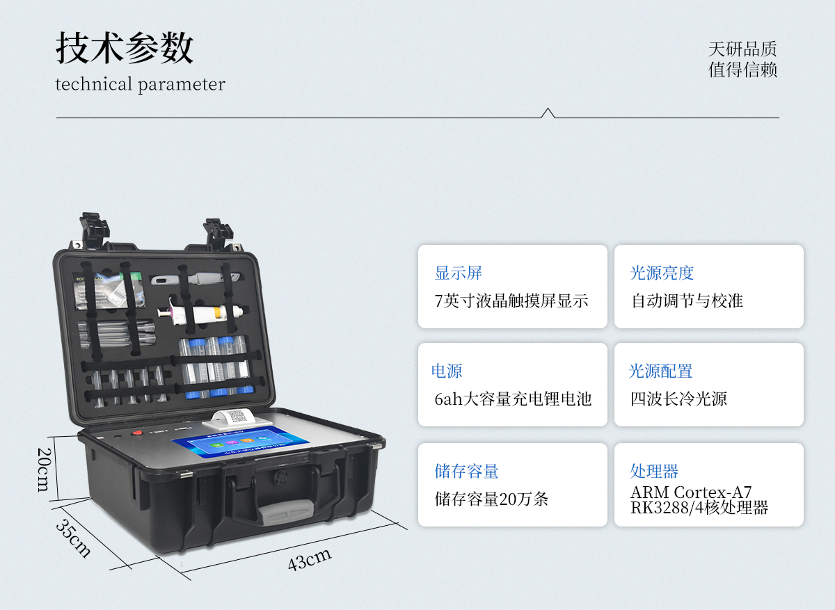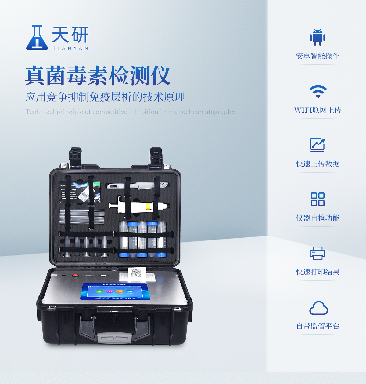 | 用途:可用于糧食谷物及其制品、飼料、植物油中真菌毒素快速定量測定; | 檢測方法:采用發(fā)光定量免疫層析技術(shù),激光激發(fā),掃描方式收集發(fā)光熒光信號。 | 定量參數(shù)設(shè)定:RFID芯片記錄檢測目標(biāo)的標(biāo)準(zhǔn)曲線,根據(jù)不同樣本類型配備多參數(shù)卡; | 識別功能:試劑插卡后儀器自動識別檢測項目; | 靈敏性和特異性:不受外界的背景干擾, 檢測限為0.4-4500ug/kg;對其它毒素?zé)o非特異反應(yīng); | 穩(wěn)定性:無淬滅和光漂白現(xiàn)象; | 檢測時間快,實時顯示檢測曲線 | 無需孵育器,室溫(15-30℃)下進行測試 | 數(shù)據(jù)獲取和處理:檢測結(jié)果自動獲?。o需目測),可實時打印檢測報告;數(shù)據(jù)可儲存,可導(dǎo)出。 | 儀器可靠:有開機系統(tǒng)自檢功能;儀器配有質(zhì)控卡,確保檢測系統(tǒng)自身的準(zhǔn)確性; | 檢測數(shù)據(jù)精準(zhǔn)可靠:HPLC/LC-MS結(jié)果接近 | 檢測儀器獲得國家認證 | 聯(lián)網(wǎng):網(wǎng)絡(luò)接口 | 升級:可以通過U盤進行軟件升級 | 存儲空間:≥32G,**擴展至64G | 工作功率:40W | 操作系統(tǒng):windows 7 | 顯示屏:可觸摸顯示屏,屏幕尺寸≥8寸 | 定量檢測項目:包括黃曲霉毒素B1、嘔吐毒素、玉米赤霉烯酮、T-2毒素、伏馬毒素 |