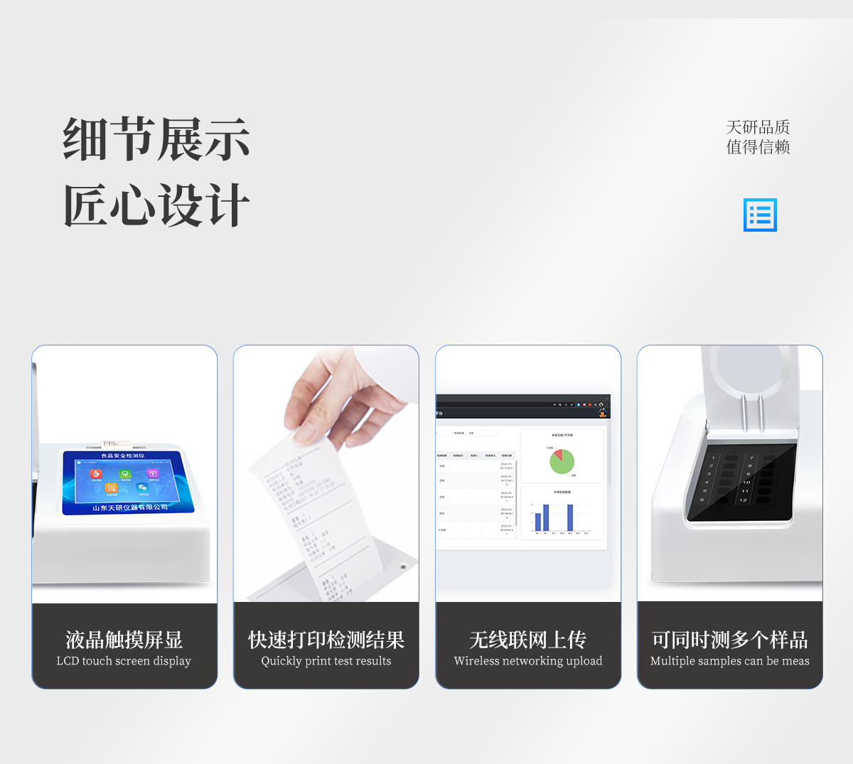 | 儀器采用臺式一體化系統(tǒng)檢測技術(shù),將分光光度模塊、新型農(nóng)殘檢測模塊、數(shù)字化管理模塊、無線通訊模塊高度集成于一體,支持檢測200種食品安全檢測項目,同時預留升級檢測方法。 | 儀器檢測模塊標準化、智能化,可隨意自由組合。檢測箱體內(nèi)置多個標準檢測單元,檢測模塊可以調(diào)整配置。 | 儀器采用全新安卓智能系統(tǒng),主控芯片采用 ARM Cortex-A7,RK3288/4核處理器,10.1寸高清液晶觸摸豎屏,更加**的UI交互界面,運轉(zhuǎn)快捷;儀器配備無線通信模塊: 4G(APN)通訊模塊、Wifi模塊,藍牙傳輸,同時具有雙USB接口以及RJ45接口能以多種方式實現(xiàn)數(shù)據(jù)保存和數(shù)據(jù)傳輸功能。 | 創(chuàng)新檢測模式: | ★檢測通道:≥12通道;采用精密旋轉(zhuǎn)比色池設計,使用同芯片同光源校準精度,解決不同光源之間的誤差值。1-12通道間誤差0.1%。(**號:ZL202022821055.2) | ★儀器具有自動識別比色皿檢測功能,即:將樣品比色皿放入儀器后,點擊樣品檢測,儀器自動識別比色皿進行通道檢測。 | 進口高精光源: | 高精度進口四波長冷光源,通道配置 410、520、590、630nm 波長光源,一個光源芯片驅(qū)動一個光源,誤差極小,每臺設備單獨**校準光源,**比對,同時參照四種不同波段光源全方位覆蓋市面上99%的農(nóng)殘食品項目檢測。 | 智能化操作系統(tǒng): | 便捷操作系統(tǒng):設備檢測時可在同一檢測界面自動對應相關(guān)檢測通道一次性選擇1-12個樣品名稱,無須退出界面,節(jié)省操作時間。 | 數(shù)據(jù)集成系統(tǒng):設備首頁自動統(tǒng)計檢測數(shù)據(jù)包含:周檢測數(shù)據(jù)、月檢測數(shù)據(jù),全部檢測總數(shù)量,均包含檢測總數(shù),合格數(shù),不合格數(shù),以及相關(guān)柱形分析圖,對各項檢測數(shù)據(jù)清晰掌握,無需電腦查詢,更加快捷直觀。 | 項目預設系統(tǒng):支持添加單個及多個相同或不相同的任務預設,一鍵快速調(diào)取,每一個任務分別可以設置不同的樣品、批次、編號、來源、備注、抽樣信息、檢測信息、受檢信息、復核信息等更多信息。無縫鏈接平臺和APP實時查看下發(fā)任務。 | 數(shù)據(jù)監(jiān)管系統(tǒng):同步對接監(jiān)管平臺,數(shù)據(jù)可局域網(wǎng)和互聯(lián)網(wǎng)數(shù)據(jù)上傳,檢測結(jié)果可選擇直接傳至食品安全監(jiān)管平臺。集成OSS輸出存儲服務、區(qū)分設備定向管理應用,進行區(qū)域食品安全監(jiān)管及大數(shù)據(jù)分析處理與數(shù)據(jù)統(tǒng)計,檢測區(qū)域食品安全長短期動態(tài),達到食品安全問題預估、預警。 | 自定義打印系統(tǒng):內(nèi)置全新打印系統(tǒng),新創(chuàng)自定義打印方式,可按需靈活設置開啟或關(guān)閉:產(chǎn)品合格證(國家農(nóng)業(yè)部標準要求),二維碼,抽樣信息、檢測信息,受檢信息、復核信息、抽樣日期、檢測日期等信息的打印。 | 系統(tǒng)遠程更新功能:可定向分客戶分儀器更新系統(tǒng),按照不同客戶后期實際需求添加項目,無需機器返廠,即可遠程實時升級全新系統(tǒng),節(jié)省時間成本及避免運輸造成設備損壞。 | 儀器主機采用一體化防水、抗壓、防撞擊、防腐蝕箱體設計,同時配備交直流供電,可連接車載電源,可選配大容量充電鋰電池,滿足現(xiàn)場野外檢測需求。 | 安全證書,放心保障:儀器具有中國計量科學研究院校準證書,**認證。 |