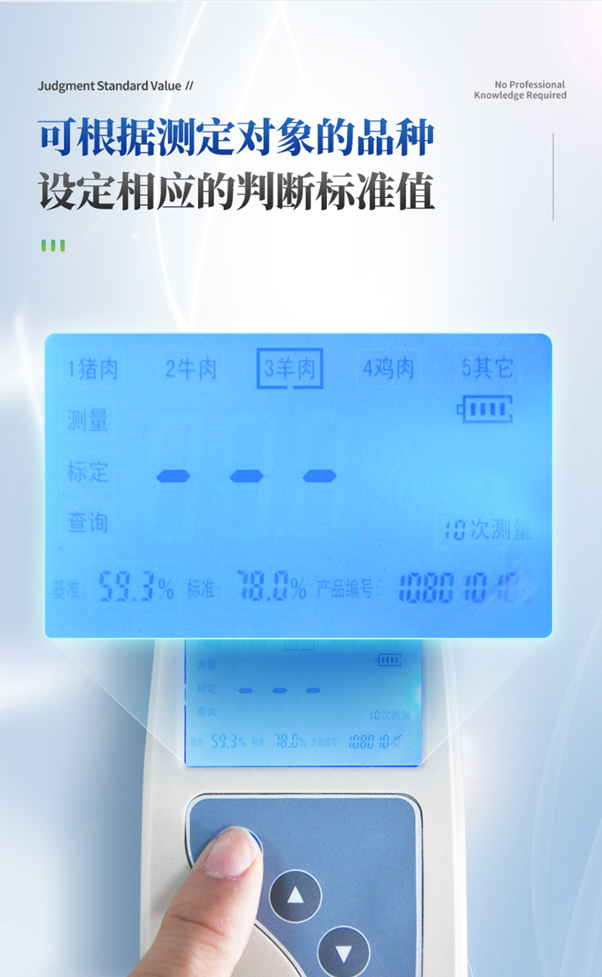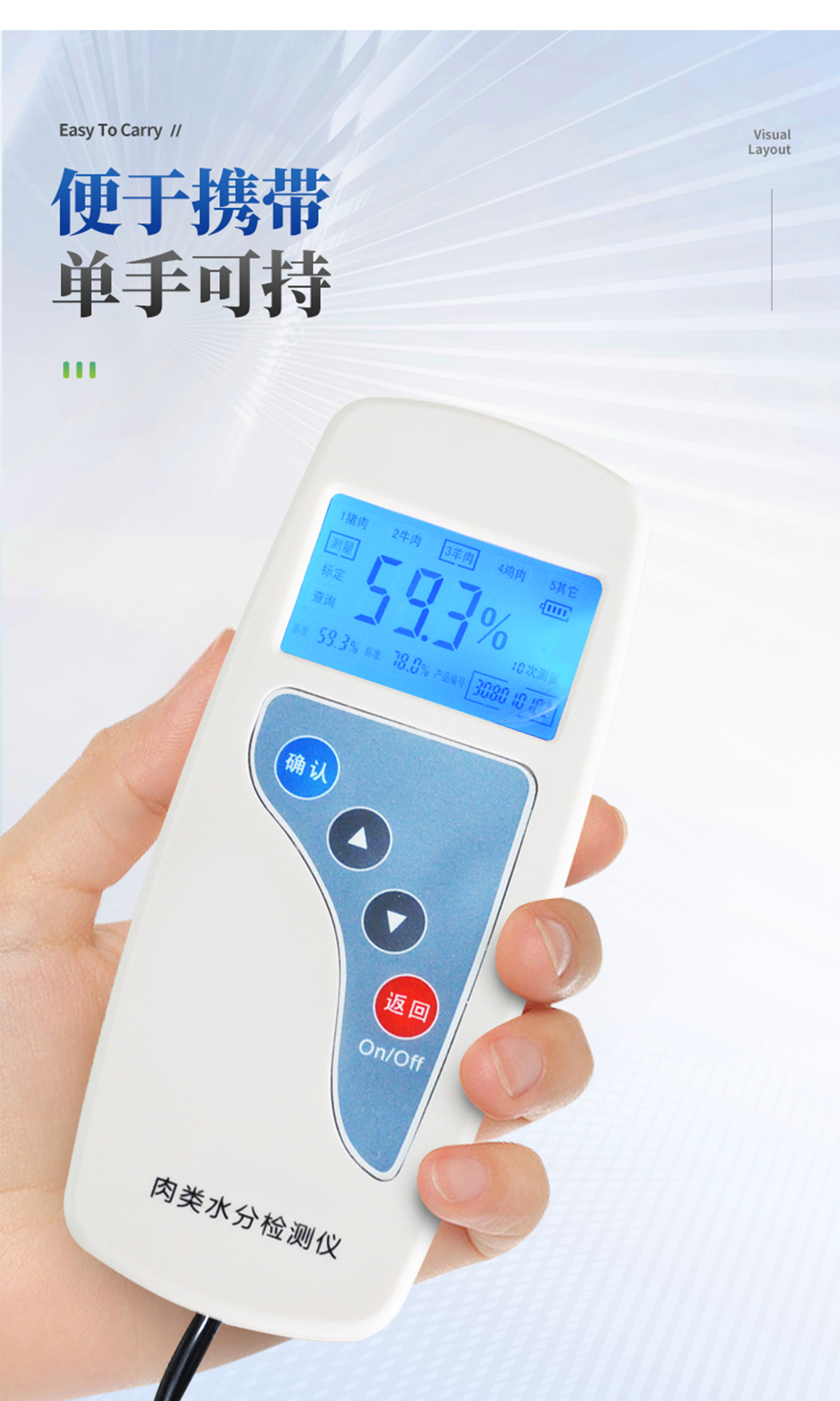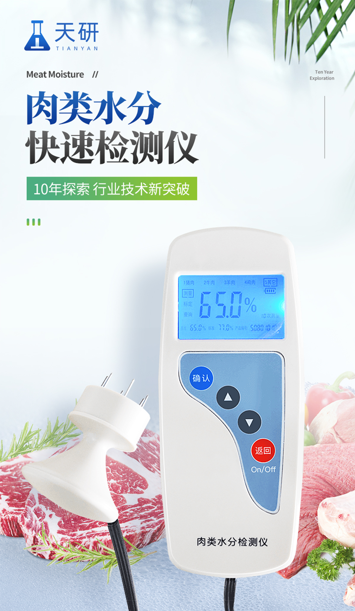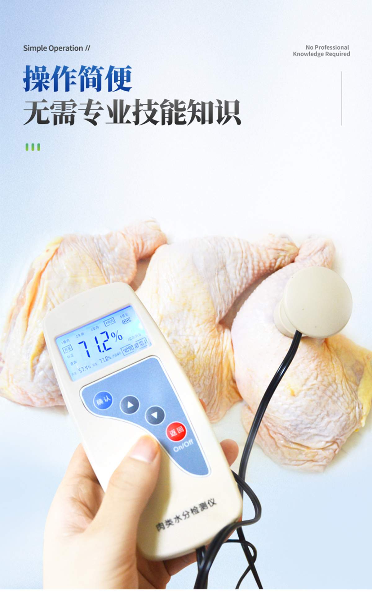 肉類水分檢測儀主要用于快速豬肉、牛肉、雞肉等動(dòng)物肉類水分含量,從而判斷所測樣品是否為注水肉,該儀器設(shè)計(jì)精巧,單手可持,儀器可根據(jù)測定對象的品種,設(shè)定相應(yīng)的判斷標(biāo)準(zhǔn)值。