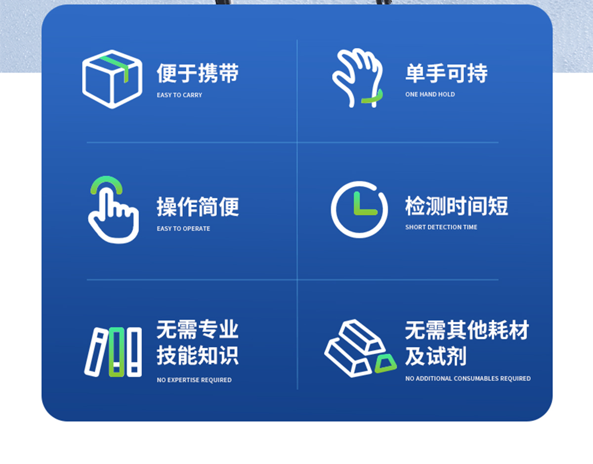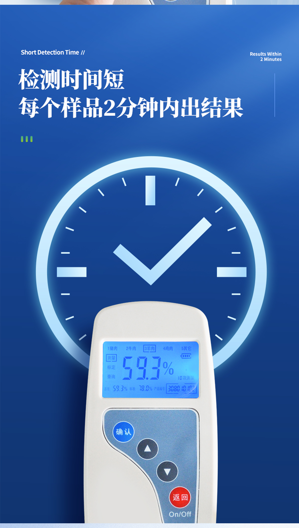 | 便于攜帶,單手可持 | 可根據(jù)測定對象的品種,設(shè)定相應(yīng)的判斷標(biāo)準(zhǔn)值 | 操作簡便,檢測人員無需專業(yè)技能知識 | 檢測時(shí)間短,每個(gè)樣品2分鐘內(nèi)出結(jié)果; | 檢測試驗(yàn)無需其他耗材及試劑 |