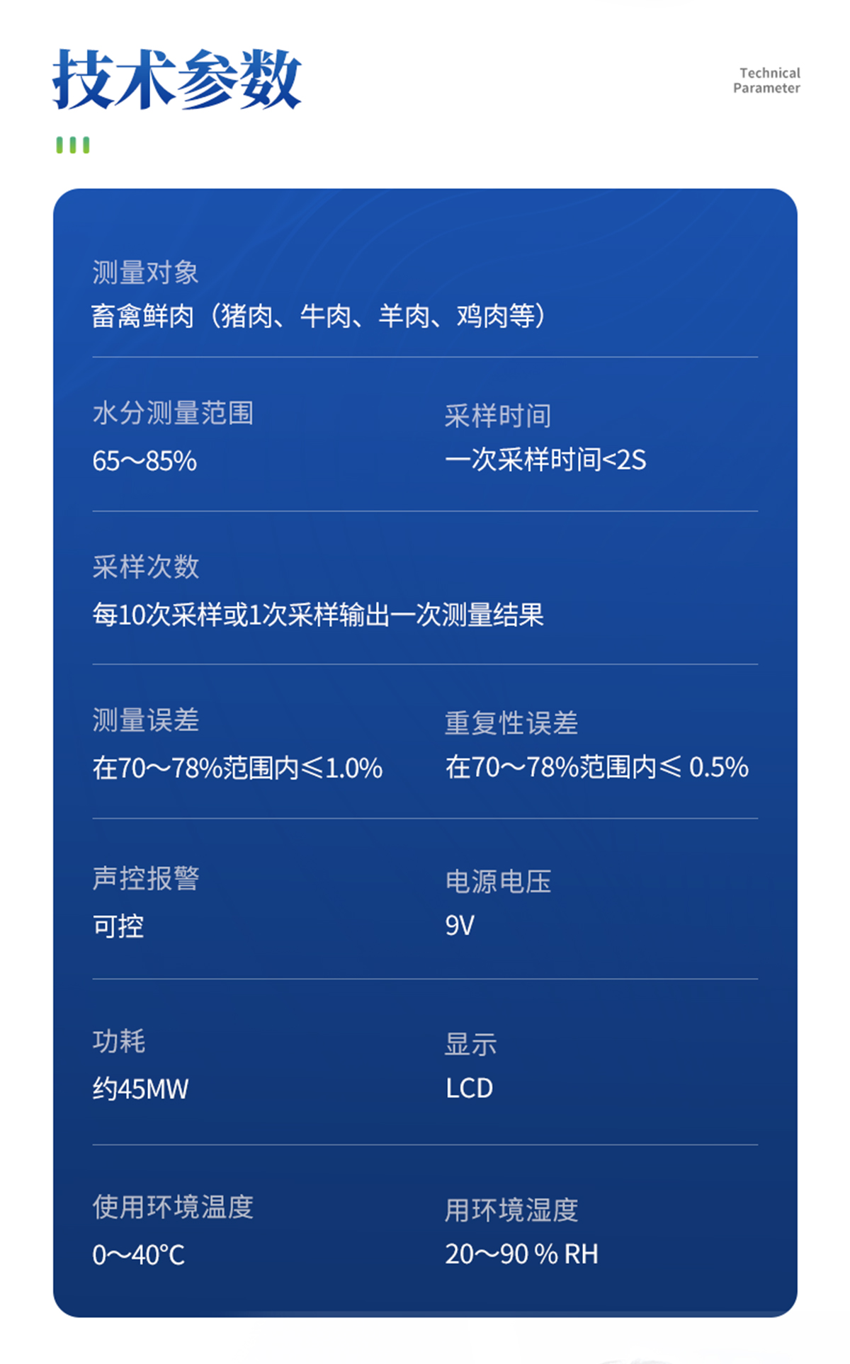 | 畜禽鮮肉(豬肉、牛肉、羊肉、雞肉等) | 65~85% | 一次采樣時(shí)間< 1s | 每10次采樣或1次采樣輸出一次測量結(jié)果 | 在70~78%范圍內(nèi)≤1.0% | 在70~78%范圍內(nèi)≤ 0.5% | 超標(biāo)報(bào)警 | 可設(shè)定每個(gè)品種的判斷標(biāo)準(zhǔn)。 | 交直流兩用 | 觸摸式按鍵 | 45mW | 167×70×30mm | 藍(lán)色背光LCD | 0~40℃ | 20~90 % RH | USB接口 |