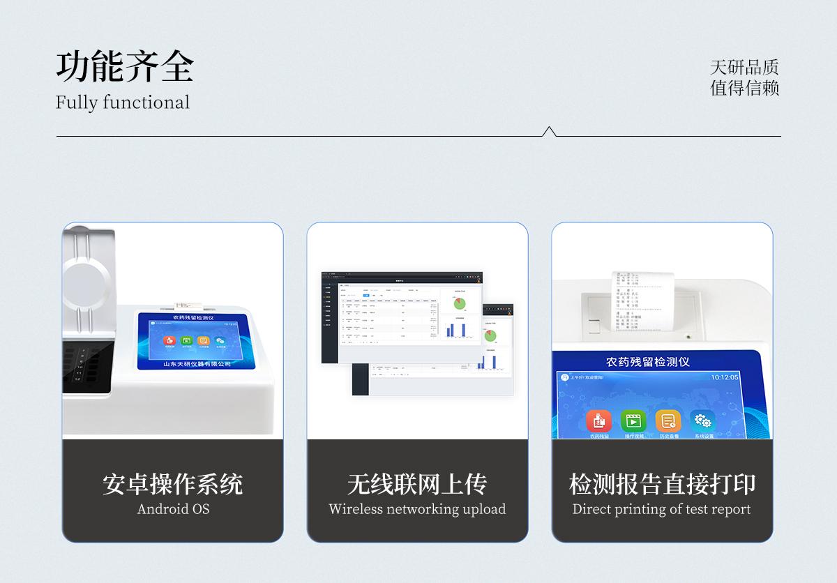 | 乙酰膽堿酯酶和丁酰膽堿酯酶試劑均可以使用,符合國家標準和農(nóng)業(yè)部標準的要求。 | 自動判斷樣品是否合格,檢測結(jié)果更加直觀。 | 儀器具有100多種蔬菜名稱菜單庫,分類管理,并可按需添加或刪除蔬菜名,編輯蔬菜名稱,可直接打印出蔬菜名稱。 | 檢測通道:12個檢測通道,可以同時測試多個樣品,循環(huán)檢測,即放即檢,每個樣品由程序控制分別獨立工作,不會互相干擾。 | 智能操作系統(tǒng),采用更加人性化操作,主控采用多核處理器,主頻1.88Ghz,運轉(zhuǎn)速度更快速,穩(wěn)定性更強。 | 顯示方式:7英寸高靈敏真彩觸摸屏顯示,人性化中文操作界面,讀數(shù)直觀、簡單。 | 打印機采用串口5v打印,可選擇手動打印或者自動打印,三分鐘出打印結(jié)果,打印格式為檢測人姓名、吸光度差值、檢測時間、檢測機構(gòu)、樣品名稱及結(jié)果判定。 | 光源采用進口超高亮發(fā)光二極管,具有低功耗、高精度、穩(wěn)定性強、光源可控可以關(guān)掉不使用的光源,響應(yīng)速度快等優(yōu)點。 | 智能恒流穩(wěn)壓,光強自動校準,長時間連續(xù)工作光源無溫漂現(xiàn)象。 | 儀器具有GPRS遠傳功能,可插手機卡實現(xiàn)數(shù)據(jù)遠傳平臺,wifi聯(lián)網(wǎng)功能,可將數(shù)據(jù)快速上傳電腦,進行數(shù)據(jù)管理與統(tǒng)計。 | 采用USB2.0接口設(shè)計,方便數(shù)據(jù)的存貯和移動,并可隨時與計算機直接相連,并且可用計算機控制儀器。實現(xiàn)數(shù)據(jù)查詢、瀏覽、分析、統(tǒng)計、打印等。 | 智能化程度高,儀器具有自檢功能:具有開機自檢和調(diào)零功能,具有自動檢測重復(fù)性功能 | 儀器具有自身保護功能,可設(shè)置用戶名及密碼,防止非工作人員操作等。 | 采用DC12v直流供電,安全系統(tǒng)更高,并且配備6A鋰電池充電器。 | 儀器具有重新校準、鎖定、恢復(fù)出廠設(shè)置功能。 |