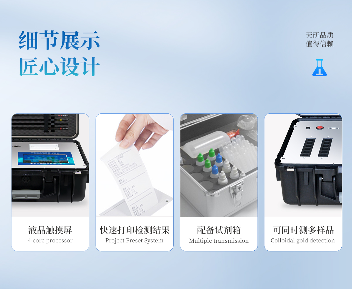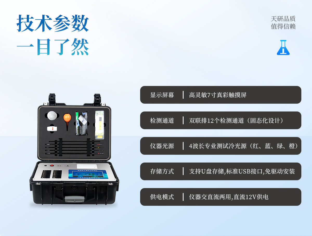 | 1、本儀器集各功能于一身,無需用戶自配附件,可靈活流動檢測。 | 2、安卓(Android)智能操作系統(tǒng),主控芯片采用ARM Cortex-A7,RK3288/4核處理器,主頻1.88Ghz,運轉(zhuǎn)速度更快速,穩(wěn)定性更強。 | 3、雙聯(lián)排12個檢測通道(固態(tài)化設計),一次性可快速檢測12個樣品,極大提升檢測效率,降低檢測成本。 | 4、檢測過程中內(nèi)置校準功能,智能恒流穩(wěn)壓,光強自動校準,確保檢測準確度。 | 5、內(nèi)置作物專家施肥系統(tǒng),可對百余種全國農(nóng)業(yè)經(jīng)濟作物、果樹等的目標產(chǎn)量計算推薦施肥量,依據(jù)施肥配方科學指導農(nóng)業(yè)生產(chǎn)。測土配方施肥結(jié)果可打印,打印內(nèi)容包含:作物種類、肥料種類、目標產(chǎn)量、需求總量、建議施肥方案。 | 6、儀器標配wifi無線上傳、4G聯(lián)網(wǎng)傳輸、GPRS無線遠傳功能,快速上傳數(shù)據(jù)。 | 7、儀器內(nèi)置大容量內(nèi)存,支持查看全部歷史檢測記錄,以及傳輸所有檢測數(shù)據(jù)。 | 8、配有智慧云農(nóng)業(yè)平臺,儀器連入無線網(wǎng)絡后,可將檢測數(shù)據(jù)可選擇性或批量無線上傳,方便用戶進行長期數(shù)據(jù)管理和可視化分析。 | 9、儀器配同時具有USB接口、以太網(wǎng)接口,并可隨時用U盤拷貝出數(shù)據(jù)。 | 10、可用手機隨時登錄云平臺在線移動查看歷史數(shù)據(jù) | 11、內(nèi)置植物營養(yǎng)診斷標準圖譜,根據(jù)各農(nóng)作物營養(yǎng)缺失的圖片,進行葉面對比,診斷豐缺。 | 12、4波長專業(yè)測試冷光源(紅、藍、綠、橙),光源波長穩(wěn)定,長時間連續(xù)工作光源無溫漂現(xiàn)象,壽命長達10萬小時級別,重現(xiàn)性好,準確度高。 | 13、比色池部分采用標準1cm比色皿,無機械位移及磨損,光路測試定位**,有效屏蔽外光干擾,保證檢測結(jié)果優(yōu)于國標要求。 | 14、儀器系統(tǒng)內(nèi)帶有樣品前處理操作視頻,各種樣品檢測方法點擊視頻模塊即可觀看,檢測人員無需自學說明書,指導教學方便快速,方便新手快速操作。 | 15、內(nèi)置新一代高速熱敏打印機(無需色帶),打印內(nèi)容包含:檢測單位、檢測人員、檢測項目、通道號、吸光度、養(yǎng)分含量(mg/kg)、檢測時間、以及二維碼等信息 | 16、高靈敏7寸真彩觸摸屏,采用更加**和人性化操作,高清晰高交互顯示,大程度降低傳統(tǒng)儀器的繁瑣操作和失誤。 | 17、內(nèi)置時鐘功能,方便操作時間記錄,長期歷史追溯。 | 18、可設置多賬戶賬號密碼登錄,**UI交互界面,不同的用戶可自由添加編輯檢測信息,保存后可長期使用。 | 19、GPS功能:可在野外作業(yè)時記錄經(jīng)緯度地點,滿足特殊用戶需求。 | 20、內(nèi)置低電壓提示功能,可在檢測時明確電量,避免測試數(shù)據(jù)偏移,同時具有斷電保護功能,斷電自動保存數(shù)據(jù),防止數(shù)據(jù)丟失。 | 21、交直流兩用供電方式,內(nèi)置大容量充電鋰電池,滿電狀態(tài)下可連續(xù)工作10余小時,同時可外接車載電源蓄電。 | 22、儀器具有中英文切換功能,可滿足出口要求。 | 23、高強度PVC工程塑料手提箱設計,堅固耐用,便于攜帶。 |