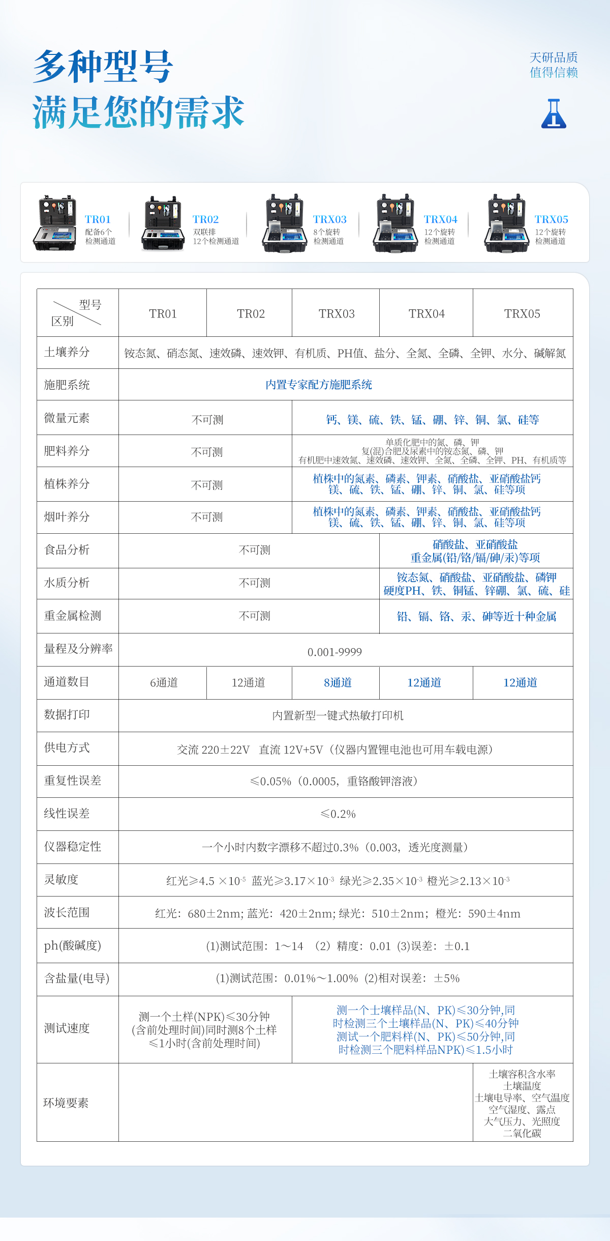 產(chǎn)品簡介:(新開發(fā),農(nóng)資經(jīng)銷商、農(nóng)技體系普及型)(新一代智能型,內(nèi)置測土配方施肥功能,圖譜診斷,二維碼打印,數(shù)據(jù)上傳,及測試用到的所有配件,保證用戶只需提供純凈水即可完成氮磷鉀有機質(zhì)pH含鹽量的準確測定?。┢放疲禾煅? 型號:TY-TR02產(chǎn)品簡介:配套齊全:該儀器集藥、器、儀為一體,攜帶方便,相當于一個