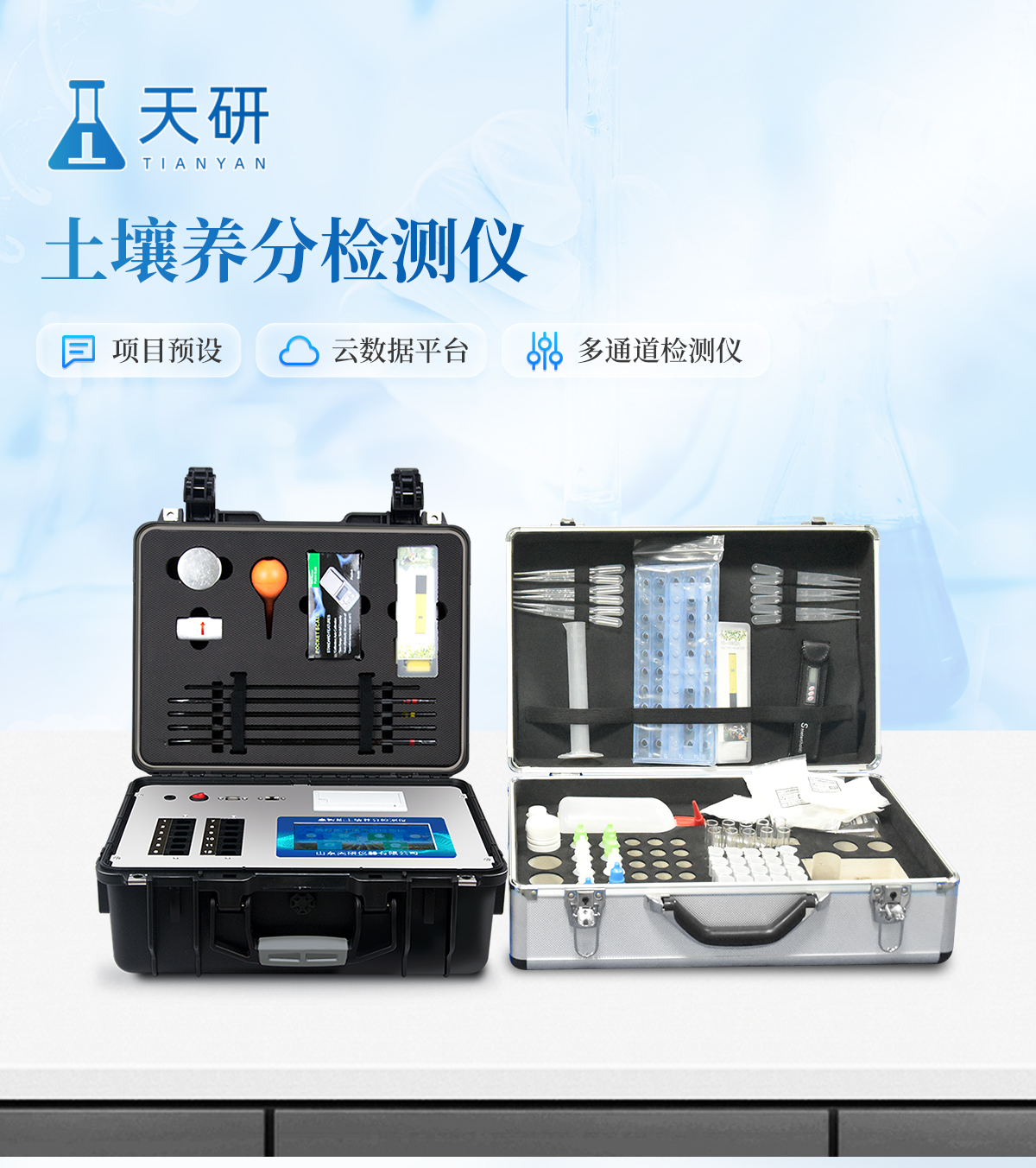 | 配套齊全:該儀器集藥、器、儀為一體,攜帶方便,相當于一個小型移動實驗室,無需用戶自配附件,亦可靈活野外流動測試。適于農(nóng)業(yè)服務部門或農(nóng)資經(jīng)銷商、合作社、肥料廠商、大種植戶測土施肥。 | 檢測功能全:測試項目國內(nèi)外全面,除標配試劑外,其他各類藥劑均可加配選購。 | 操作簡便、速度快捷,配套整套附件及成品藥劑開瓶即用,無須配置。 |