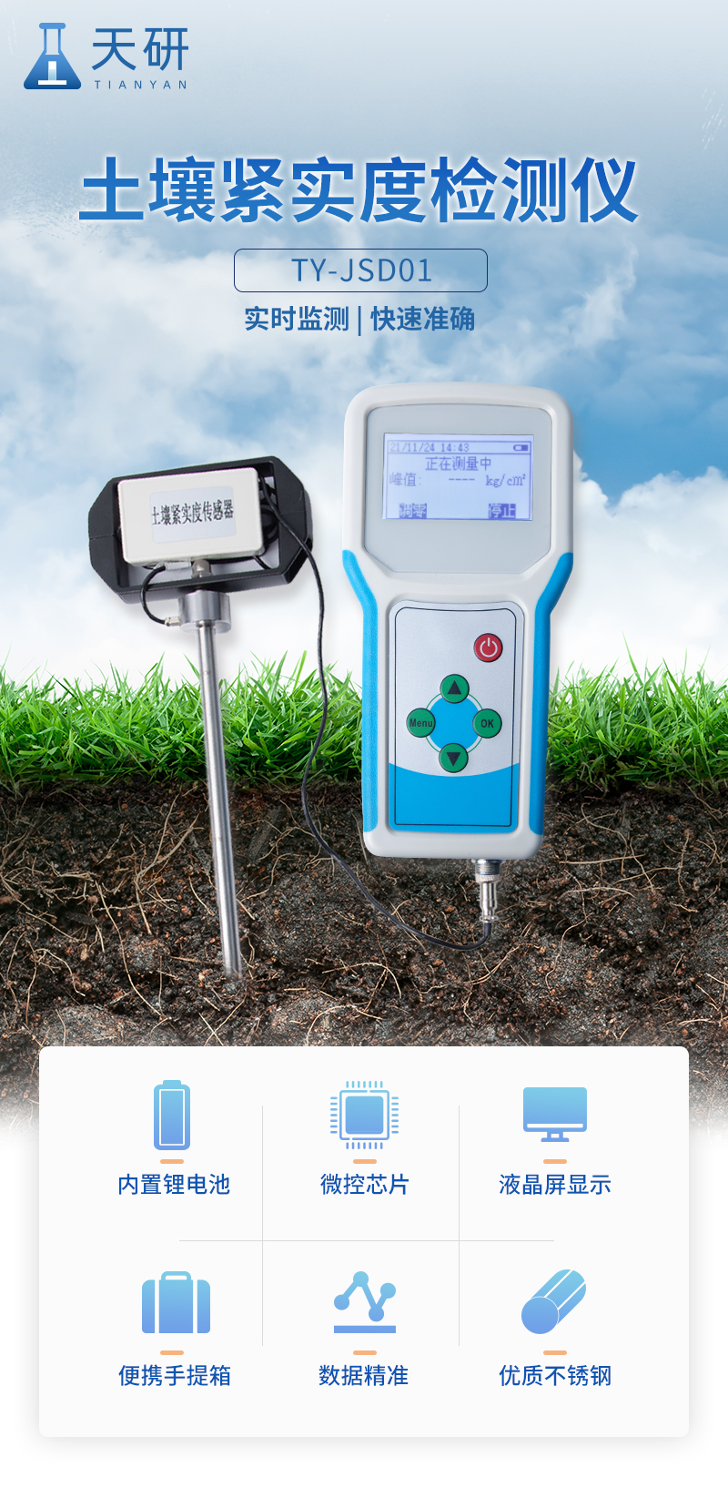 本設備是一種由手持式采集儀和緊實度傳感器所組成的一套土壤墑情監(jiān)測系統(tǒng)。同時具備操作簡便,攜帶方便,檢測迅速可靠等優(yōu)點,在領域中可謂獨樹一幟。手持式采集儀可根據(jù)用戶需要出廠配置GPS、GPRS數(shù)據(jù)上傳等功能,設備中的數(shù)據(jù)也可以通過USB數(shù)據(jù)線連接電腦,并將歷史數(shù)據(jù)導出到電腦中進行數(shù)據(jù)分析。