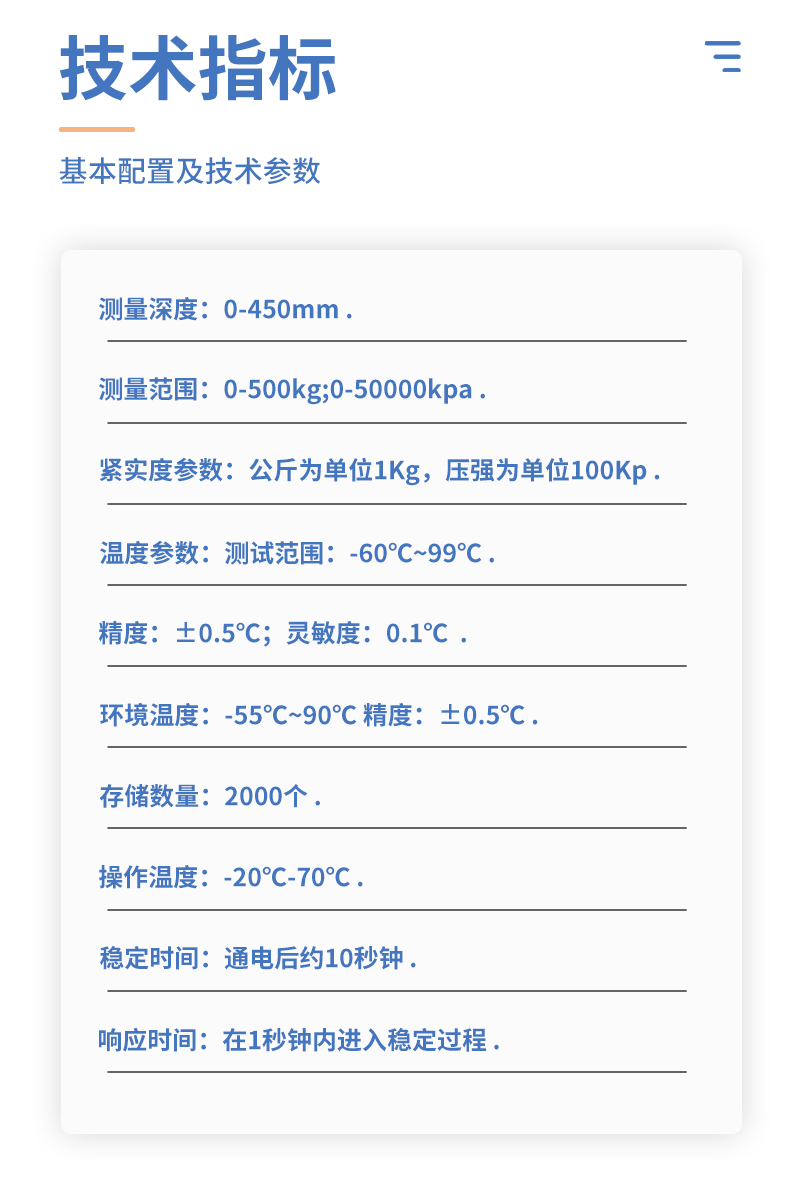| 顯示屏:2.4英寸彩色TFT液晶 | 接口:電源接頭:5.5*2.5/2.1;USB接口:連接電腦;航空插頭:RS485 | 存儲:大容量FLASH存儲器;可存儲10萬條數(shù)據(jù);自動存儲:1S~180S可調(diào) | 定位:GPS | GSM上傳:GPRS/2G/4G | 電池:12V 2500mah鋰電池;工作時間:10H;充電時間:3H | 導出:USB線連接電腦上位機,導出Excel表格 | 單位:kg/cm2;LB;N/cm2;Kpa | 土壤緊實度傳感器: | 量程:0~100kg | 靈敏度:2.0±0.1mv/V | 綜合精度:0.1%F?S | 重復性:±0.05%F?S | 工作溫度:-20~﹢70℃ | 探針材質(zhì):不銹鋼 | 輸入阻抗:735 ±35Ω | 輸出阻抗:700±3Ω | 非線性:±0.05 %F?S | 密封等級:IP66 | 激勵電壓:5~12 VDC | 線纜:φ3×2000mm |