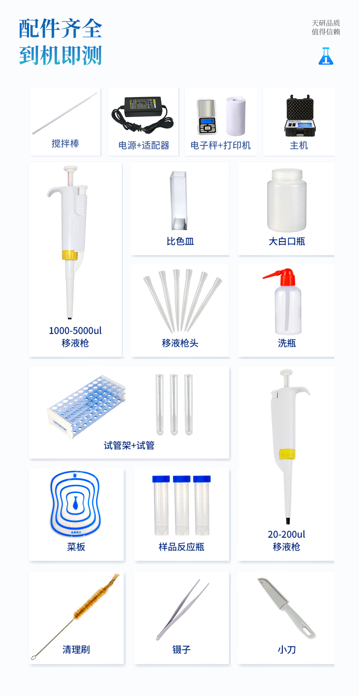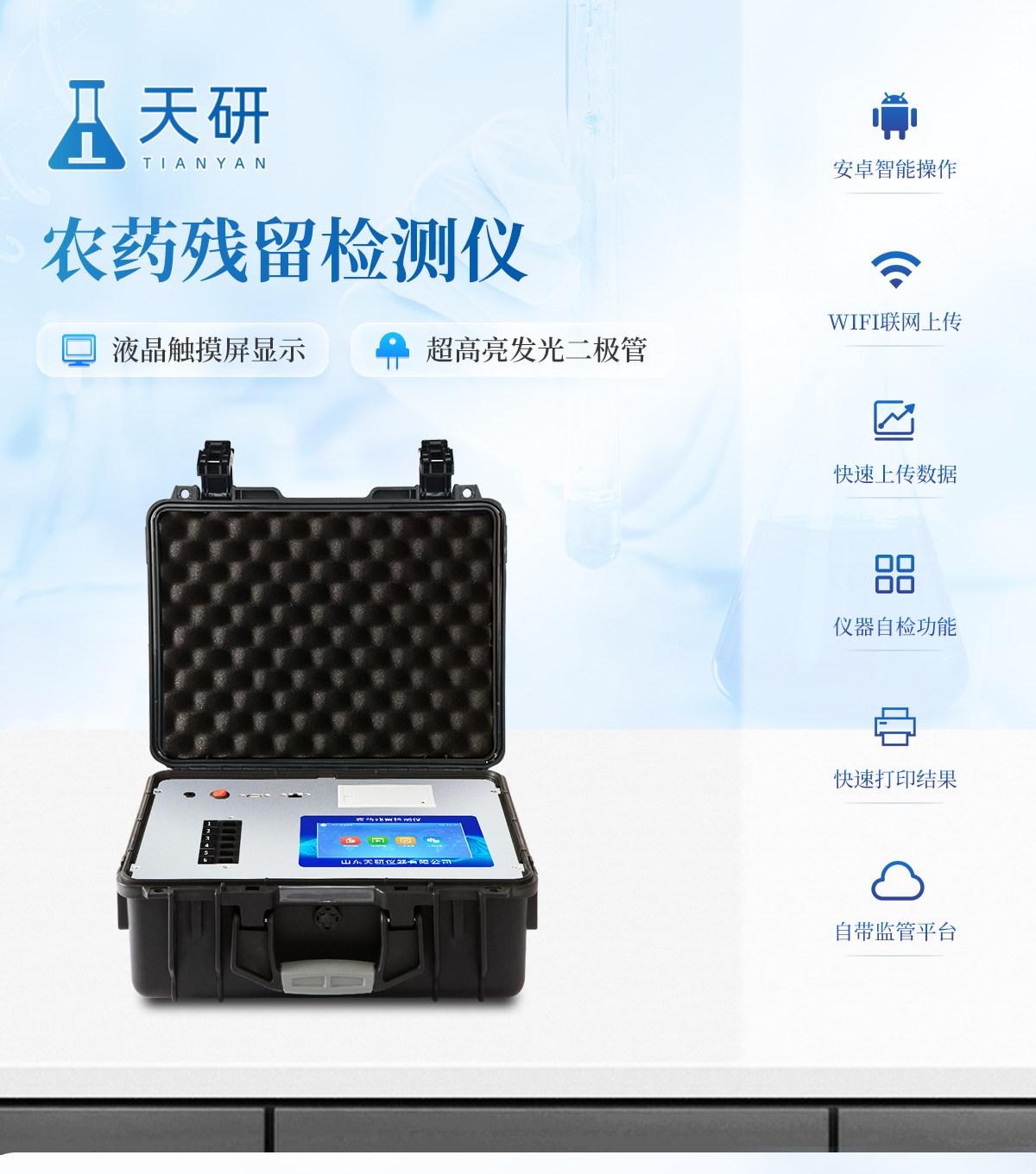 | 機箱采用工業(yè)級ABS工程塑料箱,方便攜帶,穩(wěn)固耐用,便于流動測試。 | 智能操作系統(tǒng),采用更加人性化操作,主控采用多核處理器,主頻1.88Ghz,運轉速度更快速,穩(wěn)定性更強。 | 自動判斷樣品是否合格,檢測結果更加直觀。 | 儀器具有100多種蔬菜名稱菜單庫,分類管理,并可按需添加或刪除蔬菜名,編輯蔬菜名稱,可直接打印出蔬菜名稱。 | 檢測通道:18個檢測通道,可以同時測試多個樣品,循環(huán)檢測,即放即檢,每個樣品由程序控制分別獨立工作,不會互相干擾。 | 儀器具有wifi聯(lián)網(wǎng)功能,可將數(shù)據(jù)快速上傳電腦,進行數(shù)據(jù)管理與統(tǒng)計,4G信號GPRS遠傳功能,可插手機卡實現(xiàn)數(shù)據(jù)遠傳平臺,。 | 顯示方式:7英寸高靈敏真彩觸摸屏顯示,人性化中文操作界面,讀數(shù)直觀、簡單。 | 打印機采用串口5v打印,可選擇手動打印或者自動打印,三分鐘出打印結果,打印格式為檢測人姓名、吸光度差值、檢測時間、檢測機構、樣品名稱及結果判定。 | 光源采用進口超高亮發(fā)光二極管,具有低功耗、高精度、穩(wěn)定性強、光源可控可以關掉不使用的光源,響應速度快等優(yōu)點。 | 智能恒流穩(wěn)壓,光強自動校準,長時間連續(xù)工作光源無溫漂現(xiàn)象。 | 采用USB2.0接口設計,方便數(shù)據(jù)的存貯和移動,并可隨時與計算機直接相連,并且可用計算機控制儀器。實現(xiàn)數(shù)據(jù)查詢、瀏覽、分析、統(tǒng)計、打印等。 | 智能化程度高,儀器具有自檢功能:具有開機自檢和調(diào)零功能,具有自動檢測重復性功能 | 儀器具有自身保護功能,可設置用戶名及密碼,防止非工作人員操作等。 | 采用DC12v直流供電,安全系統(tǒng)更高,并且配備6A鋰電池充電器。 | 儀器具有重新校準、鎖定、恢復出廠設置功能。 |