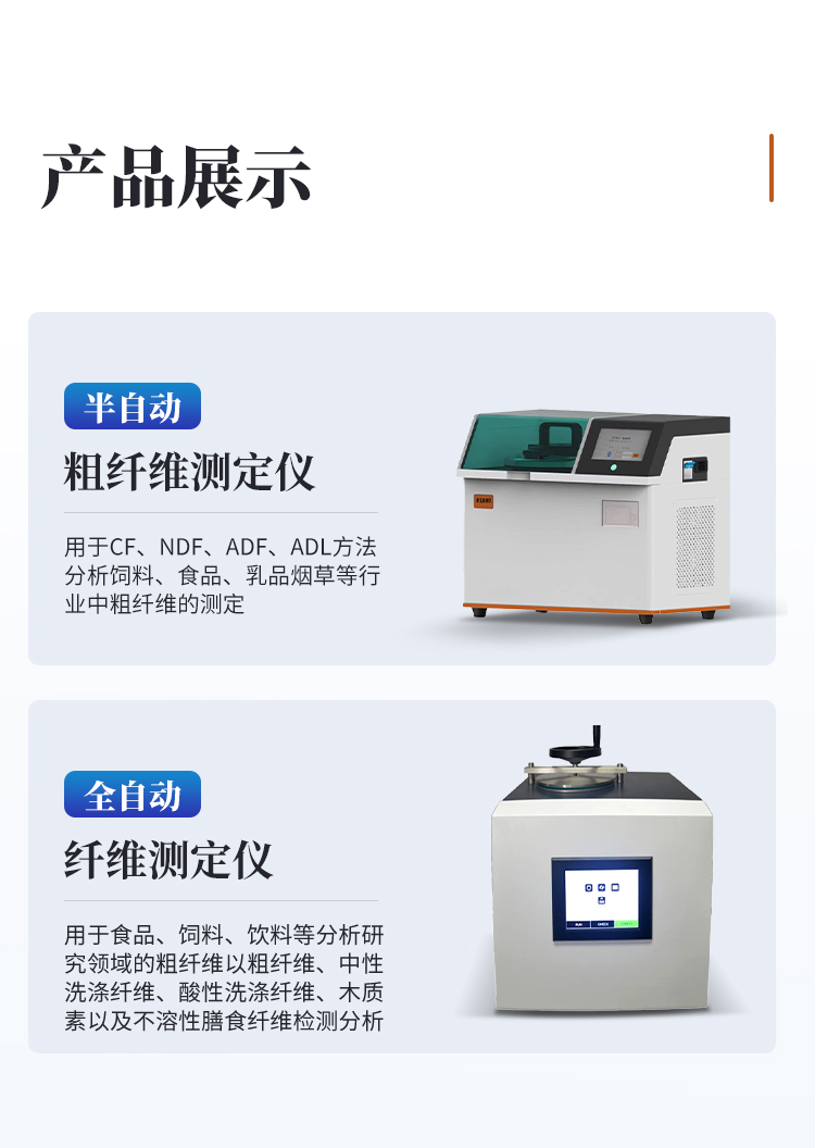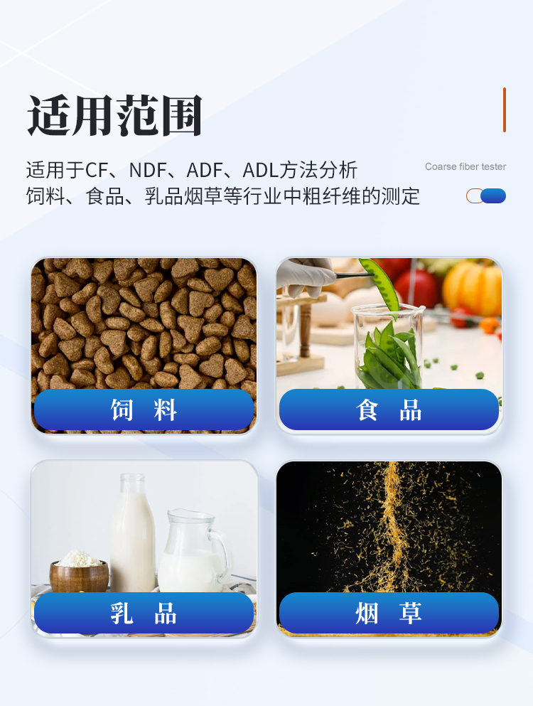 適用于食品、飼料、飲料等分析研究領(lǐng)域的粗纖維以粗纖維、中性洗滌纖維、酸性洗滌纖維、木質(zhì)素以及不溶性膳食纖維檢測分析。