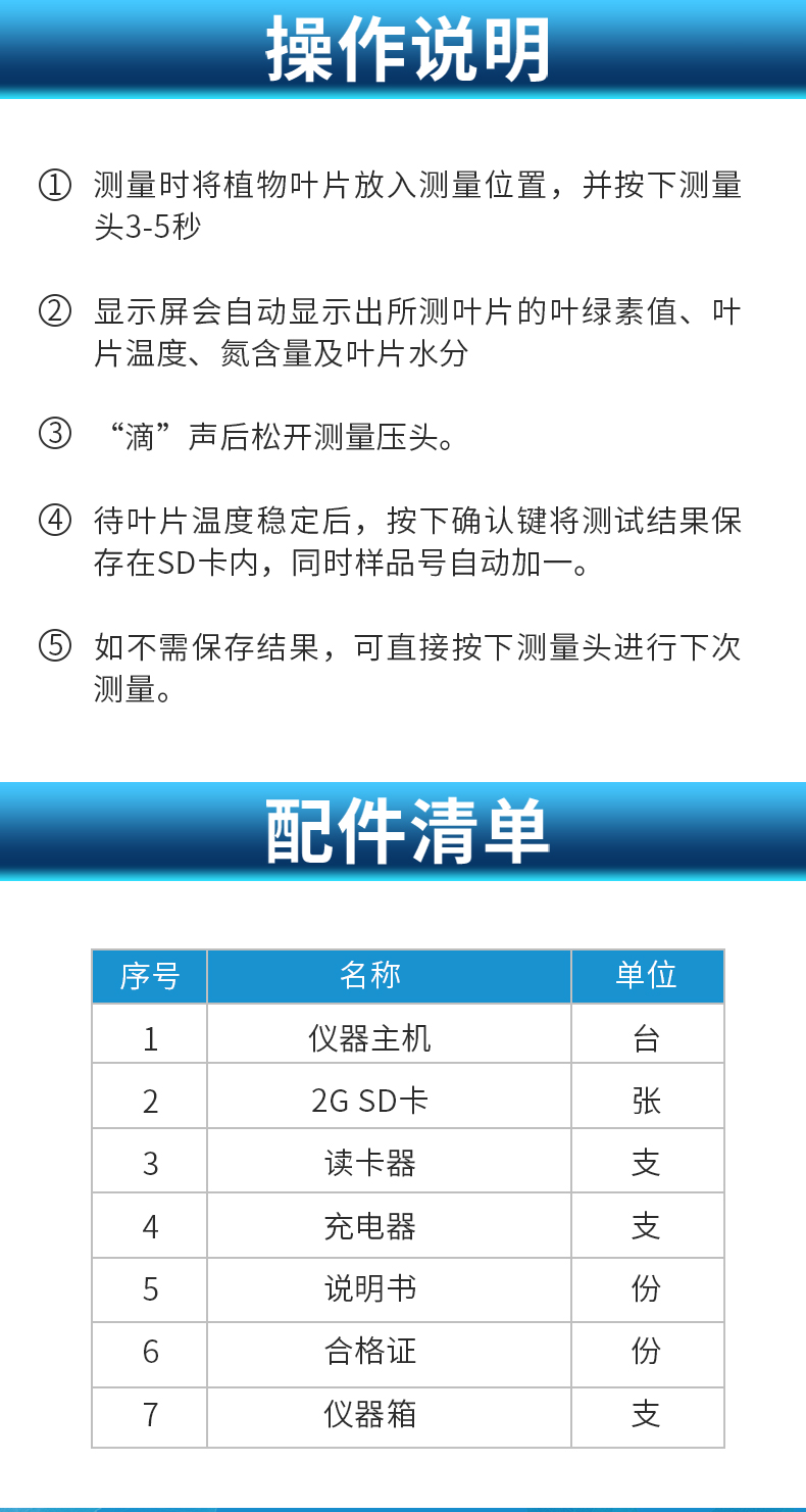 | 測(cè)量范圍 0.0-99.9 SPAD | 測(cè)量面積 2mm*2mm | 測(cè)量精度 ±1.0 SPAD單位以內(nèi) (室溫下,SPAD值介乎0-50) | 重復(fù)性 ±0.3 SPAD單位以內(nèi) (SPAD值介乎0-50) | 測(cè)量時(shí)間間隔 小于3秒 | 數(shù)據(jù)存儲(chǔ)容量 2GB | 電源 4.2V可充電鋰電池 | 電池容量 800mah | 重量 250g | 外形尺寸 140×85×45mm(長(zhǎng)×寬×高) | 工作及存儲(chǔ)環(huán)境 0℃-50℃;85%相對(duì)濕度 |