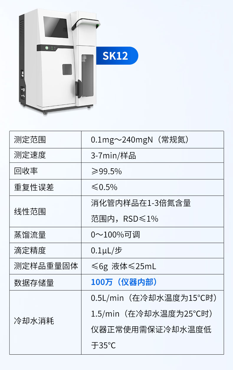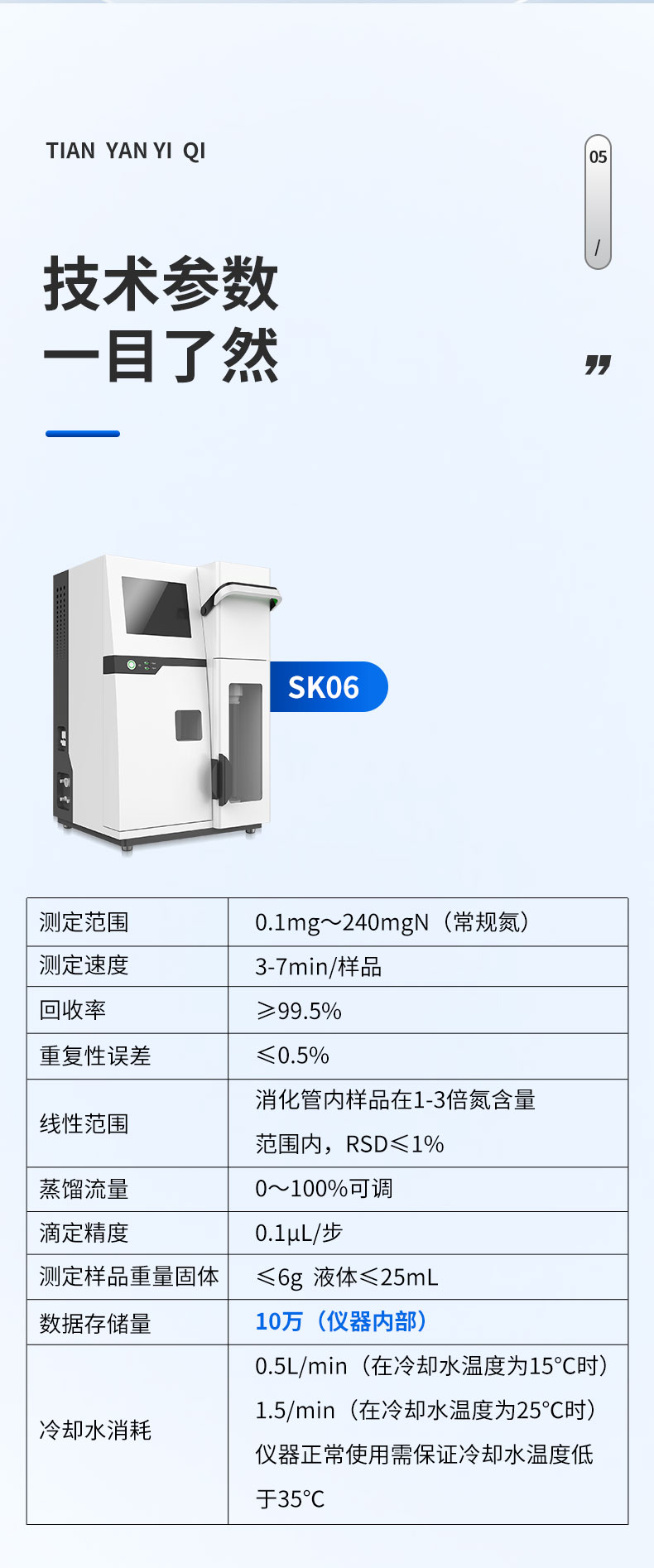 | 1.測(cè)定范圍:0.1mg~240mgN(常規(guī)氮) | 2.測(cè)定速度:3-7min/樣品 | 3.回收率:≥99.5% | 4.重復(fù)性誤差:≤0.5% | 5.線性范圍:消化管內(nèi)樣品在1-3倍氮含量范圍內(nèi),RSD≤1% | 6.蒸餾流量:0~100%可調(diào) | 7.☆滴定精度:0.1μL/步 | 8.測(cè)定樣品重量固體:≤6g 液體≤25mL | 9.☆數(shù)據(jù)存儲(chǔ)量:100萬(wàn)(儀器內(nèi)部) | 10.☆500組用戶自定義方案 | 11.冷卻水消耗:0.5L/min(在冷卻水溫度為15℃時(shí)),1.5/min(在冷卻水溫度為25℃時(shí));儀器正常使用需保證冷卻水溫度低于35℃。 |