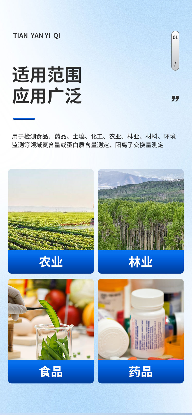 1.廣泛應(yīng)用于食品加工、飼料生產(chǎn)、煙草畜牧、土肥、環(huán)境監(jiān)測(cè)、醫(yī)藥、農(nóng)業(yè)、科研、教學(xué)、質(zhì)量監(jiān)督、檢驗(yàn)檢疫等領(lǐng)域氮含量或蛋白質(zhì)含量測(cè)定、陽(yáng)離子交換量測(cè)定。