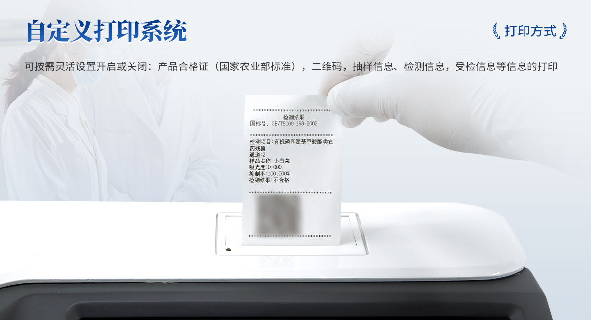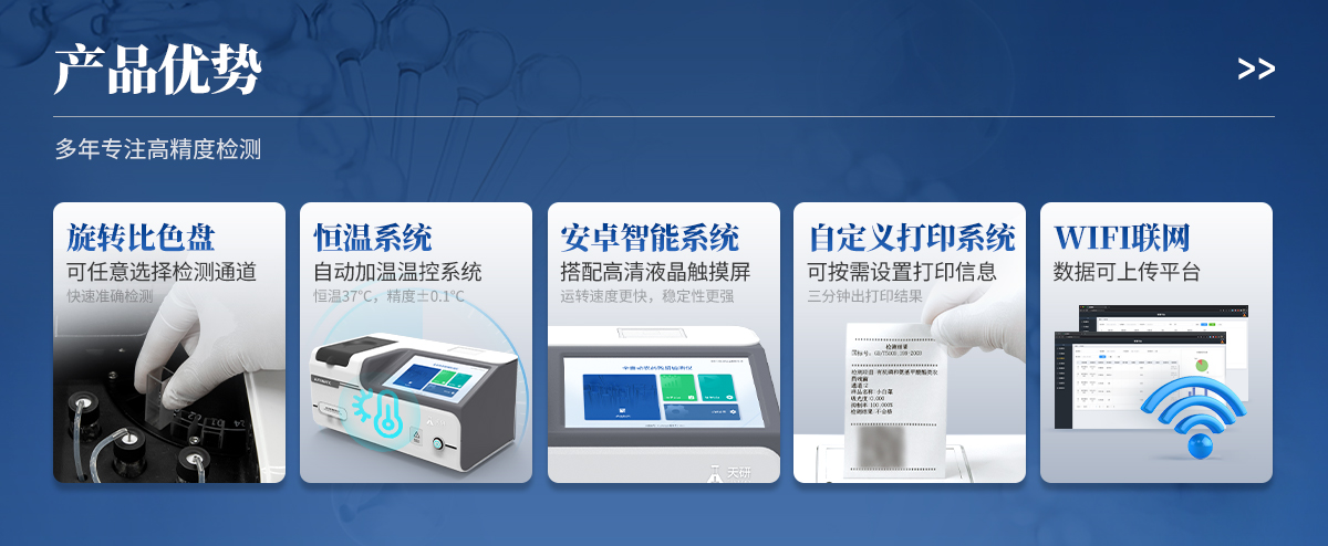 | 1. 試劑位置:3個 | 2. 檢測形式:旋轉24通道比色盤,可任意選擇檢測通道,自動對應選擇通道。 | 3. 系統(tǒng)配置:10.1寸高清液晶觸摸屏,采用ARM Cortex?-A7,RK3288/4核處理器,運行內存1GB。Android7.1.1 系統(tǒng)分辨率1280×800。 | 4.恒溫系統(tǒng):具有自動加溫溫控系統(tǒng),精準恒溫37℃,精度±0.1℃。 | 5.添加系統(tǒng):儀器按照試劑要求自動、按時、按量加入試劑,并且自動對未正常放置的樣本或異常的樣本進行檢查并提示。 | 6.清洗功能:儀器具備回流及自動清洗管路功能,避免試劑污染。 | 7.混勻功能:設備具備自動混勻功能。 | 8.光源校準:設備可自動校準,確保檢測準確度。 | 9.實時監(jiān)控:儀器測試過程中屏幕顯示運行狀態(tài),可實時查看。 | 10.數(shù)據(jù)存儲:內部存儲16GB,可存儲500萬條數(shù)據(jù)。 | 11.樣品多選功能:設備具備樣品一鍵多選功能,選擇樣品自動匹配檢測通道。 | 12.項目預設:可提前設置單個及多個相同或不相同的檢測任務,可單次或者多次調取,減少檢測時間。 | 13.自定義打印系統(tǒng):內置自定義打印系統(tǒng),可按需靈活設置開啟或關閉:產(chǎn)品合格證(國家農(nóng)業(yè)部標準),二維碼,抽樣信息、檢測信息,受檢信息等信息的打印。 | 14.A4版本報告打印功能:設備可自動生成A4版報告,A4報告帶二維碼,可掃描二維碼生成電子版,并可識別真?zhèn)巍?/td> | 15.傳輸方式:儀器配備無線通信模塊: 4G(APN)通訊模塊、Wifi模塊,藍牙傳輸模塊,同時具有USB接口以及RJ45接口能以多種方式實現(xiàn)數(shù)據(jù)保存和數(shù)據(jù)傳輸功能,設備數(shù)據(jù)可以同步上傳至平臺。 | 16.數(shù)據(jù)監(jiān)管系統(tǒng):設備自帶監(jiān)管平臺,并可同步對接監(jiān)管平臺,數(shù)據(jù)可局域網(wǎng)和互聯(lián)網(wǎng)數(shù)據(jù)上傳,檢測結果可直接傳至食品安全監(jiān)管平臺。達到食品安全問題預估、預警。 | 17.系統(tǒng)遠程更新功能:無需設備返廠,即可遠程實時升級全新系統(tǒng),節(jié)省時間成本及避免運輸造成設備損。 |