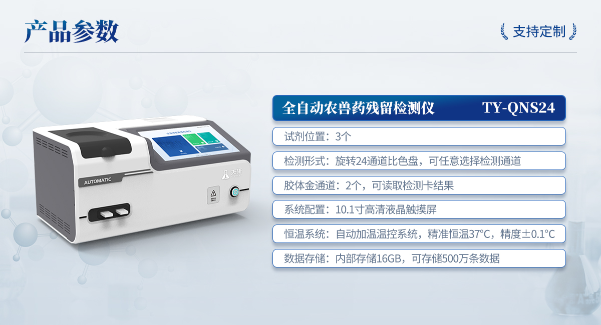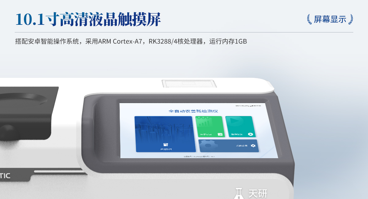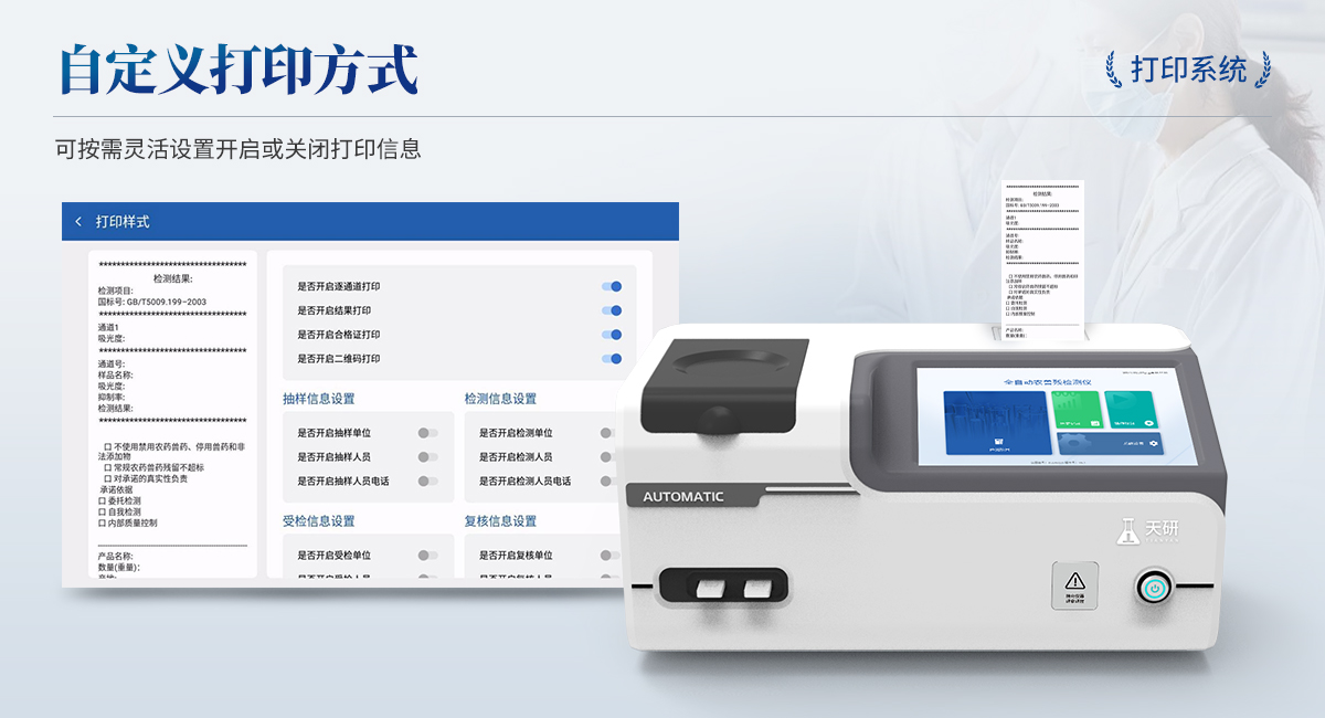 | 1. 試劑位置:3個(gè) | 2. 農(nóng)殘檢測盤:旋轉(zhuǎn)24通道比色盤,可任意選擇檢測通道,自動對應(yīng)選擇通道。 | 3. 膠體金通道:2個(gè),可讀取檢測卡結(jié)果,自動采集、處理分析,自動判斷檢測結(jié)果,并具備自動判空功能。 | 4.系統(tǒng)配置:10.1寸高清液晶觸摸屏,采用ARM Cortex?-A7,RK3288/4核處理器,運(yùn)行內(nèi)存1GB。Android7.1.1 系統(tǒng)分辨率1280×800。 | 5.恒溫系統(tǒng):具有自動加溫溫控系統(tǒng),精準(zhǔn)恒溫37℃,精度±0.1℃。 | 6.添加系統(tǒng):儀器按照試劑要求自動、按時(shí)、按量加入試劑,并且自動對未正常放置的樣本或異常的樣本進(jìn)行檢查并提示。 | 7.清洗功能:儀器具備回流及自動清洗管路功能,避免試劑污染。 | 8.混勻功能:設(shè)備具備自動混勻功能。 | 9.光源校準(zhǔn):設(shè)備可自動校準(zhǔn),確保檢測準(zhǔn)確度。 | 10.實(shí)時(shí)監(jiān)控:儀器測試過程中屏幕顯示運(yùn)行狀態(tài),可實(shí)時(shí)查看。 | 11.數(shù)據(jù)存儲:內(nèi)部存儲16GB,可存儲500萬條數(shù)據(jù)。 | 12.樣品多選功能:設(shè)備具備樣品一鍵多選功能,選擇樣品自動匹配檢測通道。 | 13.項(xiàng)目預(yù)設(shè):可提前設(shè)置單個(gè)及多個(gè)相同或不相同的檢測任務(wù),可單次或者多次調(diào)取,減少檢測時(shí)間。 | 14.自定義打印系統(tǒng):內(nèi)置自定義打印系統(tǒng),可按需靈活設(shè)置開啟或關(guān)閉:產(chǎn)品合格證(國家農(nóng)業(yè)部標(biāo)準(zhǔn)),二維碼,抽樣信息、檢測信息,受檢信息等信息的打印。 | 15.A4版本報(bào)告打印功能:設(shè)備可自動生成A4版報(bào)告,A4報(bào)告帶二維碼,可掃描二維碼生成電子版,并可識別真?zhèn)巍?/td> | 16.傳輸方式:儀器配備無線通信模塊: 4G(APN)通訊模塊、Wifi模塊,藍(lán)牙傳輸模塊,同時(shí)具有USB接口以及RJ45接口能以多種方式實(shí)現(xiàn)數(shù)據(jù)保存和數(shù)據(jù)傳輸功能,設(shè)備數(shù)據(jù)可以同步上傳至平臺。 | 17.系統(tǒng)17.數(shù)據(jù)監(jiān)管系統(tǒng):設(shè)備自帶監(jiān)管平臺,并可同步對接監(jiān)管平臺,數(shù)據(jù)可局域網(wǎng)和互聯(lián)網(wǎng)數(shù)據(jù)上傳,檢測結(jié)果可直接傳至食品安全監(jiān)管平臺。達(dá)到食品安全問題預(yù)估、預(yù)警。 | 18.系統(tǒng)遠(yuǎn)程更新功能:無需設(shè)備返廠,即可遠(yuǎn)程實(shí)時(shí)升級全新系統(tǒng),節(jié)省時(shí)間成本及避免運(yùn)輸造成設(shè)備損。 |