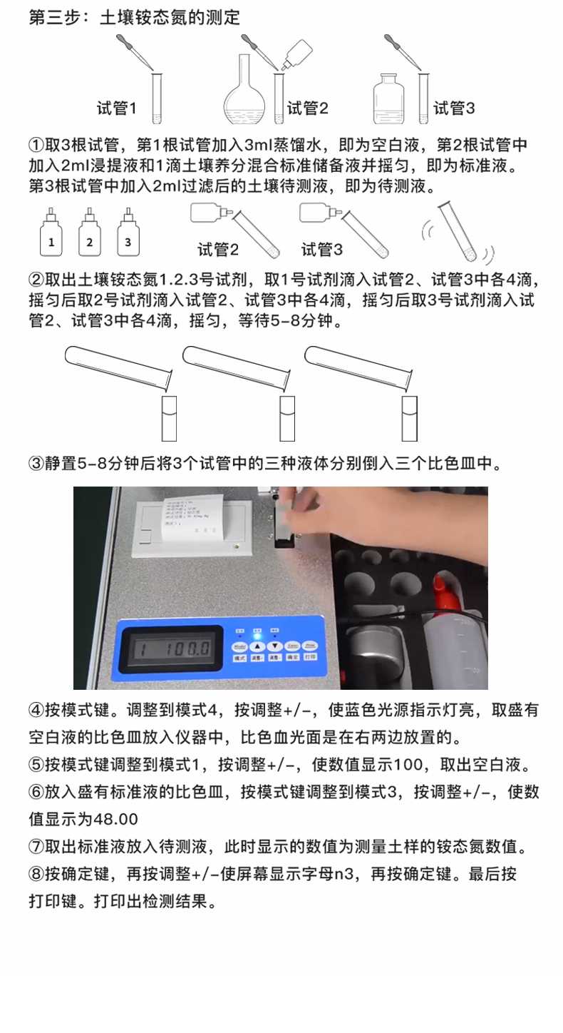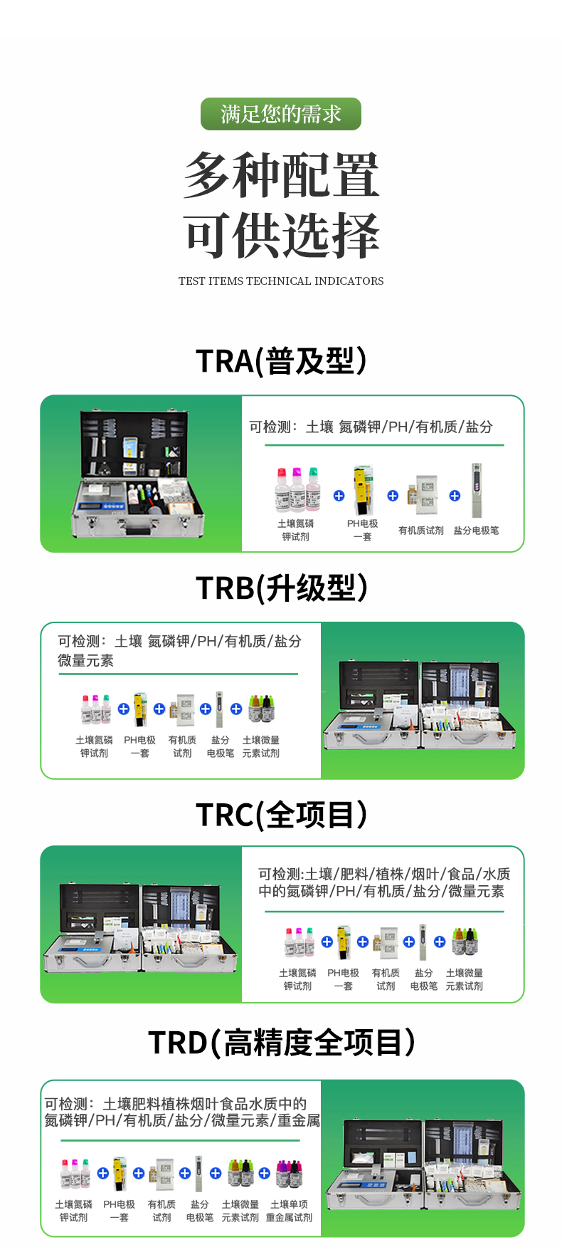 | 土壤養(yǎng)分:● 銨態(tài)氮、速效磷、速效鉀、水份、有機(jī)質(zhì)、酸堿度(pH試紙法)等項(xiàng); | 肥料養(yǎng)分:● 單質(zhì)化肥中的氮、磷、鉀; ● 復(fù)(混)合肥及尿素中的銨態(tài)氮、磷、鉀; ● 有機(jī)肥中速效氮、速效磷、速效鉀、全氮、全磷、全鉀、pH、有機(jī)質(zhì)等。 |