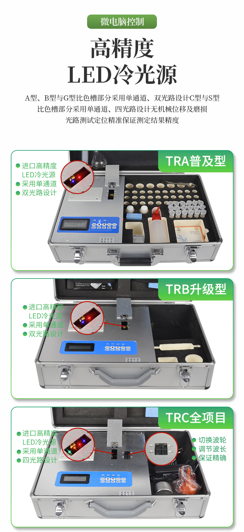 | 1、《機箱/藥劑一體式鋁合金機箱》設計,便于攜帶、堅固耐用,配套成品藥劑。 | 2、微電腦控制,數(shù)字化線路、程序化設計,液晶顯示,交直流兩用,可野外流動測試,**程度降低操作者的失誤和勞動強度。 | 3、分辨率:0.001,觸摸式按鍵,內置熱敏打印機,可打印測試結果。 | 4、可檢測土壤及化肥、有機肥、植株中的速效氮、有效磷、速效鉀、全氮、全磷、全鉀、有機質含量,土壤酸堿度,含鹽量,以及土壤鈣、鎂、硫、硼、氯、硅等6種中微量元素。 | 5、采用高亮度 LED 燈作為光源, 硅半導體作為信號接收系統(tǒng), 壽命長達10萬小時級別。光源穩(wěn)定,一致性好。 | 6、比色槽部分采用單通道、雙光路設計,無機械位移及磨損,光路測試定位**,保證測定結果精度。 |