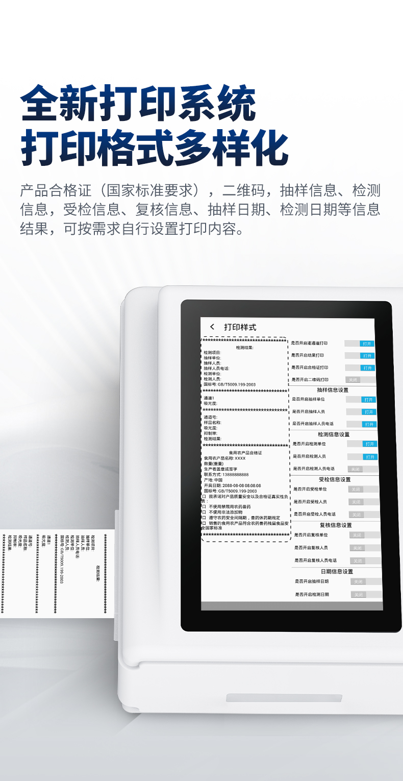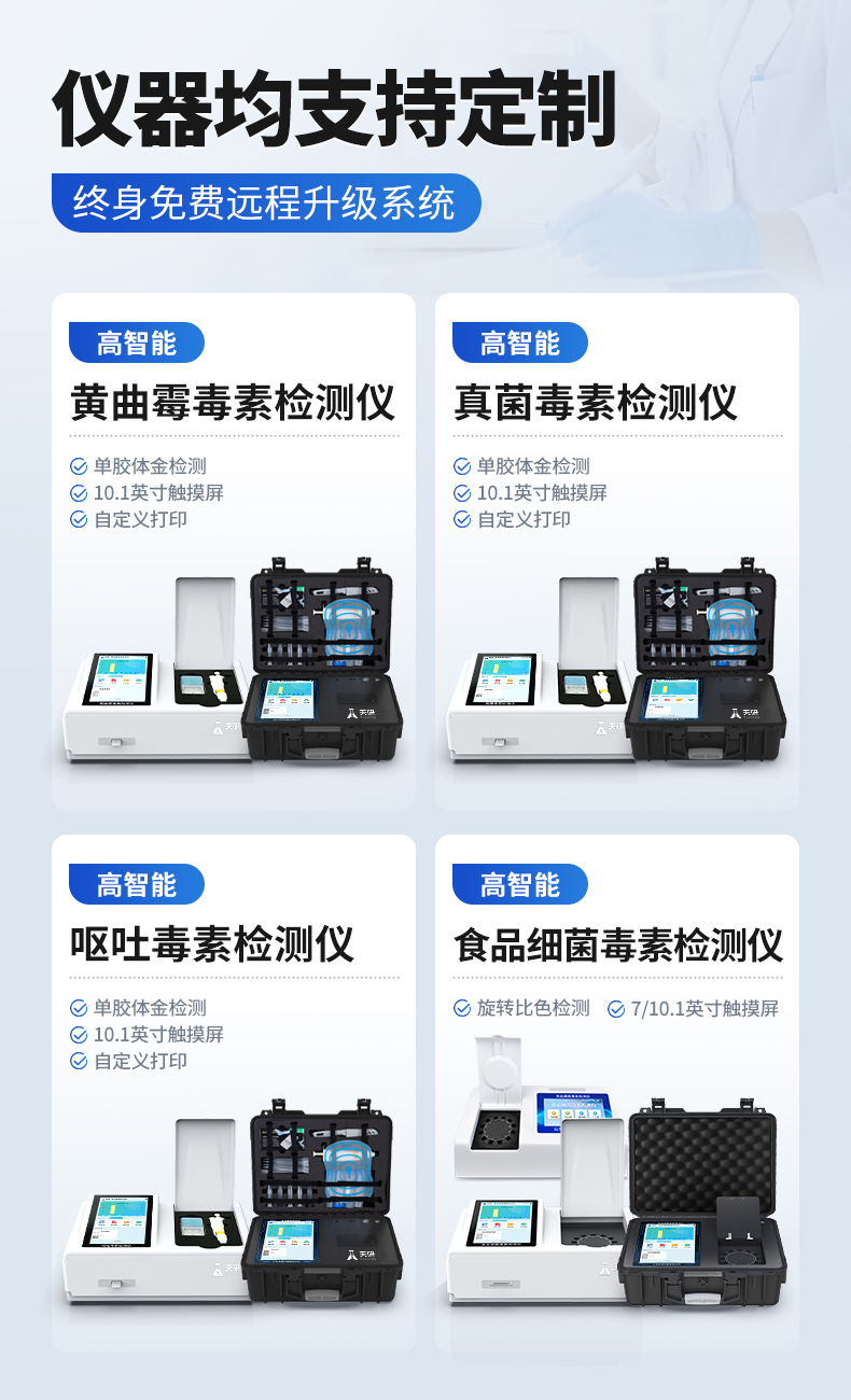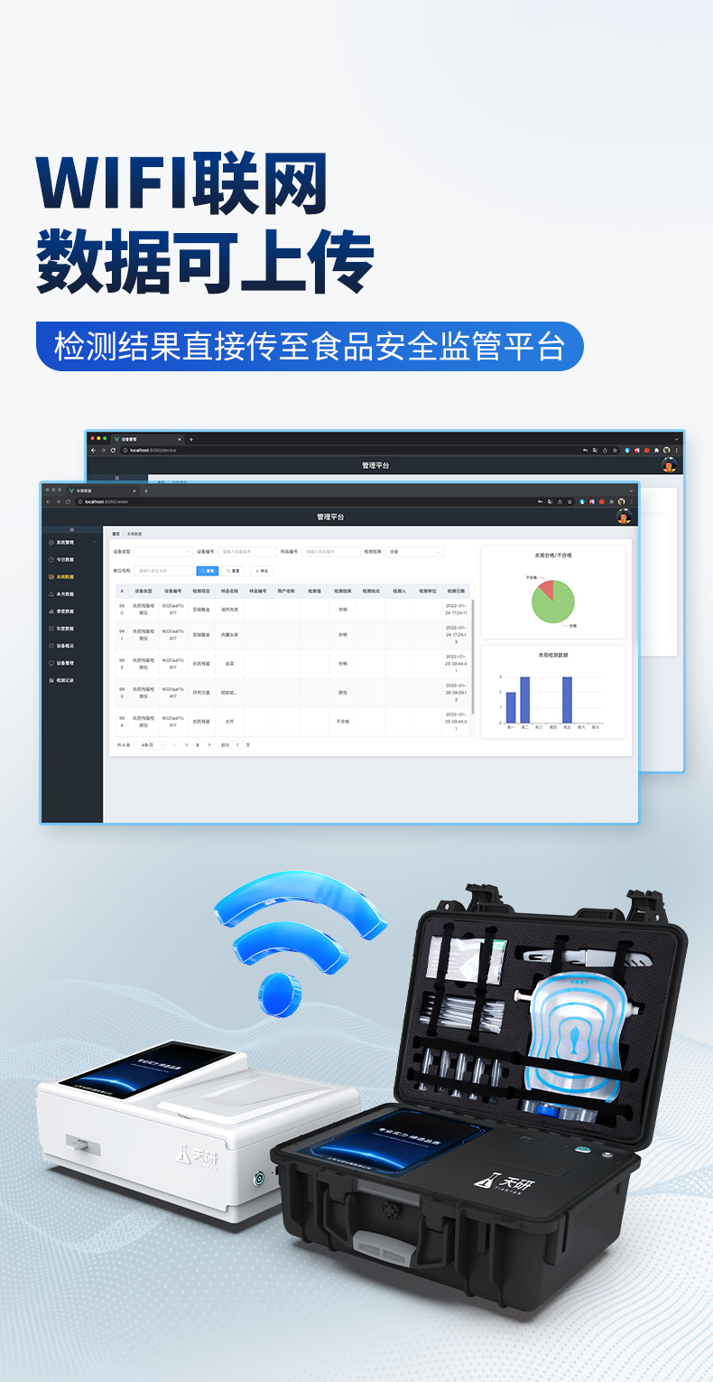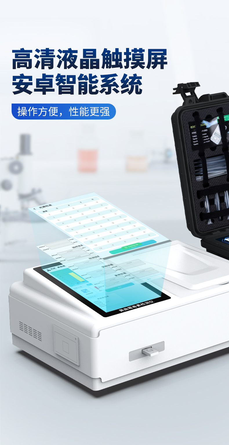 | 1、儀器采用10.1英寸液晶觸摸屏顯,搭配運(yùn)行安卓智能操作系統(tǒng),主控芯片采用ARM Cortex-A7,RK3288/4核處理器,主頻1.88Ghz,運(yùn)轉(zhuǎn)速度更快速,性能更強(qiáng)。 | 2、儀器功能包括:膠體金檢測模塊、數(shù)字化管理模塊、無線通訊模塊等,可以滿足同一軟件下實(shí)現(xiàn)所有檢測項(xiàng)目的檢測,并在同一窗口展示檢測結(jié)果。 | 3.一體化臺式快檢設(shè)備,采用交直流兩用供電方式,可連接車載電源,配備6ah大容量充電鋰電池,可以滿足現(xiàn)場及流動檢測使用的需求。儀器尺寸:43×35×20cm, 主機(jī)凈重:5.1kg | 4、系統(tǒng)自帶數(shù)據(jù)集成模塊,設(shè)備首頁自動統(tǒng)計(jì)檢測數(shù)據(jù)包含:周檢測數(shù)據(jù)、月檢測數(shù)據(jù),全部檢測總數(shù)量,均包含檢測總數(shù),合格數(shù),不合格數(shù),以及相關(guān)柱形分析圖,對各項(xiàng)檢測數(shù)據(jù)清晰掌握,無需電腦查詢,更加快捷直觀。 | 5、儀器具有任務(wù)預(yù)設(shè)模塊,可在樣品送檢前提前預(yù)設(shè)樣品名稱、檢測指標(biāo)、送檢單位等信息,樣品送檢時(shí)一鍵調(diào)取保存信息,檢測更加方便快捷。 | 6、膠體金檢測模塊: | 直插式自動掃描方式,可實(shí)時(shí)顯示金標(biāo)卡實(shí)時(shí)圖像,系統(tǒng)自動分析并呈現(xiàn)出CT曲線圖,CT線自動識別,無需手動調(diào)整,完成檢測后自動退出檢測卡。 | 結(jié)果判定線可修改,對照值標(biāo)定值可保存,斷電不丟失數(shù)據(jù)。 | 兼容市場上其他膠體金卡,使用耗材不受限制,極大增強(qiáng)用戶使用體驗(yàn)。 | 7、儀器檢測系統(tǒng)擁有龐大數(shù)據(jù)庫,并且構(gòu)建了完善的檢索、修訂功能。食品庫涵蓋多種樣品名稱,可按需添加或刪除、編輯樣品名稱;產(chǎn)品數(shù)據(jù)庫以及歷史檢測記錄支持一鍵檢索功能。 | 8、系統(tǒng)打印自定義化,打印格式多樣化,產(chǎn)品合格證(國家標(biāo)準(zhǔn)要求),二維碼,抽樣信息、檢測信息,受檢信息、復(fù)核信息、抽樣日期、檢測日期等信息結(jié)果,可按需求自行設(shè)置打印內(nèi)容。 | 9、A4紙版本報(bào)告打印功能(可選配):設(shè)備擁有兩種結(jié)果展示方式,可以自動生成A4打印模板和小票打印模板兩種樣式,可通過WiFi及網(wǎng)線等方式鏈接外置打印機(jī)可進(jìn)行打印 | 10、儀器具有 wifi 聯(lián)網(wǎng)上傳、RJ45網(wǎng)線連接功能,可以快速上傳數(shù)據(jù)。同步對接監(jiān)管平臺,數(shù)據(jù)可局域網(wǎng)和互聯(lián)網(wǎng)數(shù)據(jù)上傳,檢測結(jié)果直接傳至食品安全監(jiān)管平臺。進(jìn)行區(qū)域食品安全監(jiān)管及大數(shù)據(jù)分析處理與數(shù)據(jù)統(tǒng)計(jì),檢測區(qū)域食品安全長短期動態(tài),達(dá)到食品安全問題預(yù)估、預(yù)警。 | 11、設(shè)備支持U盤存儲,標(biāo)準(zhǔn)USB接口,免驅(qū)動安裝。檢測結(jié)果存儲容量20萬條以上,可生成Excel表格,進(jìn)行一鍵拷貝,并具有登錄保護(hù)功能,可設(shè)置用戶名及密碼,規(guī)范不同人員操作權(quán)限,防止非工作人員操作,并且可以進(jìn)行重新校準(zhǔn)、鎖定、恢復(fù)出廠設(shè)置功能。儀器固件可升級,后期檢測項(xiàng)目可擴(kuò)充。 | 12、儀器具備遠(yuǎn)程升級功能,可定向分客戶分儀器更新,開機(jī)后自動更新,并可持續(xù)性免費(fèi)更新系統(tǒng)版本,無需像傳統(tǒng)產(chǎn)品返廠更新,節(jié)省時(shí)間及人力成本并避免了物流運(yùn)輸返廠升級導(dǎo)致設(shè)備損壞的潛在風(fēng)險(xiǎn)。 |