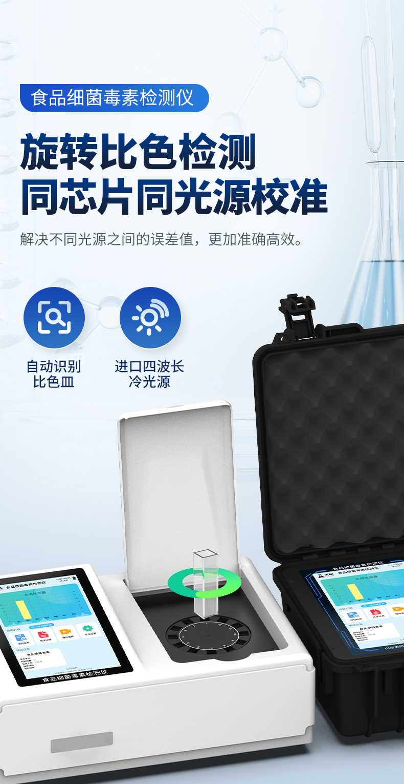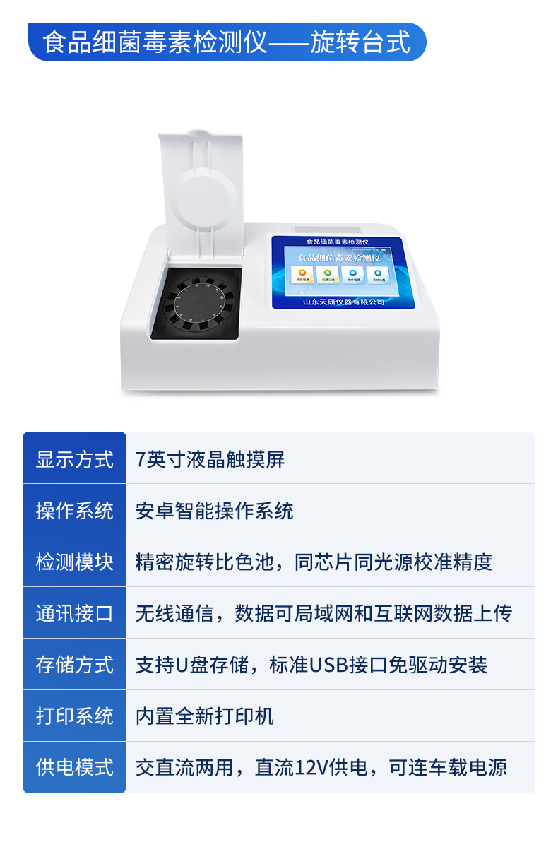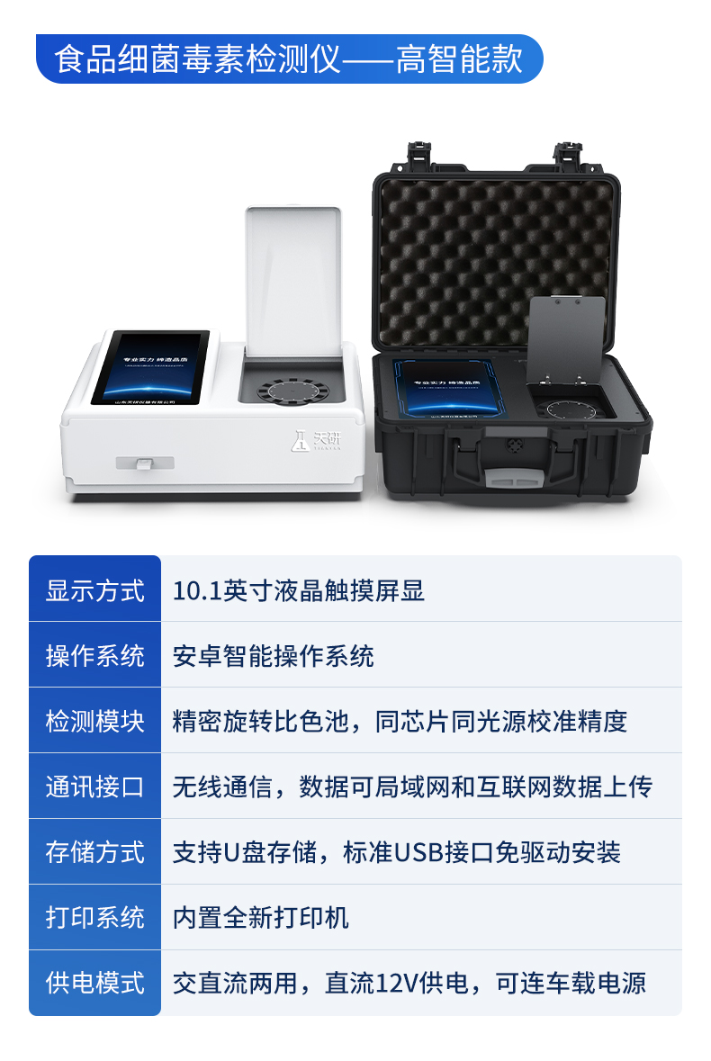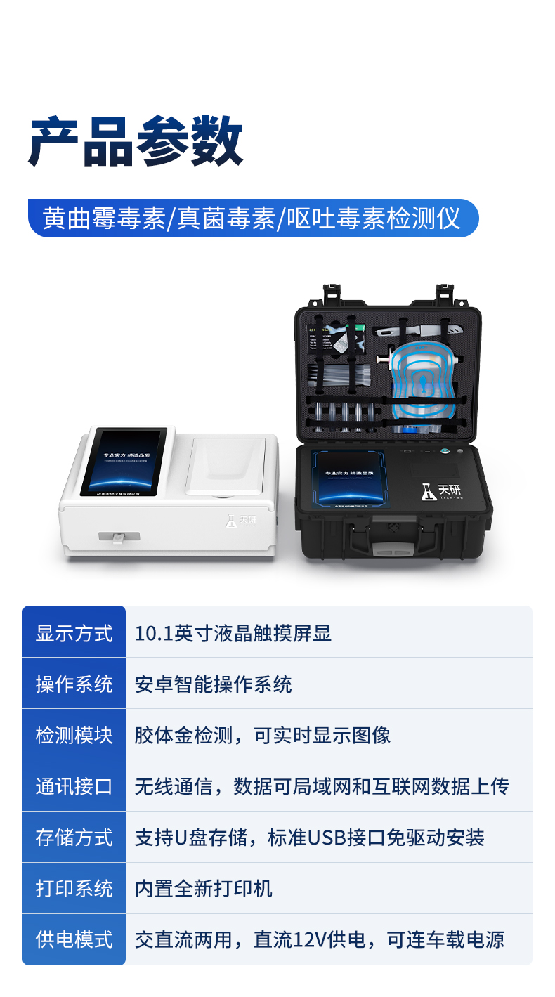 | 1、儀器采用10.1英寸液晶觸摸屏顯,搭配運(yùn)行安卓智能操作系統(tǒng),主控芯片采用ARM Cortex-A7,RK3288/4核處理器,主頻1.88Ghz,運(yùn)轉(zhuǎn)速度更快速,性能更強(qiáng)。 | 2、儀器功能包括:膠體金檢測模塊、數(shù)字化管理模塊、無線通訊模塊等,可以滿足同一軟件下實(shí)現(xiàn)所有檢測項(xiàng)目的檢測,并在同一窗口展示檢測結(jié)果。 | 3.一體化臺式快檢設(shè)備,采用交直流兩用供電方式,可連接車載電源,配備6ah大容量充電鋰電池,可以滿足現(xiàn)場及流動檢測使用的需求。儀器尺寸:43×35×20cm, 主機(jī)凈重:5.1kg | 4、系統(tǒng)自帶數(shù)據(jù)集成模塊,設(shè)備首頁自動統(tǒng)計(jì)檢測數(shù)據(jù)包含:周檢測數(shù)據(jù)、月檢測數(shù)據(jù),全部檢測總數(shù)量,均包含檢測總數(shù),合格數(shù),不合格數(shù),以及相關(guān)柱形分析圖,對各項(xiàng)檢測數(shù)據(jù)清晰掌握,無需電腦查詢,更加快捷直觀。 | 5、儀器具有任務(wù)預(yù)設(shè)模塊,可在樣品送檢前提前預(yù)設(shè)樣品名稱、檢測指標(biāo)、送檢單位等信息,樣品送檢時(shí)一鍵調(diào)取保存信息,檢測更加方便快捷。 | 6、膠體金檢測模塊: | 直插式自動掃描方式,可實(shí)時(shí)顯示金標(biāo)卡實(shí)時(shí)圖像,系統(tǒng)自動分析并呈現(xiàn)出CT曲線圖,CT線自動識別,無需手動調(diào)整,完成檢測后自動退出檢測卡。 | 結(jié)果判定線可修改,對照值標(biāo)定值可保存,斷電不丟失數(shù)據(jù)。 | 兼容市場上其他膠體金卡,使用耗材不受限制,極大增強(qiáng)用戶使用體驗(yàn)。 | 7、儀器檢測系統(tǒng)擁有龐大數(shù)據(jù)庫,并且構(gòu)建了完善的檢索、修訂功能。食品庫涵蓋多種樣品名稱,可按需添加或刪除、編輯樣品名稱;產(chǎn)品數(shù)據(jù)庫以及歷史檢測記錄支持一鍵檢索功能。 | 8、系統(tǒng)打印自定義化,打印格式多樣化,產(chǎn)品合格證(國家標(biāo)準(zhǔn)要求),二維碼,抽樣信息、檢測信息,受檢信息、復(fù)核信息、抽樣日期、檢測日期等信息結(jié)果,可按需求自行設(shè)置打印內(nèi)容。 | 9、A4紙版本報(bào)告打印功能(可選配):設(shè)備擁有兩種結(jié)果展示方式,可以自動生成A4打印模板和小票打印模板兩種樣式,可通過WiFi及網(wǎng)線等方式鏈接外置打印機(jī)可進(jìn)行打印 | 10、儀器具有 wifi 聯(lián)網(wǎng)上傳、RJ45網(wǎng)線連接功能,可以快速上傳數(shù)據(jù)。同步對接監(jiān)管平臺,數(shù)據(jù)可局域網(wǎng)和互聯(lián)網(wǎng)數(shù)據(jù)上傳,檢測結(jié)果直接傳至食品安全監(jiān)管平臺。進(jìn)行區(qū)域食品安全監(jiān)管及大數(shù)據(jù)分析處理與數(shù)據(jù)統(tǒng)計(jì),檢測區(qū)域食品安全長短期動態(tài),達(dá)到食品安全問題預(yù)估、預(yù)警。 | 11、設(shè)備支持U盤存儲,標(biāo)準(zhǔn)USB接口,免驅(qū)動安裝。檢測結(jié)果存儲容量20萬條以上,可生成Excel表格,進(jìn)行一鍵拷貝,并具有登錄保護(hù)功能,可設(shè)置用戶名及密碼,規(guī)范不同人員操作權(quán)限,防止非工作人員操作,并且可以進(jìn)行重新校準(zhǔn)、鎖定、恢復(fù)出廠設(shè)置功能。儀器固件可升級,后期檢測項(xiàng)目可擴(kuò)充。 | 12、儀器具備遠(yuǎn)程升級功能,可定向分客戶分儀器更新,開機(jī)后自動更新,并可持續(xù)性免費(fèi)更新系統(tǒng)版本,無需像傳統(tǒng)產(chǎn)品返廠更新,節(jié)省時(shí)間及人力成本并避免了物流運(yùn)輸返廠升級導(dǎo)致設(shè)備損壞的潛在風(fēng)險(xiǎn)。 |