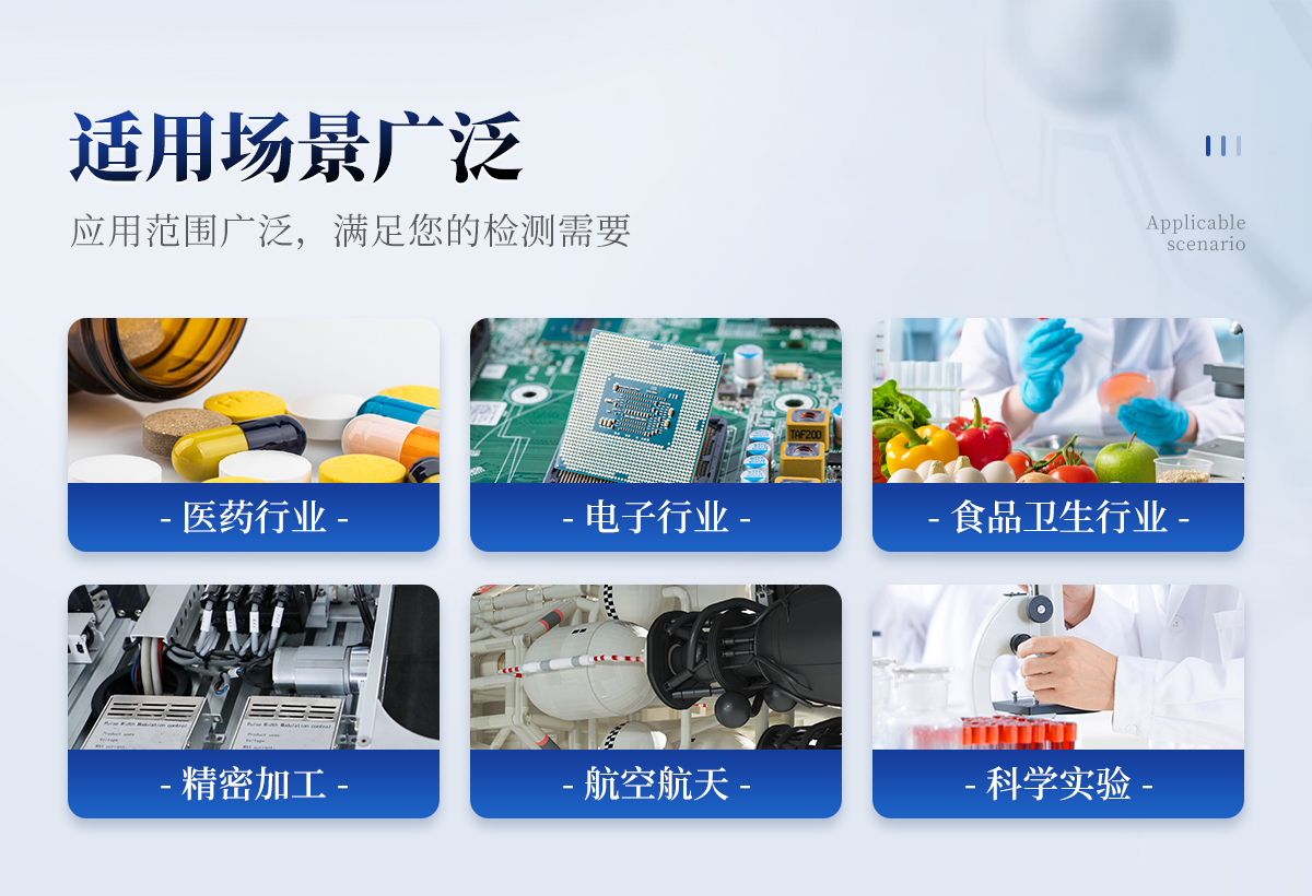 滿足醫(yī)藥行業(yè)(制藥廠、藥檢所、醫(yī)院手術(shù)室等);電子行業(yè)(半導(dǎo)體工廠、精密機(jī)械的生產(chǎn)加工等);食品衛(wèi)生行業(yè)(乳制品、塑封肉食品、調(diào)味食品、農(nóng)產(chǎn)品等的精加工);過(guò)濾器的生產(chǎn)廠家,檢驗(yàn)過(guò)濾器的質(zhì)量及效率等;光學(xué)、及航空航天等領(lǐng)域的精加工、精密試驗(yàn)所需的潔凈室(區(qū))的檢測(cè)需要。