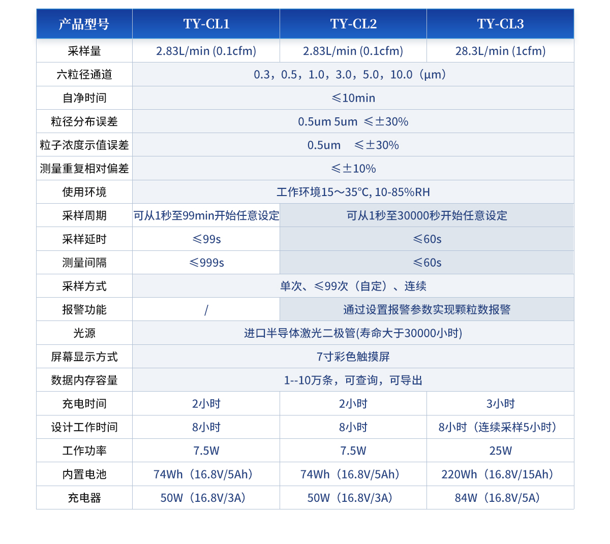 | 采樣量:2.83L/min (0.1cfm) | 六粒徑通道:0.3,0.5,1.0,3.0,5.0,10.0(μm) | 自凈時(shí)間:≤10min | 粒徑分布誤差:0.5um 5um ≤±30% | 粒子濃度示值誤差:0.5um ≤±30% | 測(cè)量重復(fù)相對(duì)偏差:≤±10% | 使用環(huán)境:工作環(huán)境15~35℃, 10-85%RH | 采樣周期:可從1秒至30000秒開(kāi)始任意設(shè)定 | 采樣延時(shí):≤60s | 測(cè)量間隔:≤60s | 采樣方式:?jiǎn)未?、?9次(自定)、連續(xù) | 報(bào)警功能:通過(guò)設(shè)置報(bào)警參數(shù)實(shí)現(xiàn)顆粒數(shù)報(bào)警 | 光源:進(jìn)口半導(dǎo)體激光二極管(壽命大于30000小時(shí)) | 屏幕顯示方式:7寸彩色觸摸屏 | 數(shù)據(jù)內(nèi)存容量:1--10萬(wàn)條,可查詢,可導(dǎo)出。 | 充電時(shí)間:2小時(shí) | 設(shè)計(jì)工作時(shí)間:8小時(shí) | 平均功率:7.5W | 內(nèi)置電池:74Wh(16.8V/5Ah) | 充電器:50W(16.8V/3A) |