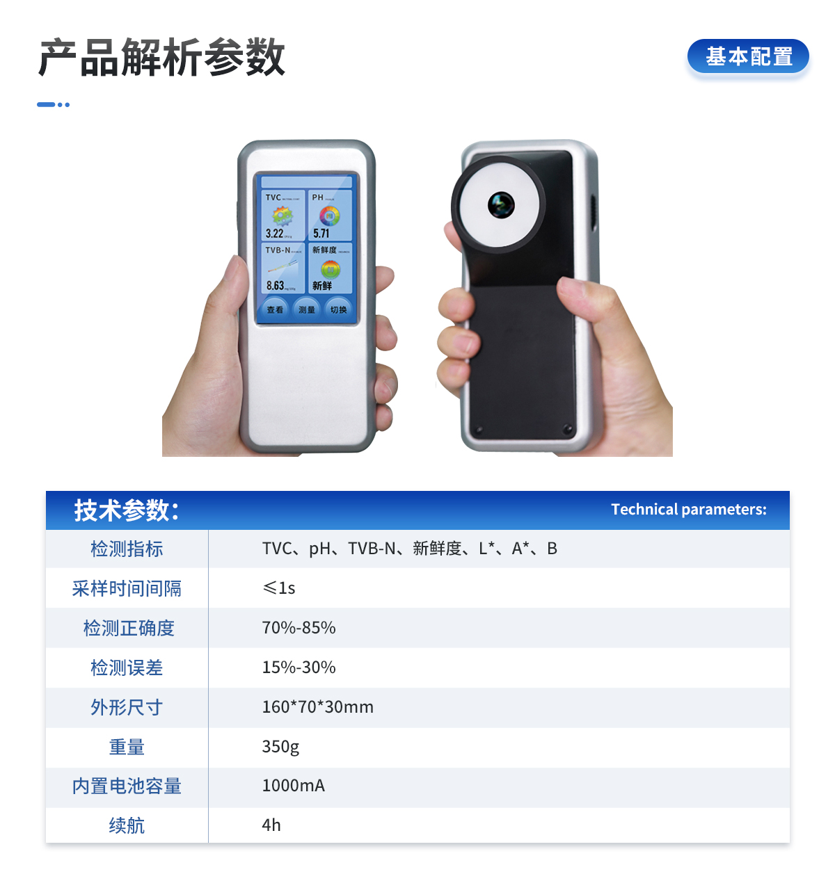 | 1. ※檢測指標:TVC、pH、TVB-N、新鮮度、L*、A*、B | 2. 采樣時間間隔:≤1s | 3. 檢測正確度:70%-85% | 4. 檢測誤差:15%-30% | 10. 外形尺寸:160*70*30mm | 11. 重量:350g | 12. 內(nèi)置電池容量:1000mA | 13. 續(xù)航:4h |
