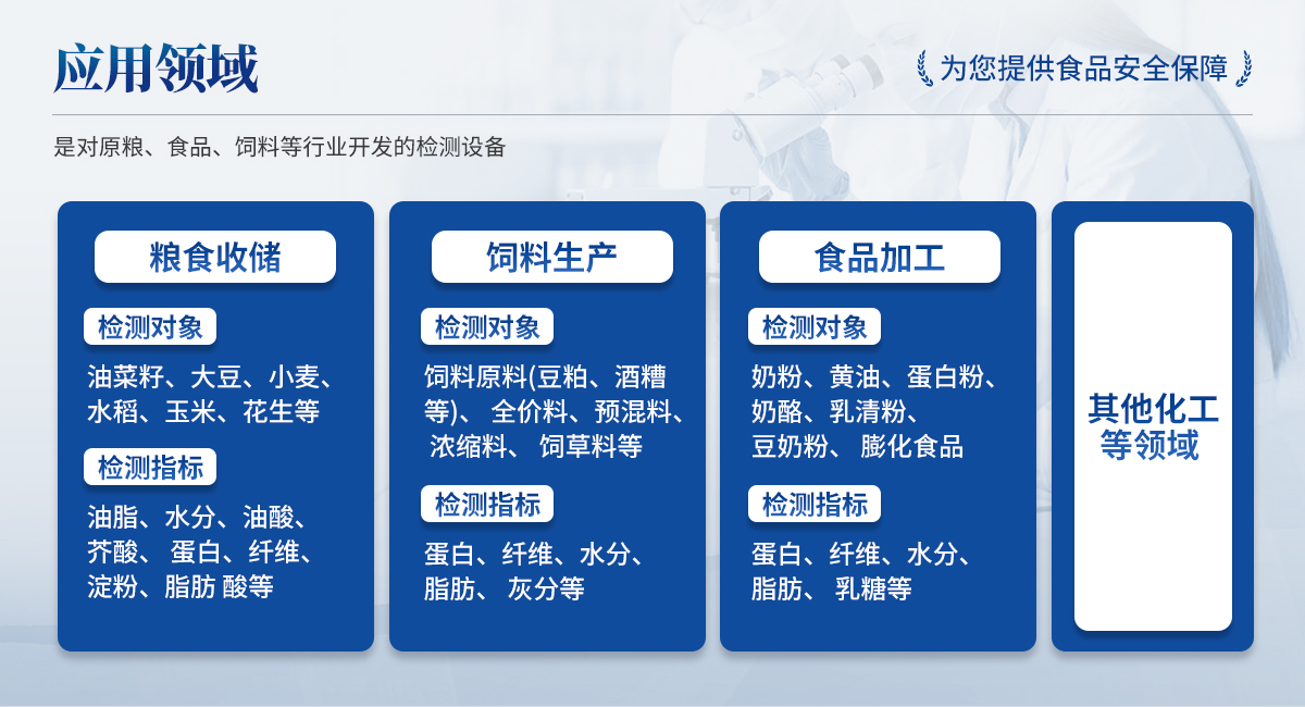 檢測(cè)對(duì)象:奶粉、黃油、奶酪、乳清粉、豆奶粉、蛋白粉、膨化食品; 檢測(cè)指標(biāo):蛋白、纖維、水分、脂肪、乳糖等; | ◆ 其他化工等領(lǐng)域 |