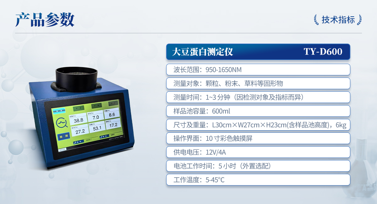| 波長(zhǎng)范圍:950-1650nm | 測(cè)量對(duì)象:顆粒、粉末、草料等固形物 | 測(cè)量時(shí)間:1~3 分鐘(因檢測(cè)對(duì)象及指標(biāo)而異) | 樣品池容量:600ml | 尺寸及重量:L30cm×W27cm×H23cm(含樣品池高度),6kg | 操作界面:10 寸彩色觸摸屏 | 供電電壓:12V/4A | 電池工作時(shí)間:5 小時(shí)(外置選配) | 工作溫度:5-45℃ |