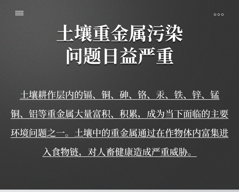 簡(jiǎn)述: 土壤重金屬污染問(wèn)題日益嚴(yán)重,造成土壤耕作層內(nèi)的鎘、銅、砷、鉻、汞、鐵、鋅、錳、銅、鋁等重金屬大量富積、積累,成為當(dāng)下面臨的主要環(huán)境問(wèn)題之一。土壤中的重金屬通過(guò)在作物體內(nèi)富集進(jìn)入食物鏈,對(duì)人畜健康造成嚴(yán)重威脅。有色金屬礦山的開(kāi)采、 工業(yè)“三廢”的排放、含重金屬?gòu)U棄物堆積、農(nóng)業(yè)生產(chǎn)中