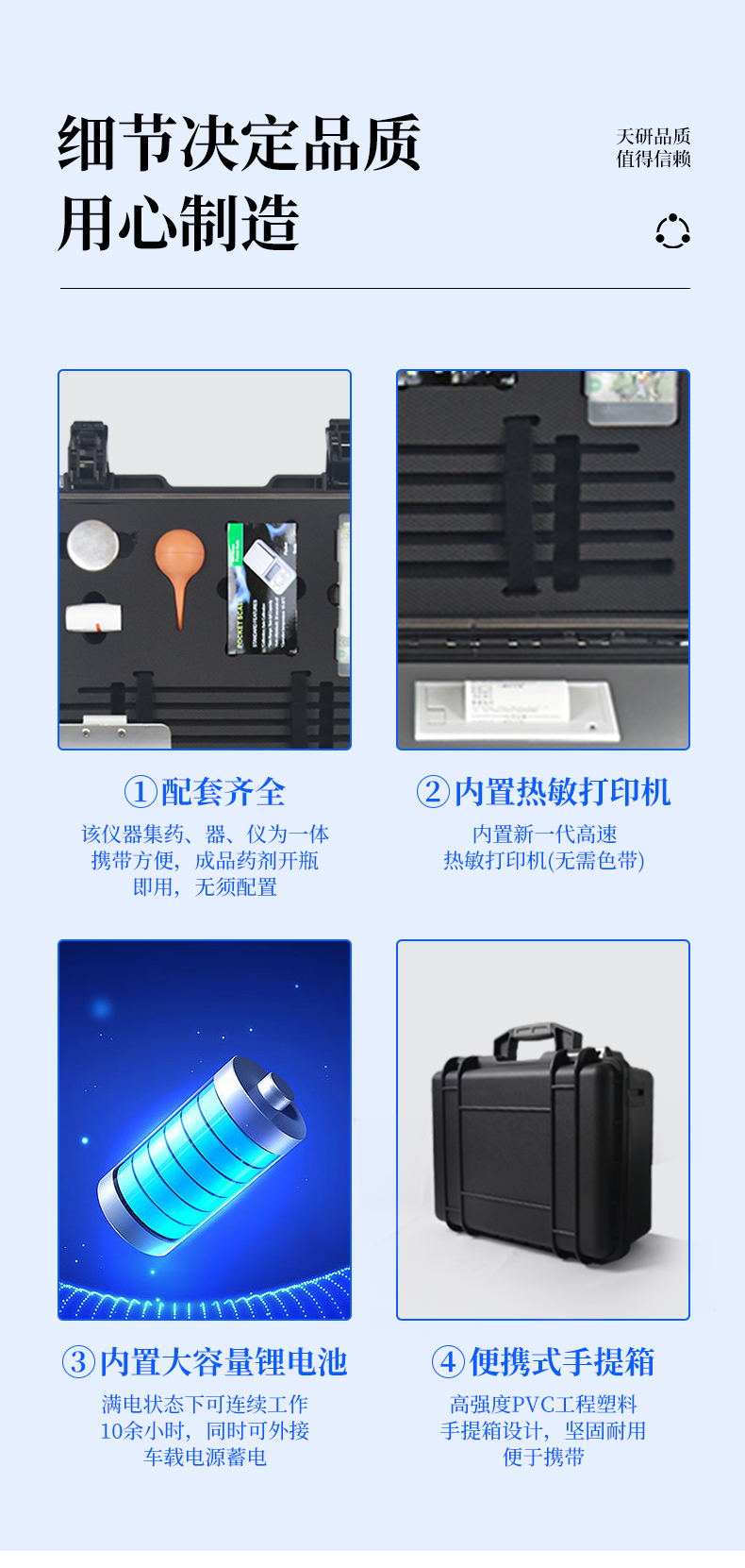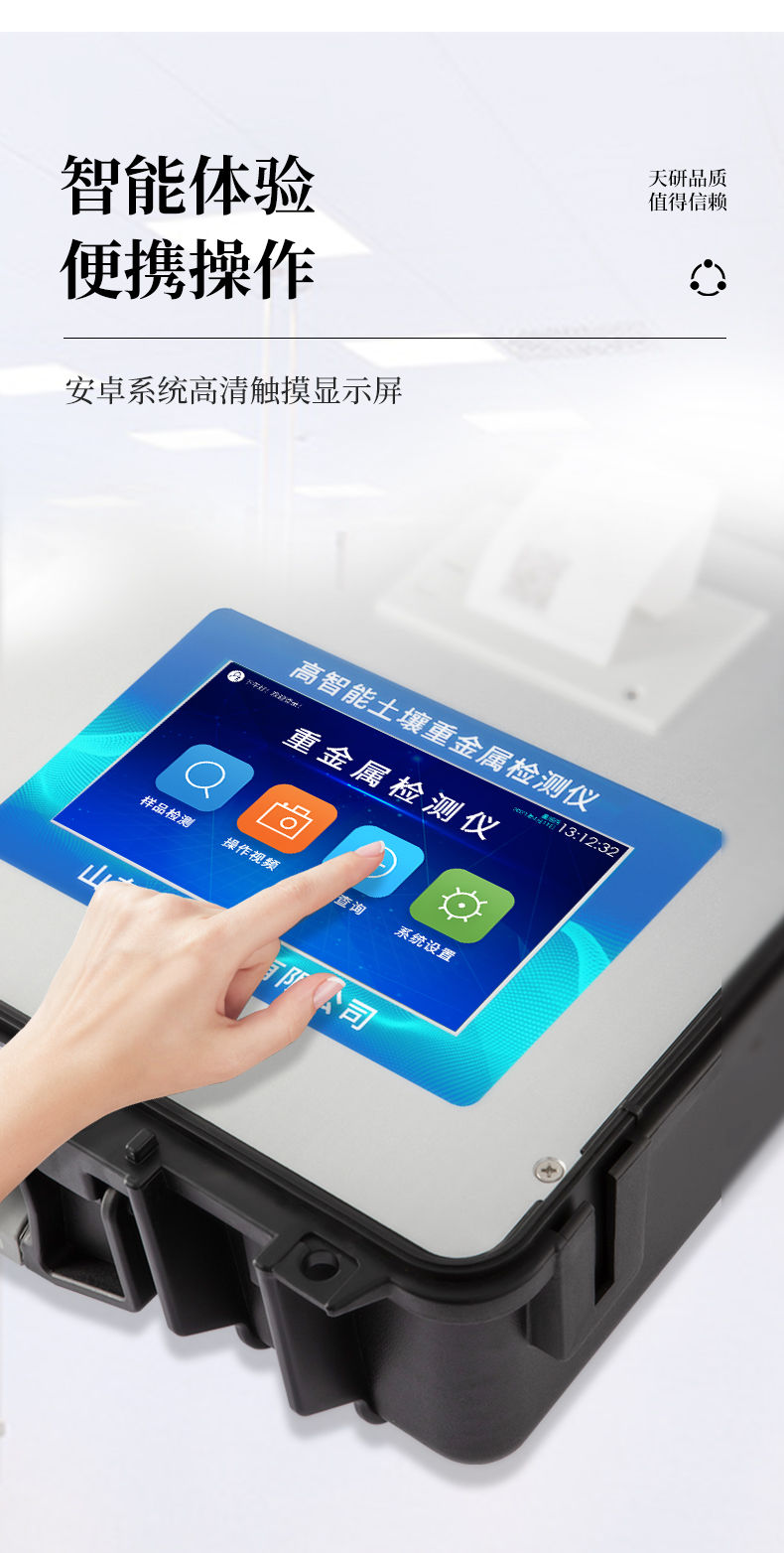 | Android安卓智能操作系統(tǒng),主控芯片采用ARM Cortex-A7,RK3288/4核處理器,主頻1.88Ghz,運(yùn)轉(zhuǎn)速度更快速,穩(wěn)定性更強(qiáng)。 | 采用精密旋轉(zhuǎn)比色池設(shè)計(jì),光源一致性更加**,保證檢測(cè)精度。 | 12個(gè)旋轉(zhuǎn)檢測(cè)通道,一次性可快速檢測(cè)12個(gè)樣品,極大提升檢測(cè)效率,降低檢測(cè)成本。 | 采用高精度濾光片技術(shù)自主**分析方法(**號(hào):ZL 2018 2 1777724.7),**認(rèn)證。 | 檢測(cè)過(guò)程中內(nèi)置校準(zhǔn)功能,智能恒流穩(wěn)壓,光強(qiáng)自動(dòng)校準(zhǔn),確保檢測(cè)準(zhǔn)確度。 | 儀器標(biāo)配wifi無(wú)線上傳、4G聯(lián)網(wǎng)傳輸、GPRS無(wú)線遠(yuǎn)傳,快速上傳數(shù)據(jù)。 | 配有云平臺(tái),儀器連入無(wú)線網(wǎng)絡(luò)后,可將檢測(cè)數(shù)據(jù)可選擇性或批量無(wú)線上傳,方便用戶進(jìn)行長(zhǎng)期數(shù)據(jù)管理和可視化分析。 | 儀器配同時(shí)具有USB接口、以太網(wǎng)接口,內(nèi)置大容量?jī)?nèi)存,并可隨時(shí)用U盤(pán)拷貝數(shù)據(jù)。 | 可用手機(jī)隨時(shí)登錄云平臺(tái)在線移動(dòng)查看歷史數(shù)據(jù) | 4波長(zhǎng)專業(yè)測(cè)試?yán)涔庠?紅、藍(lán)、綠、橙),光源波長(zhǎng)穩(wěn)定,長(zhǎng)時(shí)間連續(xù)工作光源無(wú)溫漂現(xiàn)象,壽命長(zhǎng)達(dá)10萬(wàn)小時(shí)級(jí)別,重現(xiàn)性好,準(zhǔn)確度高。 | 比色池部分采用標(biāo)準(zhǔn)1cm比色皿,無(wú)機(jī)械位移及磨損,光路測(cè)試定位**,有效屏蔽外光干擾,保證檢測(cè)結(jié)果優(yōu)于國(guó)標(biāo)要求。 | 儀器系統(tǒng)內(nèi)帶有樣品前處理操作視頻,各種樣品檢測(cè)方法點(diǎn)擊視頻模塊即可觀看,檢測(cè)人員無(wú)需自學(xué)說(shuō)明書(shū),指導(dǎo)教學(xué)方便快速,方便新手快速操作 | 內(nèi)置新一代高速熱敏打印機(jī)(無(wú)需色帶),打印內(nèi)容包含:檢測(cè)單位、檢測(cè)人員、檢測(cè)項(xiàng)目、通道號(hào)、吸光度、含量(mg/kg)、檢測(cè)時(shí)間、以及二維碼等信息 | 高靈敏7寸真彩觸摸屏,采用更加**和人性化操作,高清晰高交互顯示,大程度降低傳統(tǒng)儀器的繁瑣操作和失誤。 | 內(nèi)置時(shí)鐘功能,方便操作時(shí)間記錄,長(zhǎng)期歷史追溯。 | 可設(shè)置多賬戶賬號(hào)密碼登錄,**UI交互界面,不同的用戶可自由添加編輯檢測(cè)信息,保存后可長(zhǎng)期使用。 | GPS功能:可在野外作業(yè)時(shí)記錄經(jīng)緯度地點(diǎn),滿足特殊用戶需求。 | 內(nèi)置低電壓提示功能,可在檢測(cè)時(shí)明確電量,避免測(cè)試數(shù)據(jù)偏移,同時(shí)具有斷電保護(hù)功能,斷電自動(dòng)保存數(shù)據(jù),防止數(shù)據(jù)丟失。 | 交直流兩用供電方式,內(nèi)置大容量充電鋰電池,滿電狀態(tài)下可連續(xù)工作10余小時(shí),同時(shí)可外接車載電源蓄電。 | 儀器具有中英文切換功能,可滿足出口要求。 | 高強(qiáng)度PVC工程塑料手提箱設(shè)計(jì),堅(jiān)固耐用,便于攜帶。 |