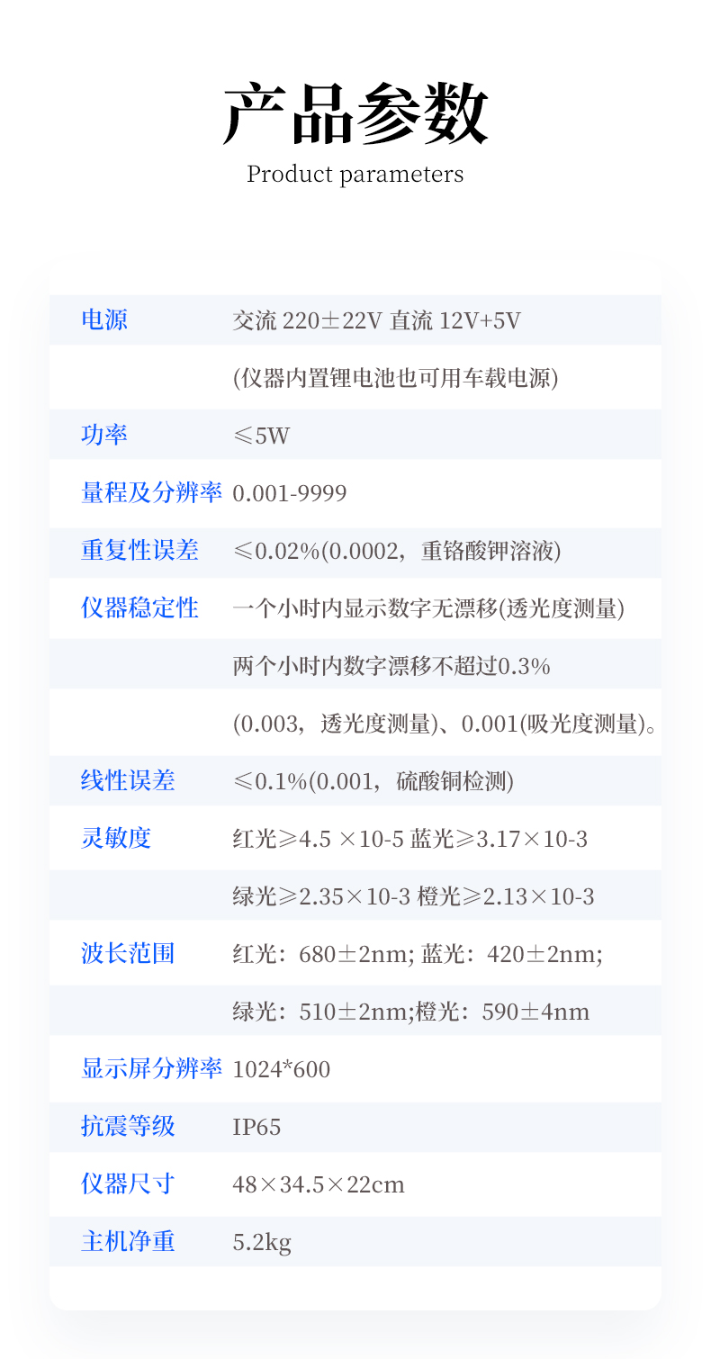 | 電源:交流 220±22V 直流 12V+5V(儀器內(nèi)置鋰電池也可用車載電源) | 功率: ≤5W | 量程及分辨率:0.001-9999 | 重復(fù)性誤差: ≤0.02%(0.0002,重鉻酸鉀溶液) | 儀器穩(wěn)定性:一個(gè)小時(shí)內(nèi)顯示數(shù)字無(wú)漂移(透光度測(cè)量);兩個(gè)小時(shí)內(nèi)數(shù)字漂移不超過(guò)0.3%(0.003,透光度測(cè)量)、0.001(吸光度測(cè)量)。 | 線性誤差: ≤0.1%(0.001,硫酸銅檢測(cè)) | 靈敏度:紅光≥4.5 ×10-5 藍(lán)光≥3.17×10-3 綠光≥2.35×10-3 橙光≥2.13×10-3 | 波長(zhǎng)范圍 :紅光:680±2nm; 藍(lán)光:420±2nm; 綠光:510±2nm;橙光:590±4nm | 顯示屏分辨率:1024*600 | 抗震等級(jí):IP65 | 儀器尺寸:48×34.5×22cm | 主機(jī)凈重:5.2kg |