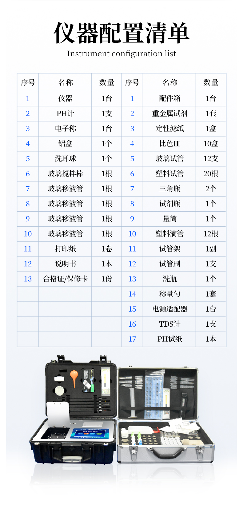 | 名稱 | 配件箱 | 重金屬試劑 | 定性濾紙 | 比色皿 | 玻璃試管 | 塑料試管 | 三角瓶 | 試劑瓶 | 量筒 | 塑料滴管 | 試管架 | 試管刷 | 洗瓶 | 稱量勺 | 電源適配器 | TDS計(jì) | PH試紙 |