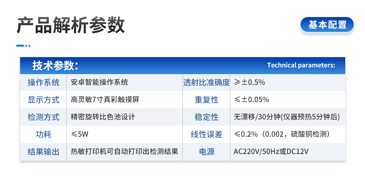 | 1.電源:交流 220±22V 直流 12V+5V(儀器內(nèi)置鋰電池也可用車載電源) | 2.功率: ≤5W | 3.量程及分辨率:0.001-9999 | 4.重復(fù)性誤差: ≤0.02%(0.0002,重鉻酸鉀溶液) | 5.儀器穩(wěn)定性:一個小時內(nèi)顯示數(shù)字無漂移(透光度測量);兩個小時內(nèi)數(shù)字漂移不超過0.3%(0.003,透光度測量)、0.001(吸光度測量)。 | 6.線性誤差: ≤0.1%(0.001,硫酸銅檢測) | 7.靈敏度:紅光≥4.5 ×10-5 藍光≥3.17×10-3 綠光≥2.35×10-3 橙光≥2.13×10-3 | 8.波長范圍 :紅光:680±2nm; 藍光:420±2nm; 綠光:510±2nm;橙光:590±4nm | 9.顯示屏分辨率:1024*600 | 10.抗震等級:IP65 | 11、儀器尺寸:48×34.5×22cm | 12、主機凈重:5.2kg |