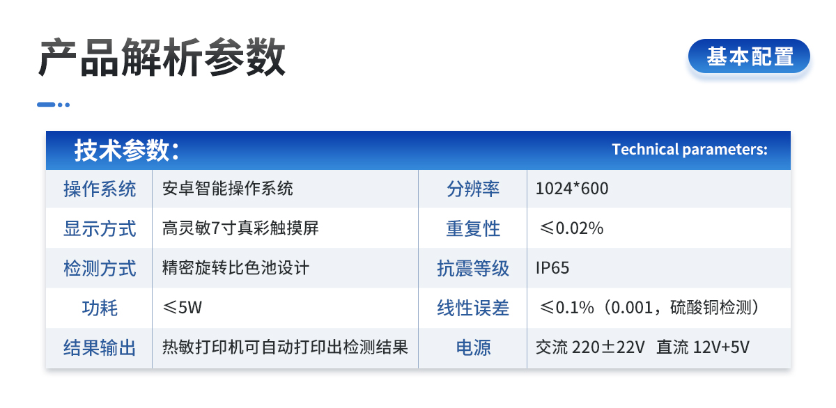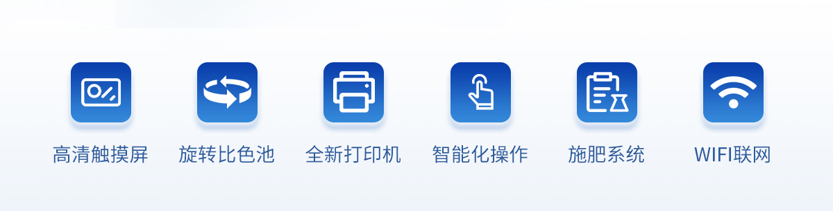 | 安卓智能操作系統(tǒng)Android 7.1版本,主控芯片采用ARM Cortex-A7,RK3288/4核處理器,主頻1.88Ghz,運轉(zhuǎn)速度更快速,穩(wěn)定性更強。 | 可檢測各種土壤、肥料、作物、食品、水質(zhì)、環(huán)境等共200多個測試項目,一機多用,功能齊全。 | 測試速度更快!無需空白對照和標準校準,省卻以往繁瑣的操作步驟,一鍵式操作,直接讀取數(shù)據(jù),**率,低消耗。 | 12個旋轉(zhuǎn)檢測通道,一次性可快速檢測12個樣品,極大提升檢測效率,降低檢測成本。 | 采用高精度濾光片技術(shù)自主**分析方法(**號:ZL 2020 2 1763837.9),**認證。 | 具有自身保護功能,內(nèi)置人臉識別攝像頭可掃臉登錄,也可設(shè)置用戶名和密碼,防止非工作人員操作查看實驗數(shù)據(jù)。 | 檢測過程中內(nèi)置校準功能,智能恒流穩(wěn)壓,光強自動校準,確保檢測準確度,取得中國計量科學研究院的《校準證書》 | 內(nèi)置傳感器航空接口,插拔方便,配備FDR傳感器、環(huán)境多要素傳感器。 | FDR傳感器為土壤三參數(shù)一體式,可同時測量土壤水分含量、土壤環(huán)境溫度、土壤電導(dǎo)率(鹽分)方便快捷。 | 環(huán)境多要素傳感器為6要素一體式,可同時測量空氣溫度、空氣濕度、露點、大氣壓力、光照度、二氧化碳。 | 儀器標配wifi無線上傳、4G聯(lián)網(wǎng)傳輸、GPRS無線遠傳,快速上傳數(shù)據(jù)。 | 配有智慧云農(nóng)業(yè)平臺,儀器連入無線網(wǎng)絡(luò)后,可將檢測數(shù)據(jù)可選擇性或批量無線上傳,方便用戶進行數(shù)據(jù)管理和長期分析。 | 儀器配同時具有USB接口、以太網(wǎng)接口,內(nèi)置大容量內(nèi)存,并可隨時用U盤拷貝數(shù)據(jù)。 | 可用手機隨時登錄云平臺在線移動查看歷史數(shù)據(jù) | 內(nèi)置作物專家施肥系統(tǒng),可對百余種全國農(nóng)業(yè)經(jīng)濟作物、果樹等的目標產(chǎn)量計算推薦施肥量,依據(jù)施肥配方科學指導(dǎo)農(nóng)業(yè)生產(chǎn)。測土配方施肥結(jié)果可打印,打印內(nèi)容包含:作物種類、肥料種類、目標產(chǎn)量、需求總量、建議施肥方案。 | 內(nèi)置植物營養(yǎng)診斷標準圖譜,根據(jù)各農(nóng)作物營養(yǎng)缺失的圖片,進行葉面對比,診斷豐缺。 | 4波長專業(yè)測試冷光源(紅、藍、綠、橙),光源波長穩(wěn)定,長時間連續(xù)工作光源無溫漂現(xiàn)象,壽命長達10萬小時級別,重現(xiàn)性好,準確度高。 | 比色池部分采用標準1cm比色皿,無機械位移及磨損,光路測試定位**,有效屏蔽外光干擾,保證檢測結(jié)果優(yōu)于國標要求。 | 儀器系統(tǒng)內(nèi)帶有樣品前處理操作視頻,各種樣品檢測方法點擊視頻模塊即可觀看,檢測人員無需自學說明書,指導(dǎo)教學方便快速,方便新手快速操作。 | 內(nèi)置新一代高速熱敏打印機(無需色帶),打印內(nèi)容包含:檢測單位、檢測人員、檢測項目、通道號、吸光度、養(yǎng)分含量(mg/kg)、檢測時間、以及二維碼等信息 | 高靈敏7寸真彩觸摸屏,采用更加**和人性化操作,高清晰高交互顯示,大程度降低傳統(tǒng)儀器的繁瑣操作和失誤,并取得多項《軟件著作權(quán)》。 | 內(nèi)置時鐘功能,方便操作時間記錄,長期歷史追溯。 | 可設(shè)置多賬戶賬號密碼登錄,**UI交互界面,不同的用戶可自由添加編輯檢測信息,保存后可長期使用。 | GPS功能:可在野外作業(yè)時記錄經(jīng)緯度地點,滿足特殊用戶需求。 | 內(nèi)置低電壓提示功能,可在檢測時明確電量,避免測試數(shù)據(jù)偏移,同時具有斷電保護功能,斷電自動保存數(shù)據(jù),防止數(shù)據(jù)丟失。 | 交直流兩用供電方式,內(nèi)置大容量充電鋰電池,滿電狀態(tài)下可連續(xù)工作10余小時,同時可外接車載電源蓄電 | 儀器具有中英文切換功能,可滿足出口要求。 | 高強度PVC工程塑料手提箱設(shè)計,堅固耐用,便于攜帶。 |