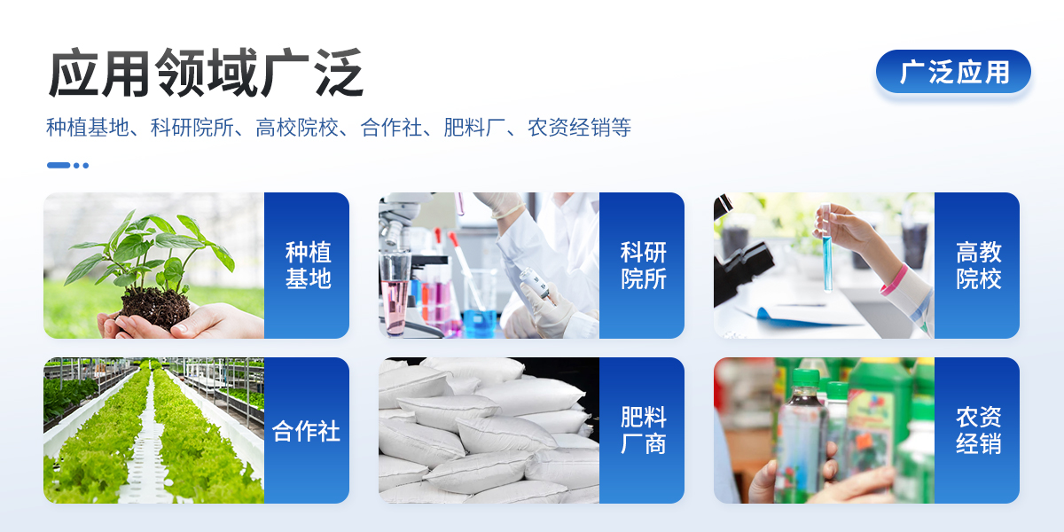 | 土壤養(yǎng)分:●土壤銨態(tài)氮、土壤有效磷、土壤速效鉀、土壤硝態(tài)氮、土壤堿解氮、土壤全氮、土壤全磷、土壤全鉀、土壤有機質(zhì)(丘林法)、土壤有機質(zhì)(浸提法)、PH值、含鹽量、水分?!裢寥乐形⒘吭兀和寥棱}、土壤鎂、土壤硫、土壤硅、土壤硼、土壤鐵、土壤銅、土壤錳、土壤鋅、土壤氯;●土壤重金屬:土壤鉛、土壤砷、土壤鎘、土壤鉻、土壤汞。 | 環(huán)境:土壤濕度、土壤溫度、土壤電導(dǎo)率、空氣溫度、空氣濕度、露點、大氣壓力、光照度、二氧化碳; | 肥料養(yǎng)分:●單質(zhì)肥:氮肥中銨態(tài)氮、肥料硝態(tài)氮、尿素氮、縮二脲、磷肥中磷、磷肥中水溶性磷、鉀肥中鉀;●復(fù)合肥全氮、復(fù)合肥全磷、復(fù)合肥全鉀;●有機肥全氮、有機肥全磷、有機肥全鉀、有機肥硝態(tài)氮、有機肥速效磷、有機肥速效鉀、有機肥酸解氮、有機質(zhì);●水溶性腐植酸(風化煤)、水溶性腐植酸(褐煤)、水溶性腐植酸(泥炭)、游離態(tài)腐植酸(風化煤)、游離態(tài)腐植酸(褐煤)、游離態(tài)腐植酸(泥炭);●水溶肥全氮、水溶肥全磷、水溶肥全鉀;●葉面肥全氮、葉面肥全磷、葉面肥全鉀;●各種肥料微量元素:肥料鈣、肥料鎂、肥料硫、肥料硅、肥料硼、肥料鐵、肥料銅、肥料錳、肥料鋅、肥料氯;●肥料重金屬:肥料鉛、肥料砷、肥料鎘、肥料鉻、肥料汞。 | 鮮作物營養(yǎng):●作物硝態(tài)氮、作物銨態(tài)氮、作物磷、作物鉀;●作物中微量元素:作物鈣、作物鎂、作物硫、作物硅、作物硼、作物鐵、作物銅、作物錳、作物鋅、作物氯;●作物中硝酸鹽、亞硝酸鹽、總糖量、還原糖、蛋白質(zhì)。 | 干植株營養(yǎng):●植株全氮、植株全磷、全鉀、植株中微量元素:植株全鈣、植株全鎂、植株全硫、植株全鐵、植株全錳、植株全硼、植株全鋅、植株全銅、植株全氯、植株全硅。 | 煙葉營養(yǎng):●全氮、全磷、全鉀、還原糖、水溶性總糖、硼、錳、鐵、銅、鈣、鎂等20項。 | 食品(水果、蔬菜等):●農(nóng)藥殘留、硝酸鹽、亞硝酸鹽、鉛、砷、鎘、鉻、汞、銅、鋁、二氧化硫、雙氧水、苯甲酸鈉、山梨酸、糖精鈉、甜蜜素、硫酸鎂、甲醛、吊白塊、硼砂、溴酸鉀、總酸、色素、蛋白質(zhì)、葡萄糖、淀粉酶等項。 | 水質(zhì)中:COD、氨氮、總磷、總氮、余氯、溶解氧、二氧化氯、水中氰化物;重金屬鉛、砷、鎘、鉻、汞;水中硝酸鹽、亞硝酸鹽、硬度、PH、鐵、銅、錳、鋅、鋁、硼、氯、硫、硅等 |