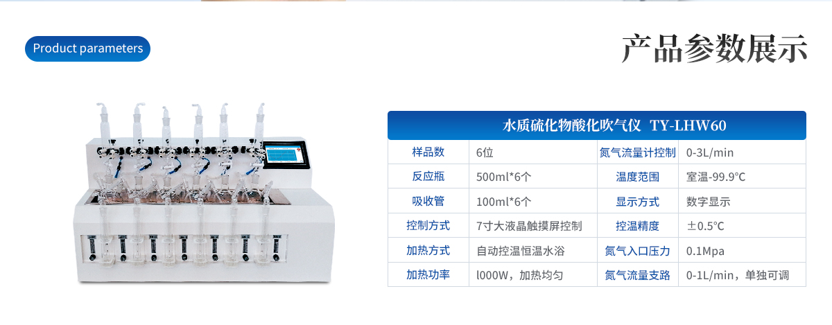 水樣中的硫化物經(jīng)酸化,生成的硫化氫隨載氣(氮?dú)猓┻M(jìn)入吸收瓶/吸收顯色管中被吸收溶液(乙酸鋅-乙酸鈉溶液或2%氫氧化鈉溶液)吸收,選擇相應(yīng)的分析方法對吸收瓶/吸收顯色管中吸收的硫離子進(jìn)行分析測定。硫化物吹氣儀根據(jù)2022年新國標(biāo)水質(zhì)硫化物的測定-亞甲基藍(lán)分光光度法(典量法)標(biāo)準(zhǔn)開發(fā)生產(chǎn)的。水質(zhì)硫化物測定的樣品前處理需要。