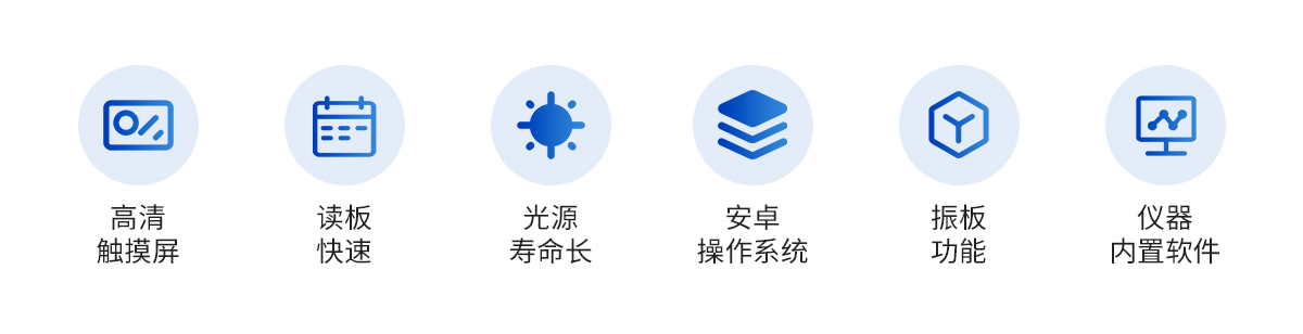 | 1. 高清觸摸屏: 顯示使用7英寸彩色觸摸屏,分辨率為1280*800像素。 | 2.內(nèi)置軟件: 內(nèi)置軟件可提供儀器的控制和數(shù)據(jù)分析,可直接外接U盤。 | 3. 光源壽命長(zhǎng): 光源采用6V10W鹵素?zé)?,壽命可達(dá)2000h。 | 4. 讀板快速: 采用單波長(zhǎng),雙波長(zhǎng)檢測(cè)讀板快速。 | 5. 振板功能: 根據(jù)使用配置了振板功能,可根據(jù)使用設(shè)置振板時(shí)間和速度。 | 6. 操作系統(tǒng): 配備自主研發(fā)的安卓操作系統(tǒng)可單機(jī)獨(dú)立使用,同時(shí)配置多種數(shù)據(jù) 輸出接口,方便不同的數(shù) 據(jù)傳輸和處理。 | 7. 可視化布板: 并采用可視化布板方式輸出測(cè)試結(jié)果。 | 8. 設(shè)置吸光度范圍:0~4.000Abs,滿足不同測(cè)量要求,并配備了8組濾光片輪,標(biāo)配4組濾光片,根據(jù)使用 可選配340 nm~750nm波長(zhǎng)的濾光片組合使用。設(shè)計(jì)合理無(wú)需打 開機(jī)蓋就可更換光源和濾光片。 | 9.檢測(cè)數(shù)據(jù):使用自動(dòng)校準(zhǔn)、定位系統(tǒng)算法使檢測(cè)數(shù)據(jù)更精準(zhǔn)、可靠。 | 10. 配置對(duì)光路: 配置對(duì)光路,機(jī)械運(yùn)動(dòng)等進(jìn)行自檢和診斷校對(duì)功能。 |