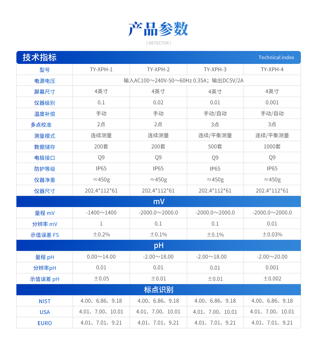 | 1.支持IP65防護(hù)等級(jí)。 | 2.支持自動(dòng)識(shí)別NIST、USA、EURO*多三點(diǎn)標(biāo)定功能。 | 3.支持背光和恢復(fù)出廠、手動(dòng)溫補(bǔ)、連續(xù)測(cè)量模式功能。 | 4.顯示標(biāo)定、測(cè)量和數(shù)據(jù)穩(wěn)定符號(hào)及溫度、電極斜率數(shù)據(jù)。 | 5.支持?jǐn)?shù)據(jù)儲(chǔ)存、查閱、刪除功能。 |